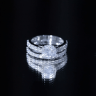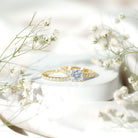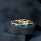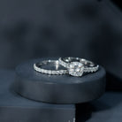 Celebrate your love story with a shining symbol of eternity - this beautiful Moissanite Bridal Ring Set. Made to make every moment memorable, this 2 Piece Ring Set combines classic elegance with careful craftsmanship. The highlight of the Wedding Ring Set is a Solitaire Engagement Ring, featuring a stunning 8 MM cushion cut moissanite in a prong setting, along with round cut side stones. A hidden stone adds a touch of charm and shows that small details can have a big effect. Perfectly matched with the engagement ring is a Half Eternity Wedding Band, decorated with sparkling round moissanite stones that enhance the brilliance of the center gem while adding their own gentle shine. Together, the rings form a cohesive Moissanite Wedding Ring Set that is just as beautiful when worn together as they are separately. Made with precision, this Moissanite Engagement Ring and Wedding Band Set combines strength, beauty, and eco-friendly elegance. Presented in a luxurious signature jewelry box, it is ready to be given as a gift, cherished, and admired.