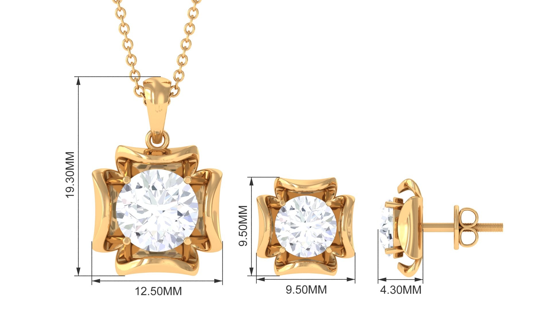 This Solitaire Jewelry Set is an elegant and timeless choice for any occasion. The set includes a stunning pendant necklace and matching earrings, each featuring a Round Moissanite stone in prong setting. This Jewelry Set is crafted with gold metal to give a luxurious look.