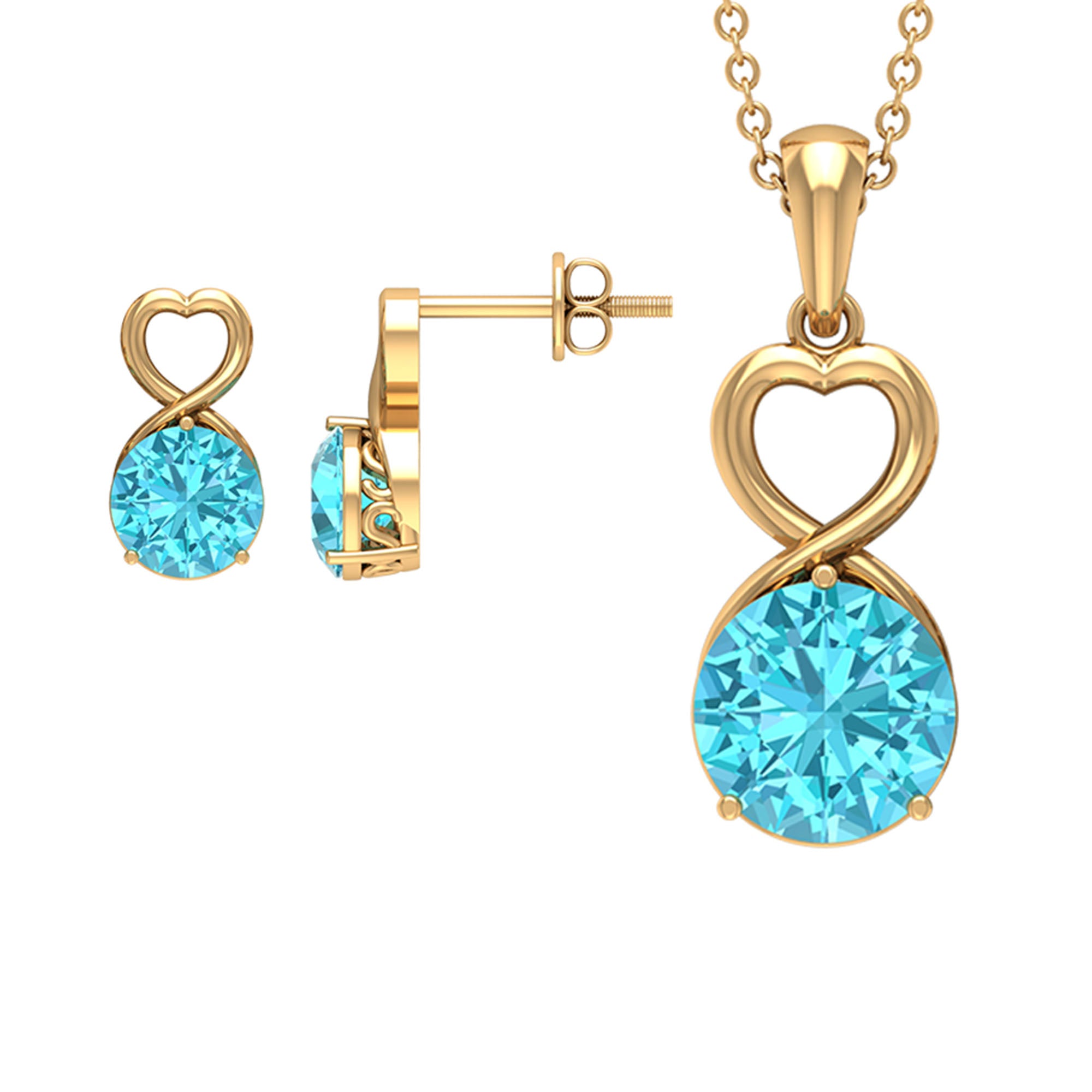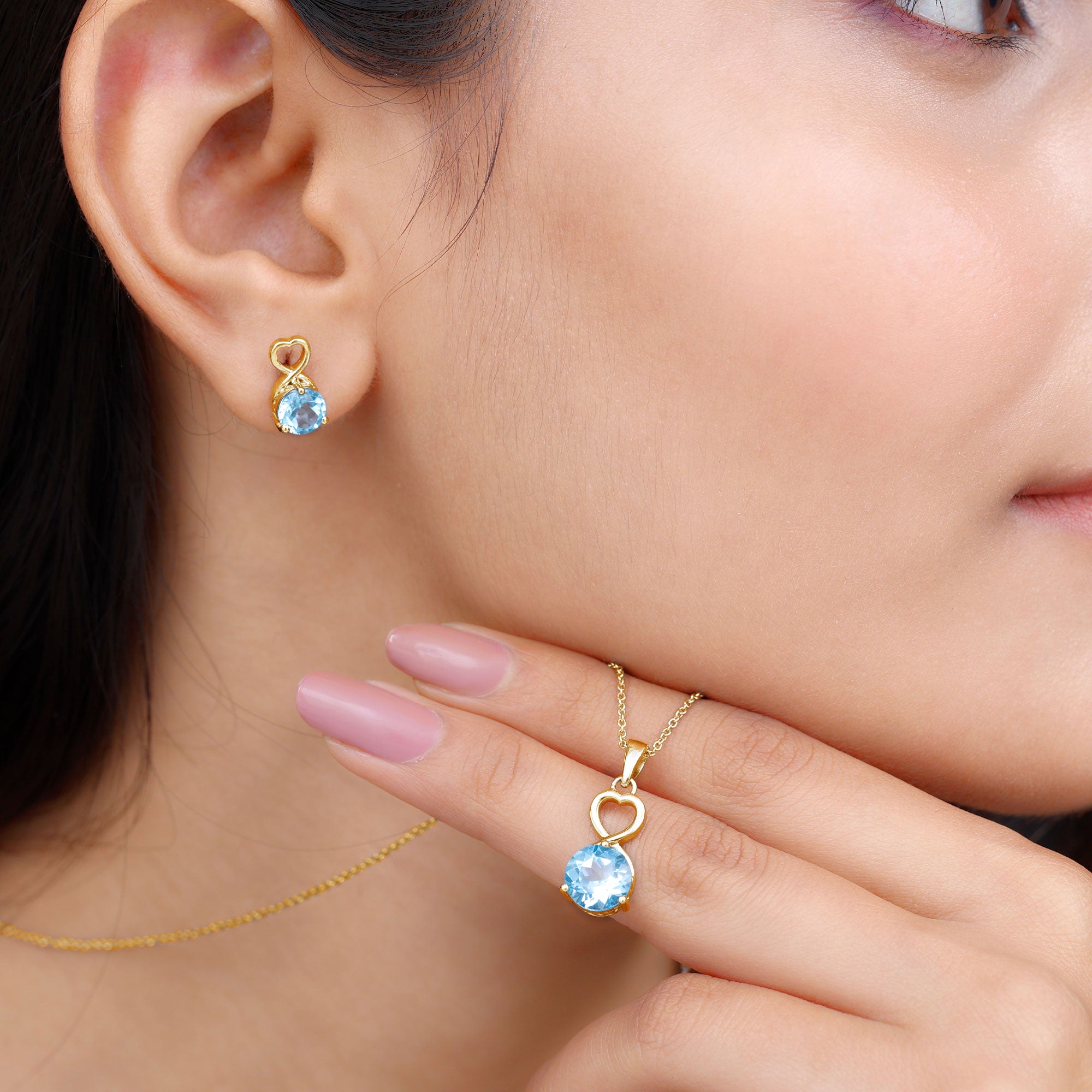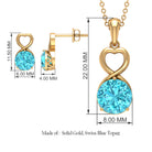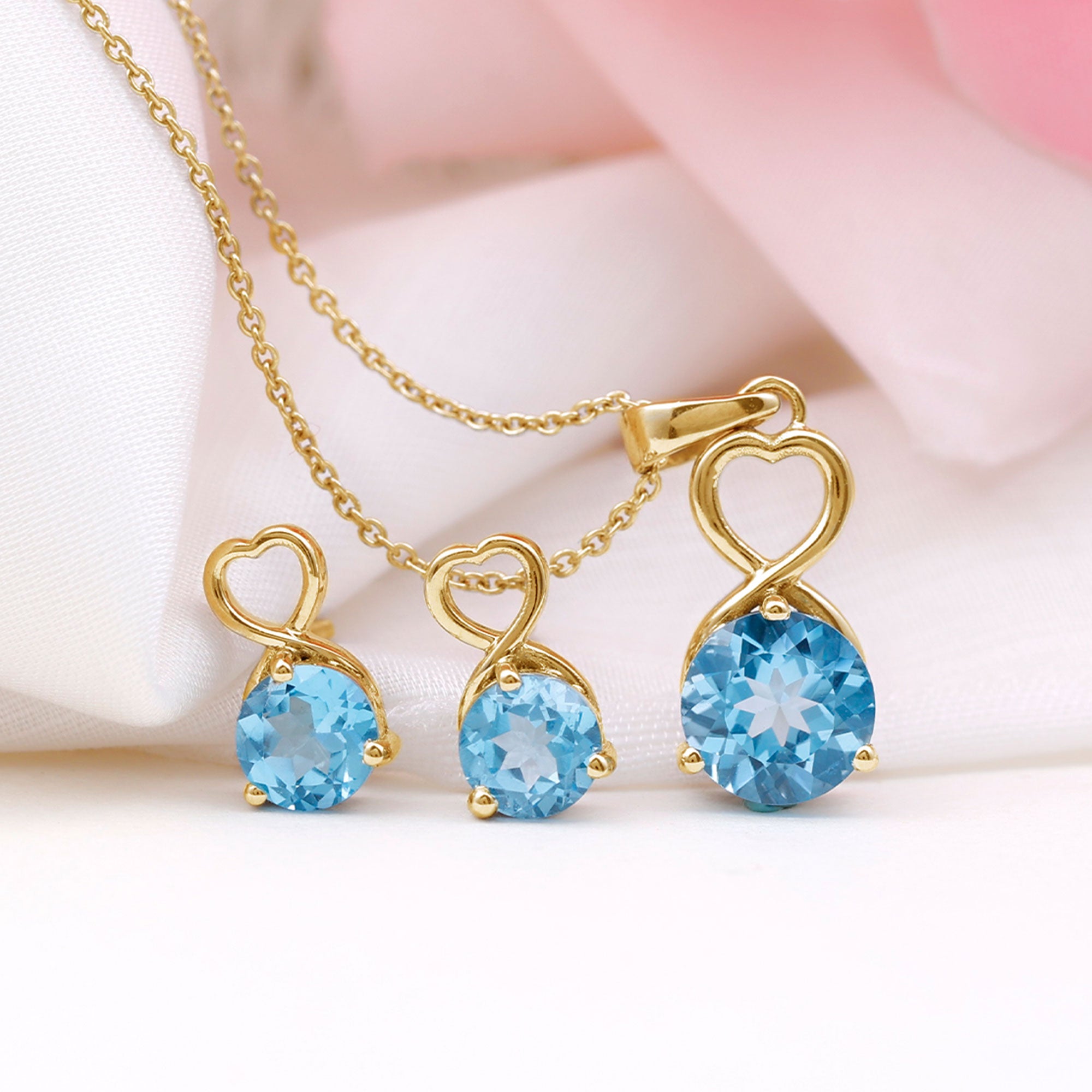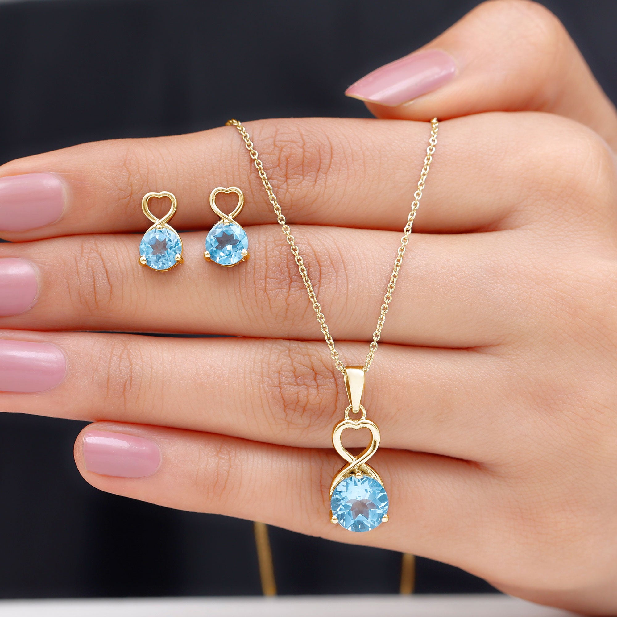 Dont hesitate to pursue what your heart desires and stand out from the crowd with this stunning Heart-Shaped Jewelry Set that will make you feel like a superstar. Adorned with Round Cut Swiss Blue Topaz stones set in a Prong Setting and crafted in Gold Metal, this jewelry set is simply gorgeous. Youll absolutely love it!