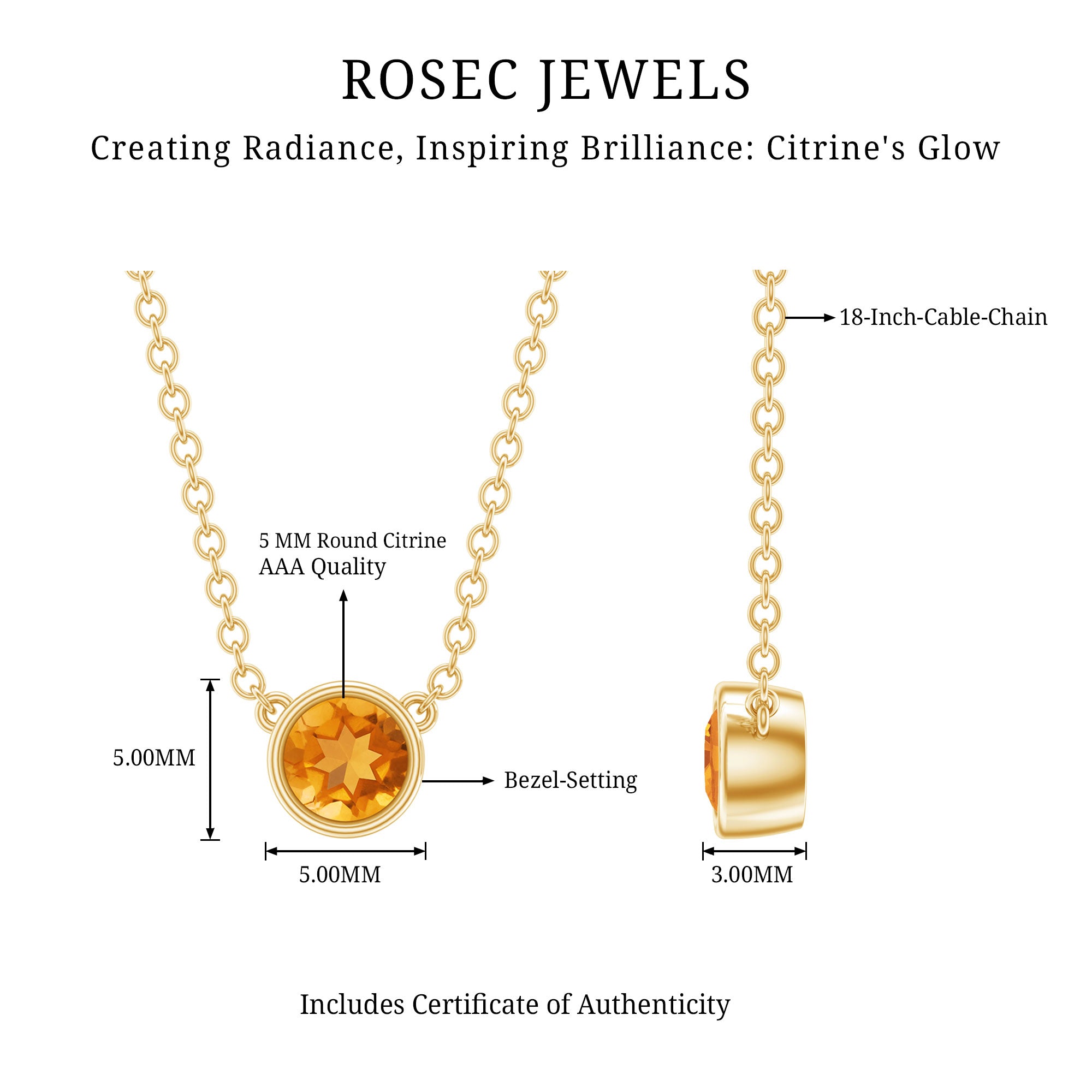 Radiate warmth and elegance with this Solitaire Pendant Necklace. The 5 MM Round Shape Citrine in Bezel Setting, with its yellow hue, adds a touch of optimism and sophistication to any ensemble. Elevate your style and embrace the bright side of life with this timeless and enchanting necklace.