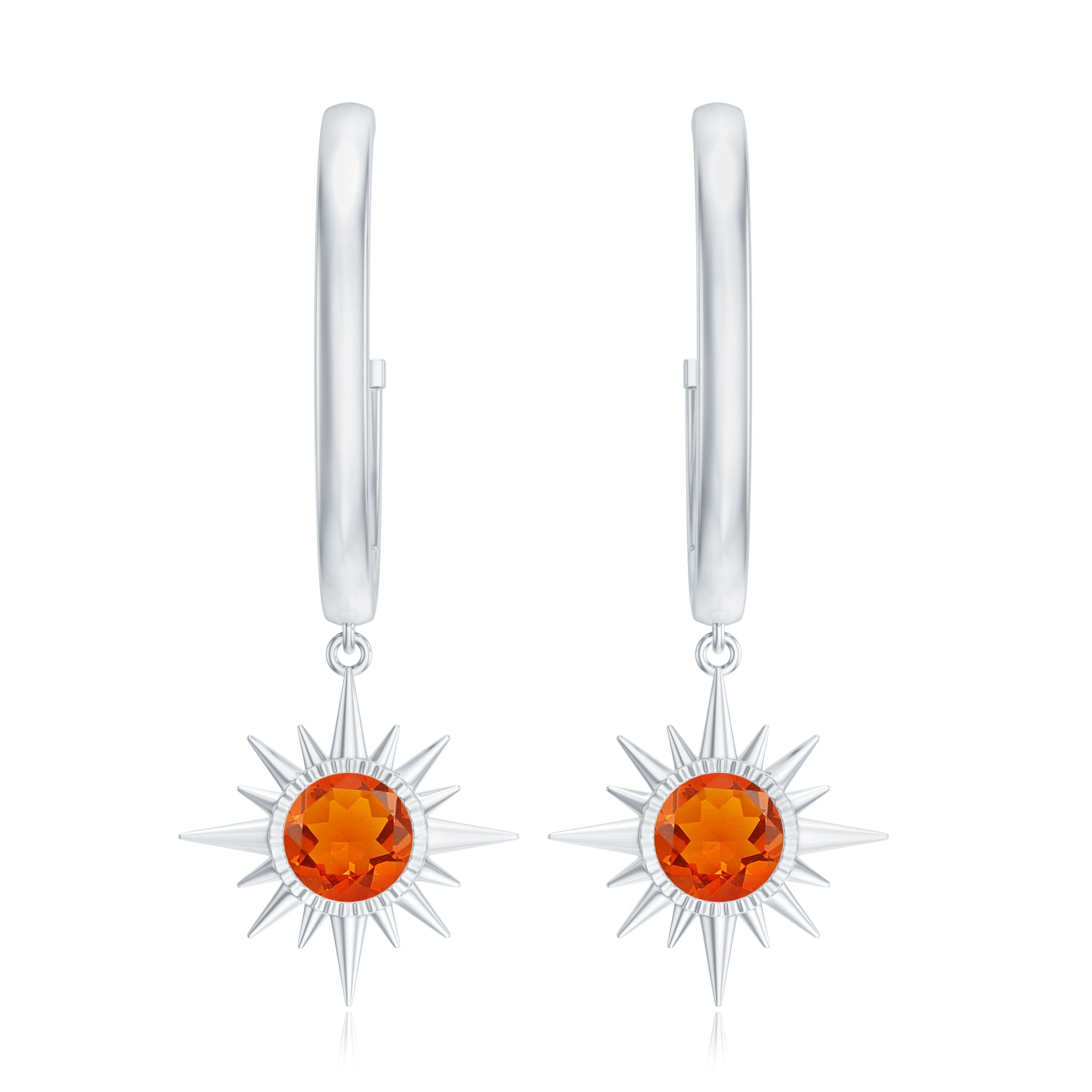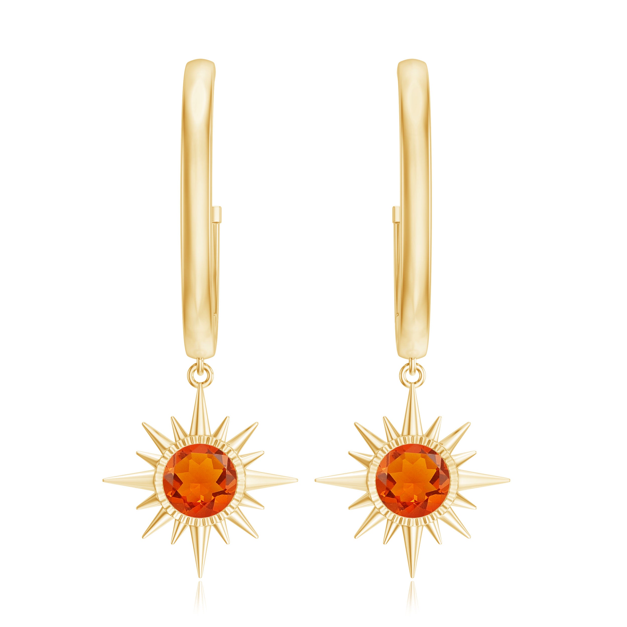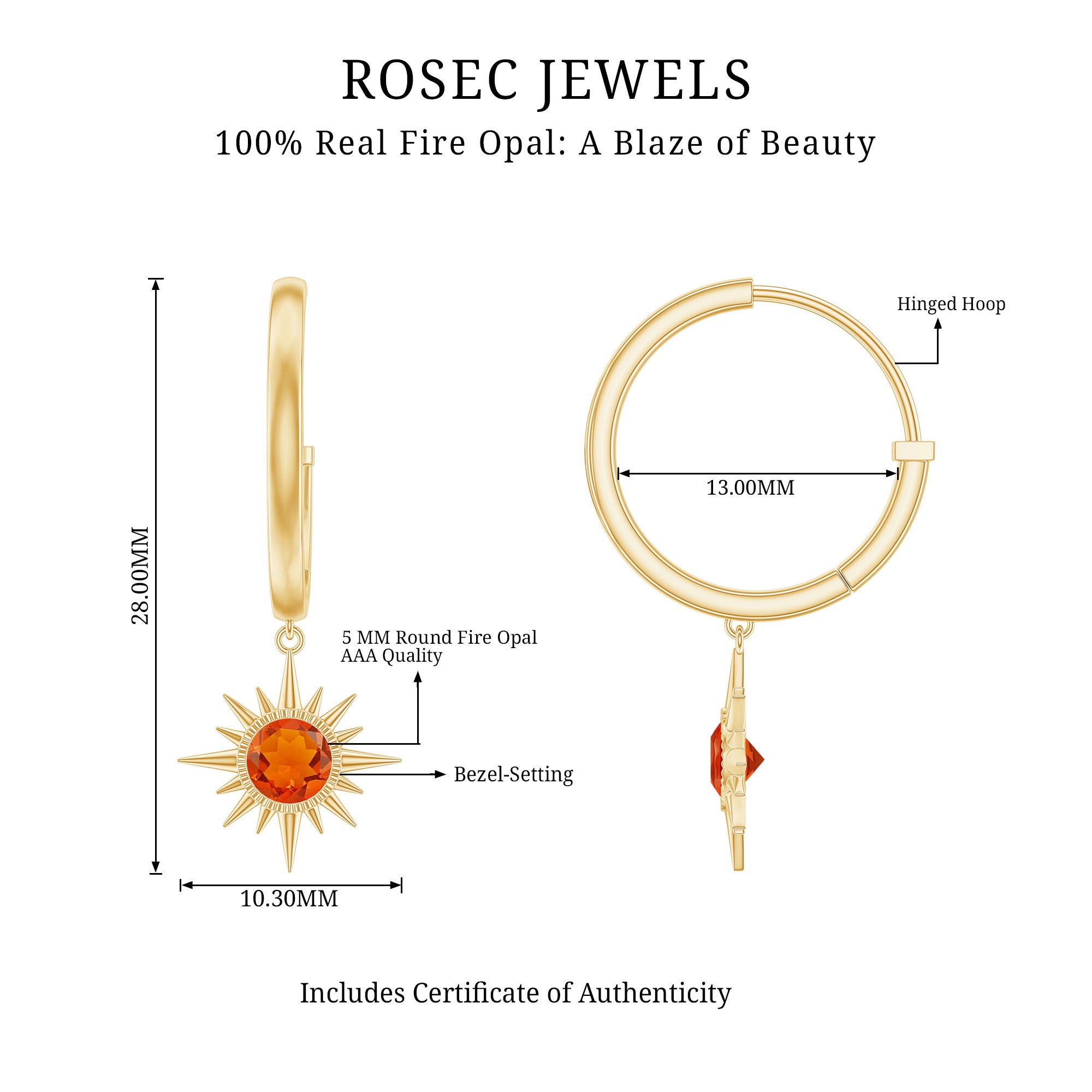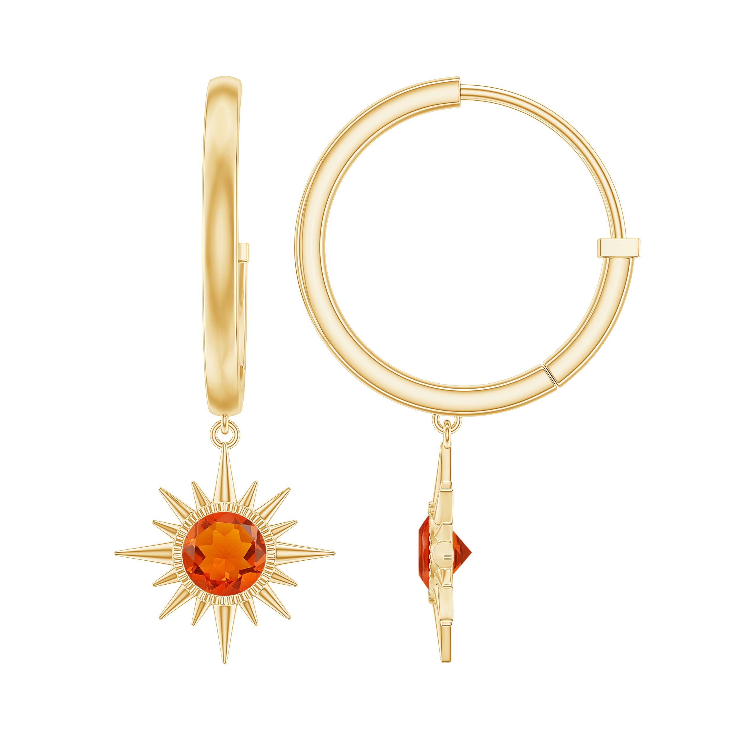Bring a burst of radiant energy to your look with these Sunburst Earrings, crafted to shine with warmth. Each earring features a vibrant 5 mm Round Shape Fire Opal at the center of a stunning sunburst design, creating a glowing focal point that feels both bold and beautifully artistic. The fiery hues catch the light with every move, giving you a captivating sparkle that feels fresh and full of life. The Hinged Hoop Closure adds comfort and ease, allowing the earrings to sway gently while staying securely in place. Presented in an elegant jewelry box, these Fire Opal Earrings make a wonderful gift for birthdays, anniversaries or anyone who loves jewelry with a playful yet refined aesthetic. These Hinged Hoop Earrings pair effortlessly with everyday outfits or evening wear when you want to add a glowing, sun inspired touch. Chic and full of warm color, these Opal Drop Earrings are designed to brighten your style, no matter the occasion.