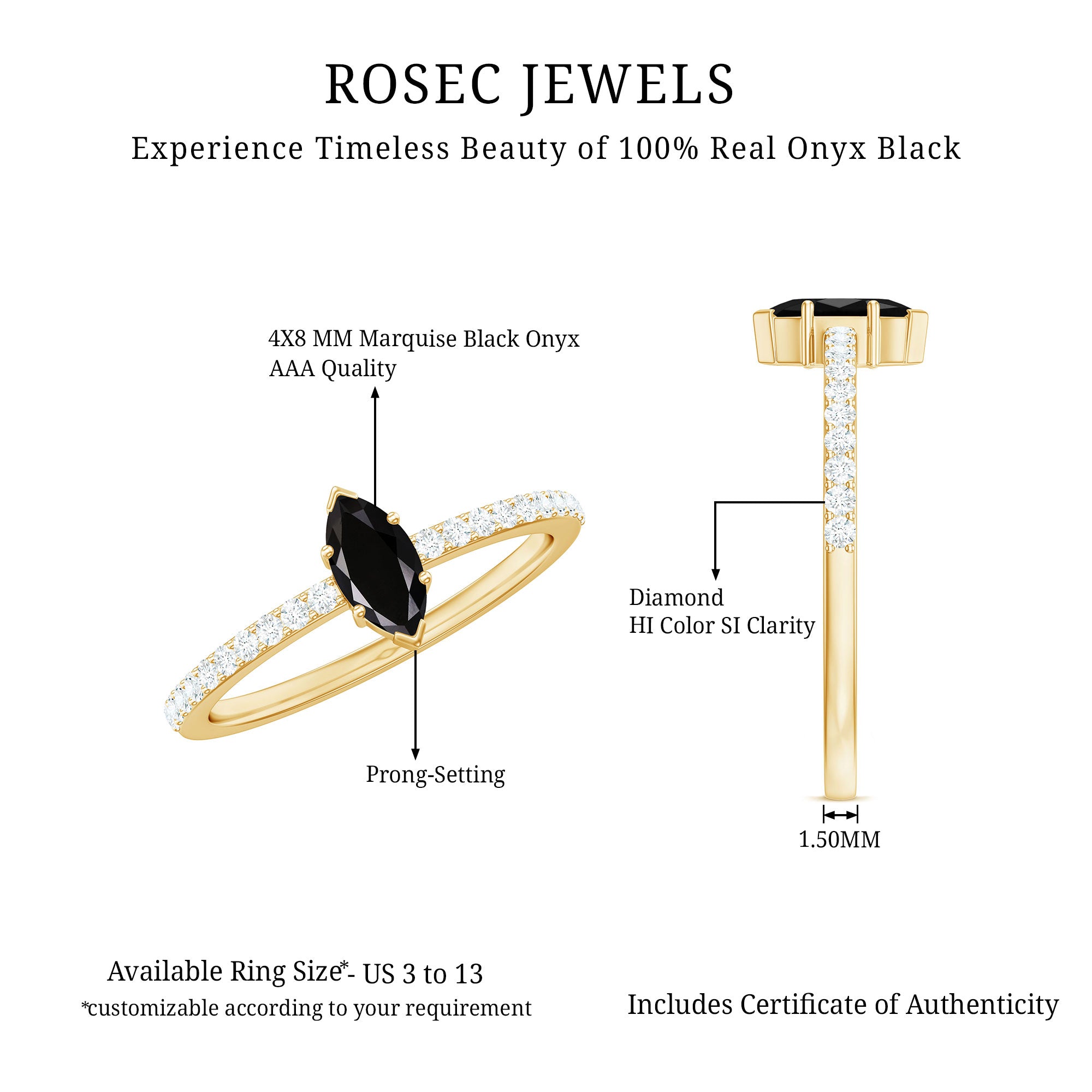 Convey your emotions without saying a word with this exquisite Onyx Promise Ring, a timeless emblem of love and dedication. At the heart of this beautiful Commitment Ring lies a 4X8 MM marquise cut Black Onyx, gracefully held in a V-prong setting that accentuates the gem and allows it to radiate with unmatched brilliance. The band features a subtle trail of small Diamond stones along the shank, adding a soft sparkle that twinkles with every movement. Their refined arrangement imparts a sophisticated allure to the design, achieving the perfect harmony between simplicity and elegance. This Black Onyx Solitaire Ring is ideal for marking a significant promise, celebrating a milestone, or simply conveying your devotion in a sincere way. Designed for everyday comfort and enduring beauty, this Solitaire Promise Ring for Her is available in US sizes 3 to 13 to ensure a perfect fit. Whether you are orchestrating a heartfelt surprise or a tranquil, intimate moment, this Marquise Cut Ring comes thoughtfully packaged in a beautiful jewelry box, ready to be treasured from the moment it is revealed.