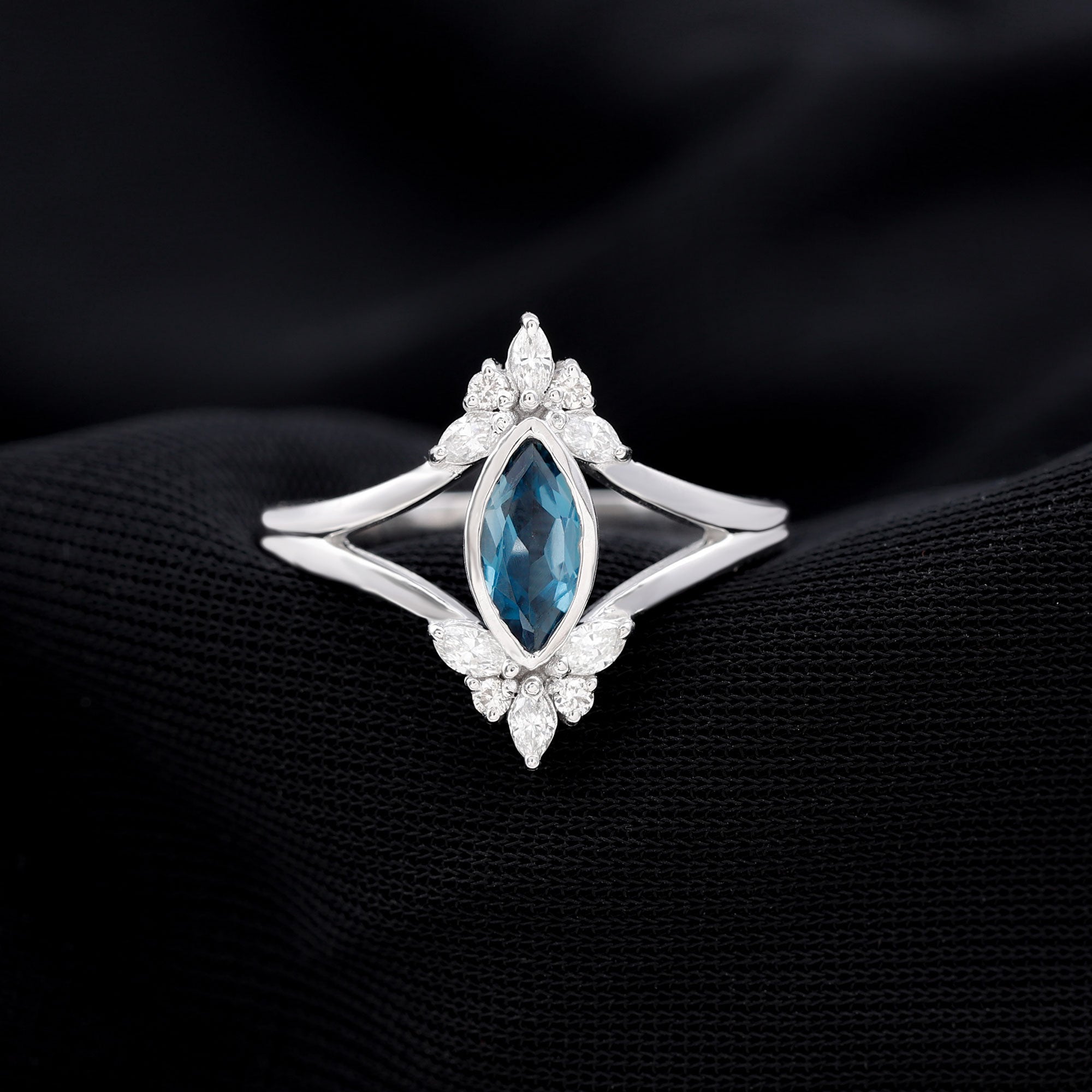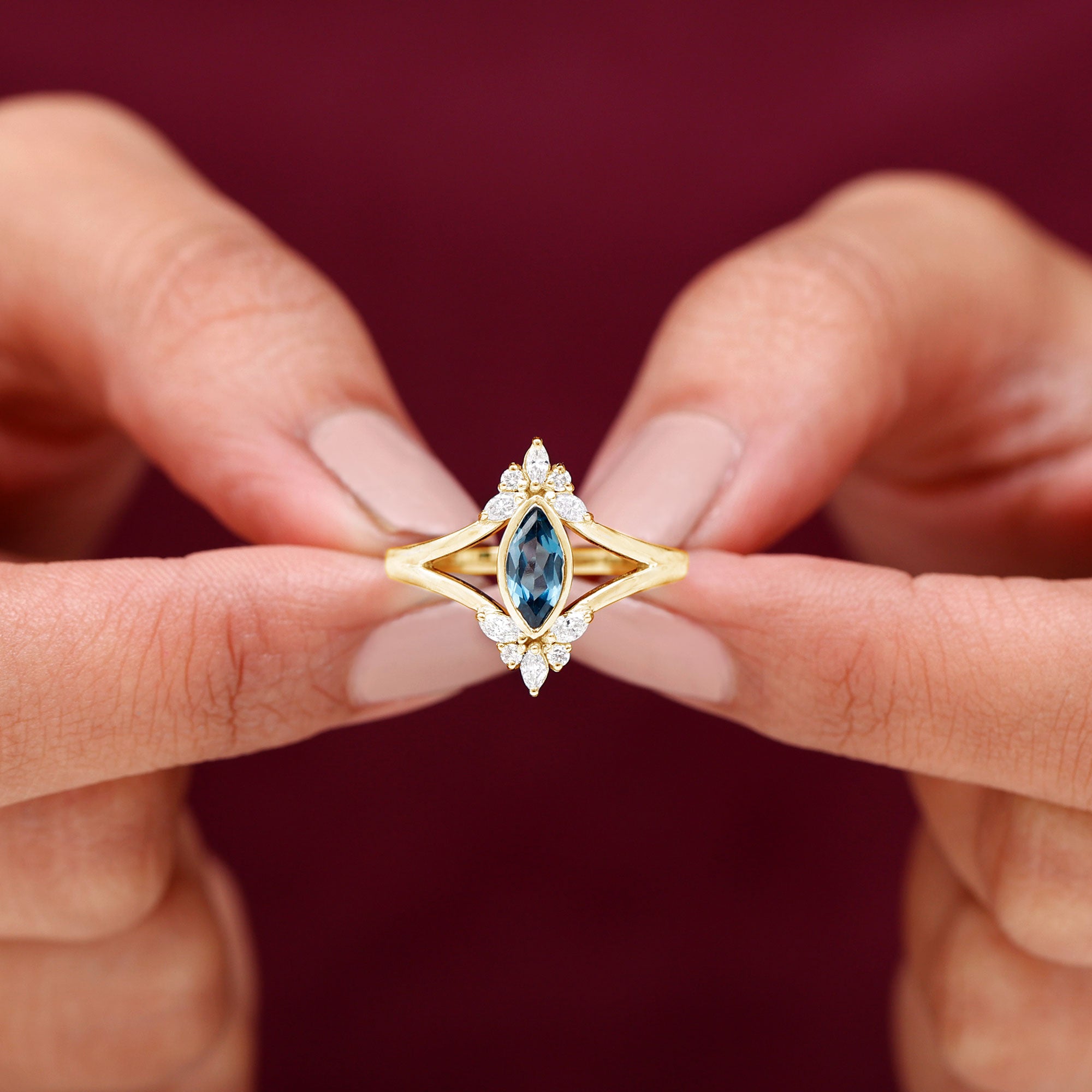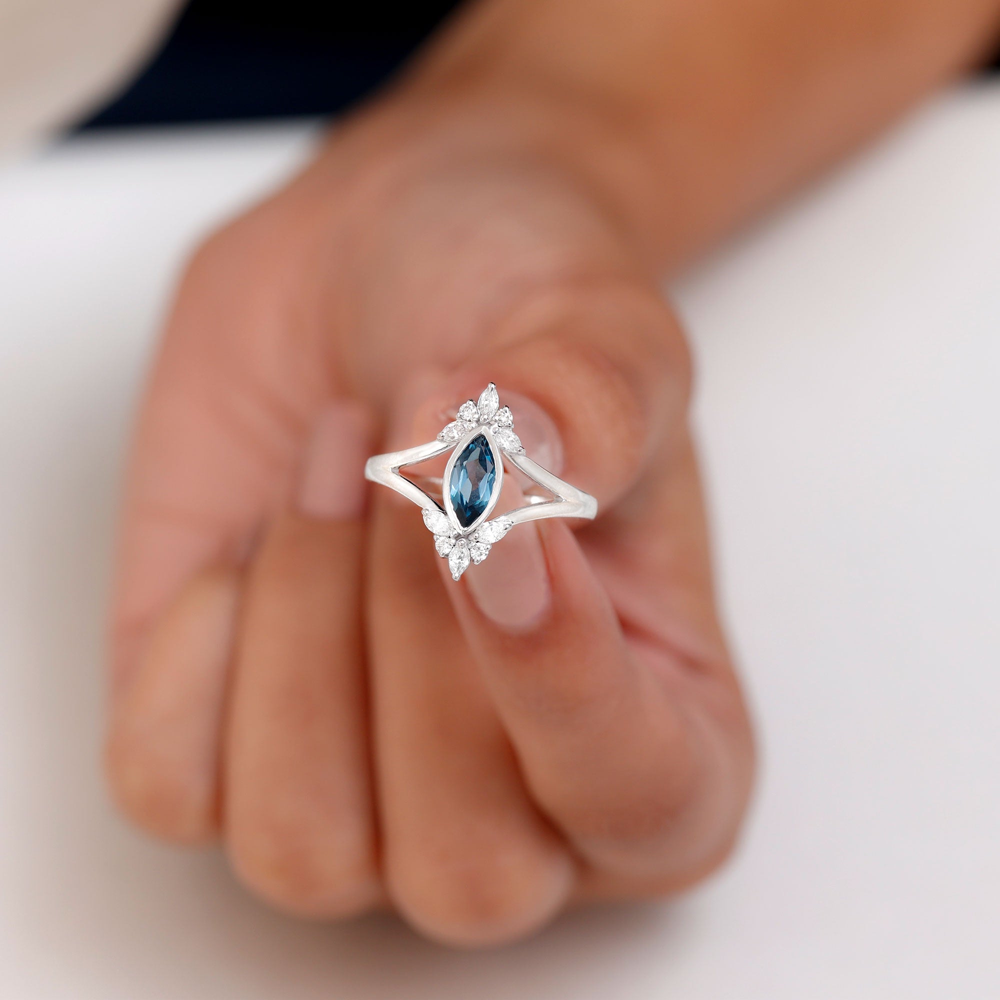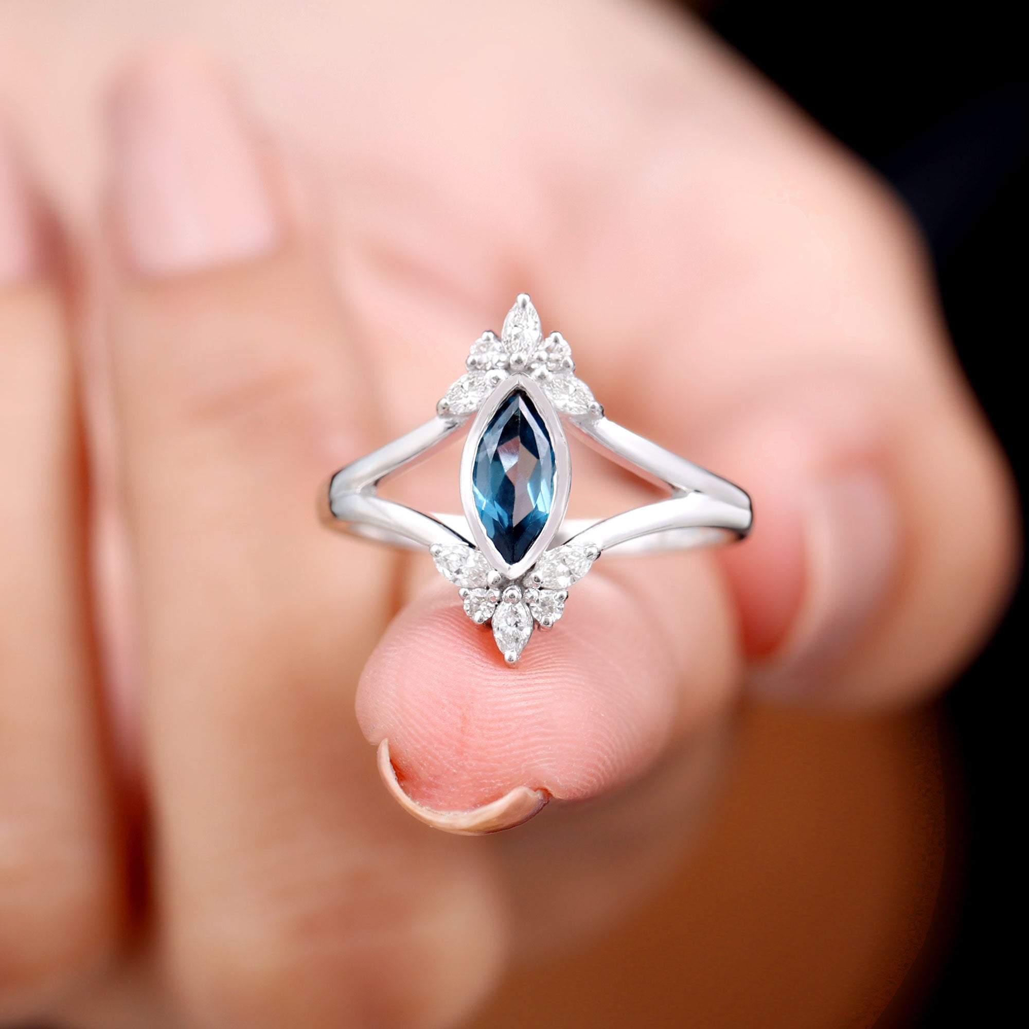 A striking design harmonizes with powerful elegance in this bold Blue Topaz Cocktail Ring. The centerpiece features a 4X8 MM marquise cut london blue topaz, meticulously set to create an elongated silhouette on the finger. Upside and downside of the center stone marquise and round shape diamond set, which enhance the look of the ring. Blue Topaz gemstone is secured by a reliable bezel setting, allowing their deep hue to take center stage. Introducing a contemporary twist, the split shank gracefully divides into two bands, imparting an open and airy aesthetic to the design. Crafted from AAA quality london blue topaz, this Split Shank Engagement Ring presents a bold style that appeals to those who value jewelry with character. Whether selected as an engagement ring or worn as a statement piece, it draws attention with its distinctive shape and assertive allure. Ideal for special occasions or when you wish to infuse a touch of drama into your outfit, this London Blue Topaz Ring for Women merges classic gemstones with contemporary design elements. It is an excellent choice for anyone in search of a piece that is meaningful, fashionable, and unforgettable. Embrace your boldness and individuality with this striking Cocktail Engagement Ring, a representation of strength and beauty that distinguishes itself from the ordinary.