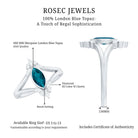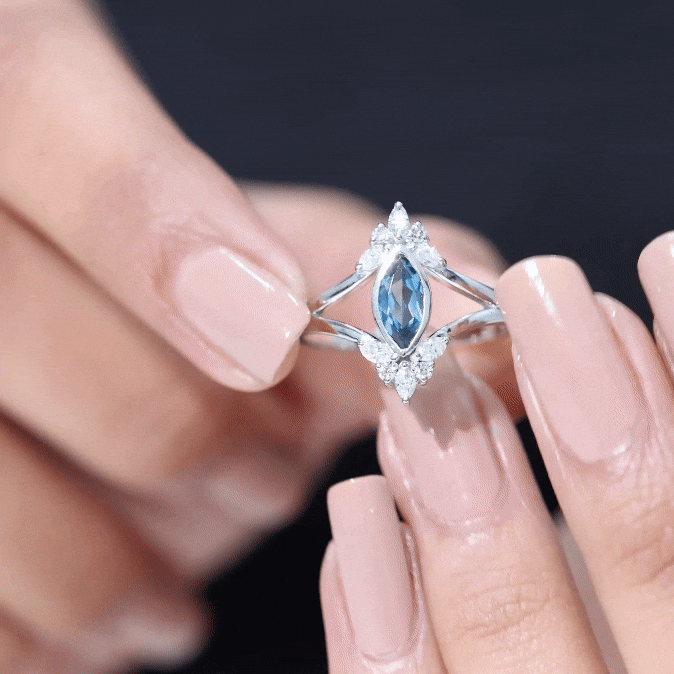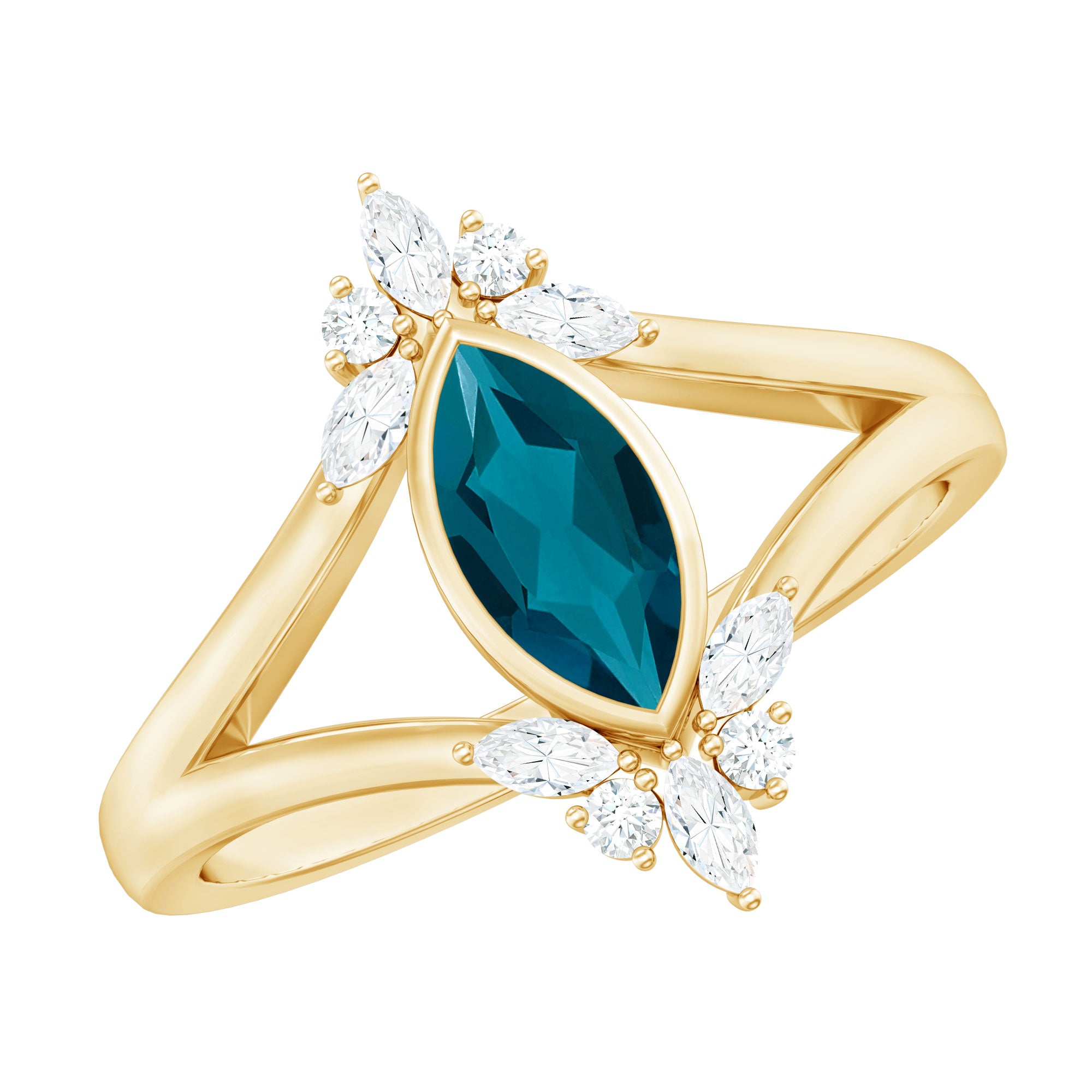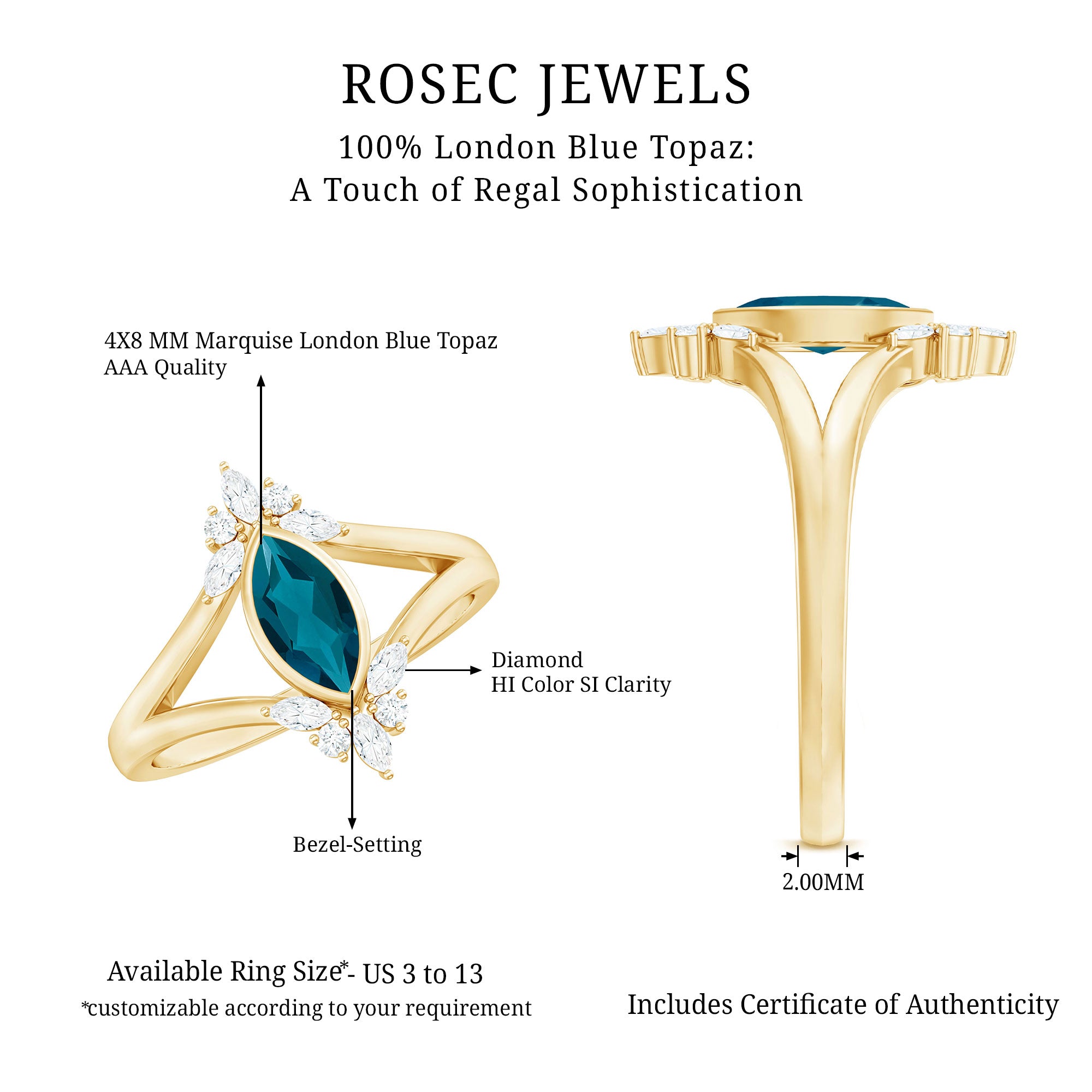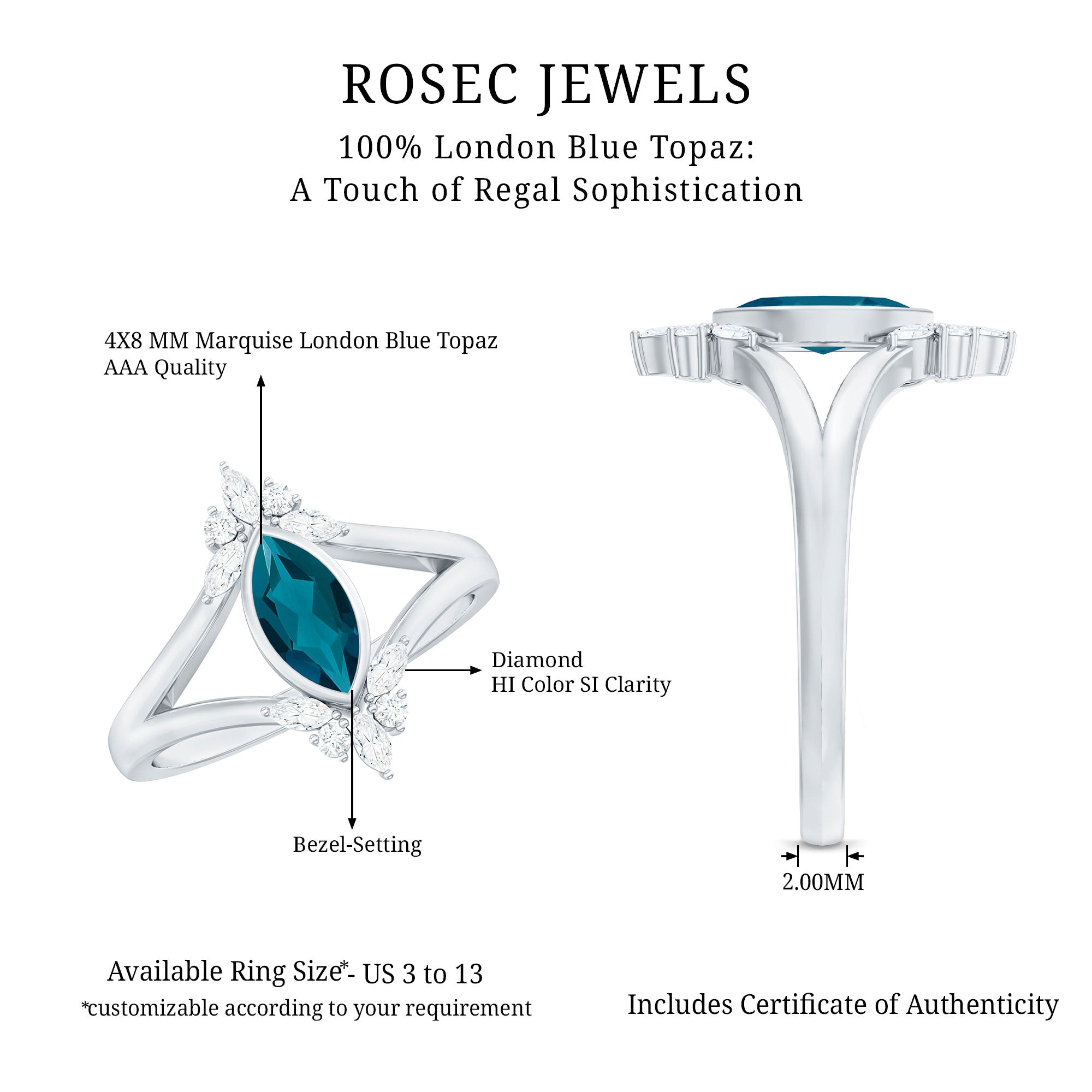 A striking design harmonizes with powerful elegance in this bold Blue Topaz Cocktail Ring. The centerpiece features a 4X8 MM marquise cut london blue topaz, meticulously set to create an elongated silhouette on the finger. Upside and downside of the center stone marquise and round shape diamond set, which enhance the look of the ring. Blue Topaz gemstone is secured by a reliable bezel setting, allowing their deep hue to take center stage. Introducing a contemporary twist, the split shank gracefully divides into two bands, imparting an open and airy aesthetic to the design. Crafted from AAA quality london blue topaz, this Split Shank Engagement Ring presents a bold style that appeals to those who value jewelry with character. Whether selected as an engagement ring or worn as a statement piece, it draws attention with its distinctive shape and assertive allure. Ideal for special occasions or when you wish to infuse a touch of drama into your outfit, this London Blue Topaz Ring for Women merges classic gemstones with contemporary design elements. It is an excellent choice for anyone in search of a piece that is meaningful, fashionable, and unforgettable. Embrace your boldness and individuality with this striking Cocktail Engagement Ring, a representation of strength and beauty that distinguishes itself from the ordinary.