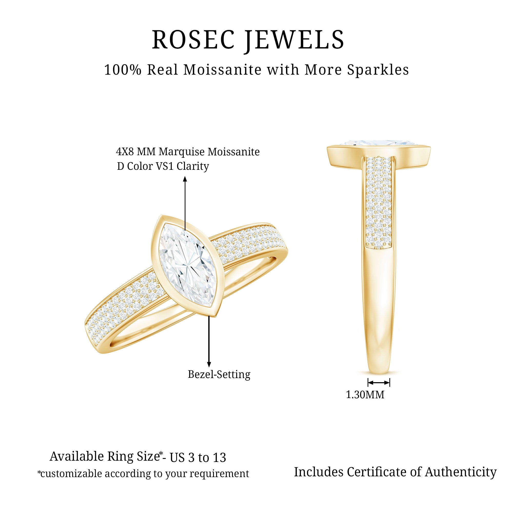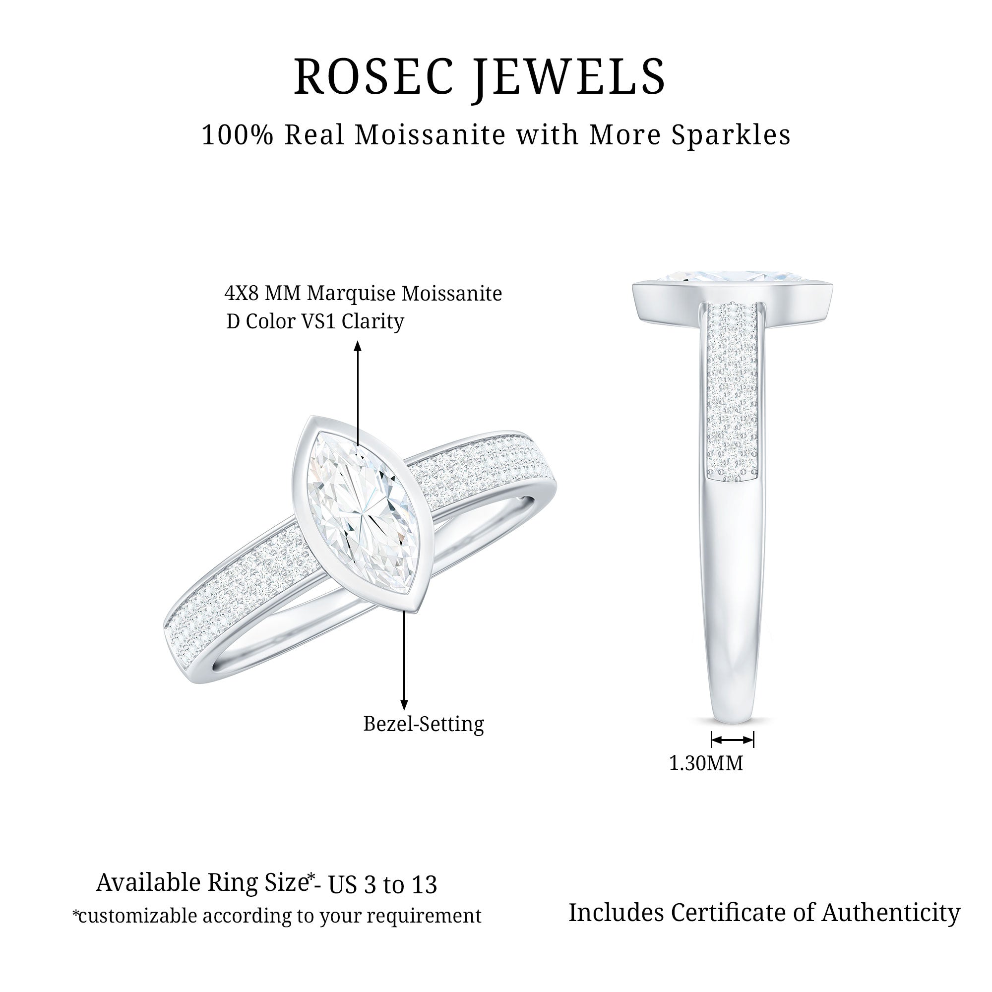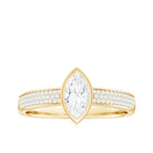 Reveal your romantic journey with this enchanting Marquise Moissanite Engagement Ring. Crafted for the bride who appreciates the beauty of tradition and the elegance found in intricate details, this stunning piece harmoniously combines vintage charm with contemporary artistry. At the core of the Bezel Engagement Ring lies a brilliant 4X8 MM marquise cut Moissanite, skillfully faceted to reflect light from every direction. The central stone emanates brilliance, representing clarity, strength, and a love that endures through time. Petite round shape Moissanites set on both side of the center stone in a three row style, add a touch of brilliance and timeless elegance to the Moissanite Engagement Ring. What truly distinguishes this Marquise Engagement Ring is its unique band. This Moissanite Ring represents a perfect fusion of traditional and modern design. Whether it signifies a proposal or a personal achievement, it serves as a significant keepsake designed to be cherished for generations. Rosec Jewels guarantees that our dazzling jewelry pieces will capture attention, as they are authentically certified for your peace of mind.