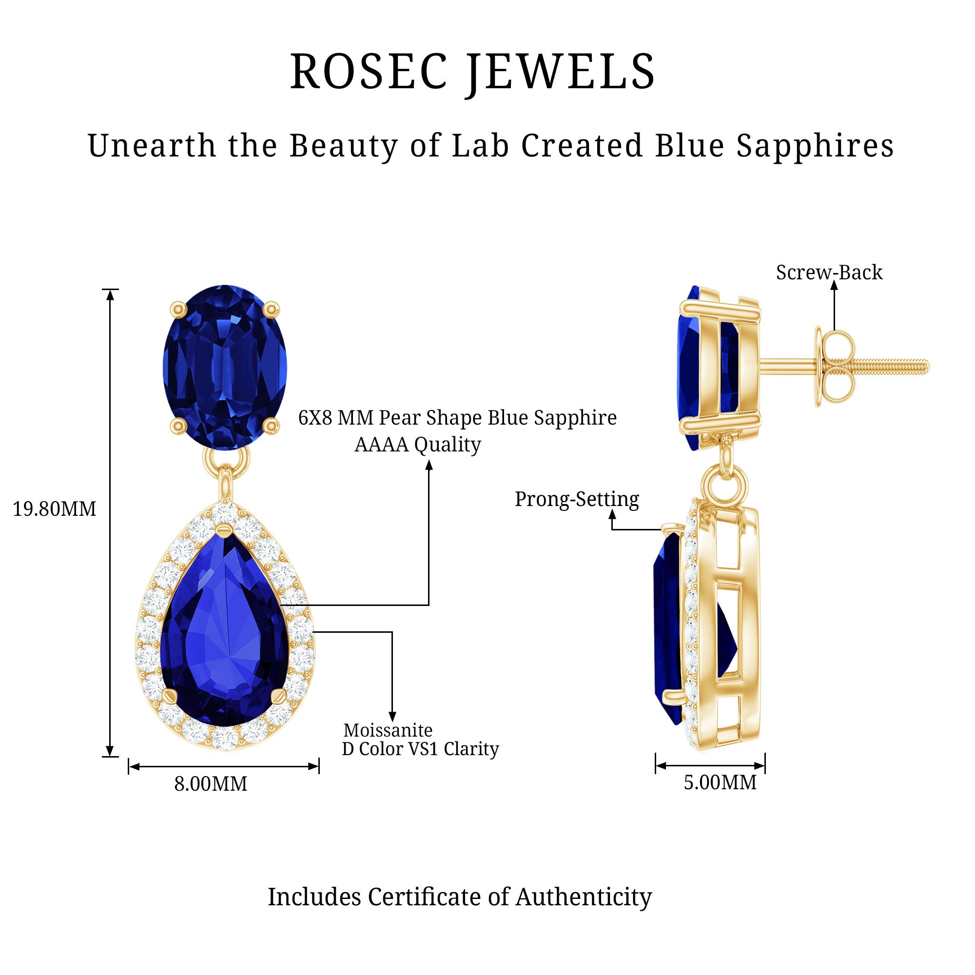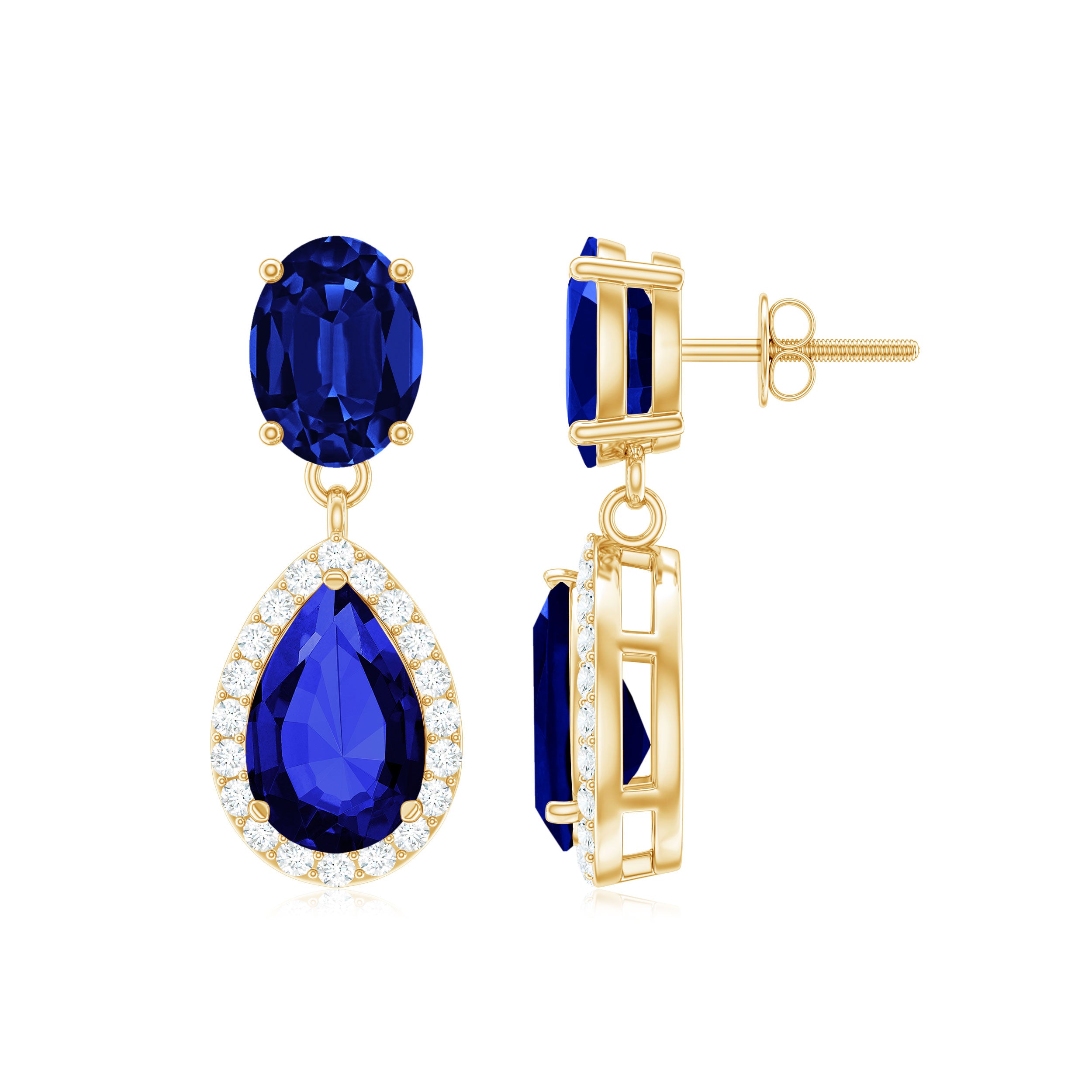 Mark your wedding day with our stunning Bridal Drop Earrings, which feature a 6X8MM pear shaped lab created blue sapphire set in prong setting, surrounded by sparkling moissanite halo. At the top, a 5X7MM oval shaped lab created blue sapphire adds extra elegance and a luxurious feel. The combination of the deep blue sapphires and sparkling moissanite creates a stunning contrast, making the Dangle Drop Earrings shine beautifully from every angle. These Teardrop Earrings are made with AAAA quality lab created blue sapphires and D-VS1 quality moissanites, ensuring bright, clear, and durable stones. They are ethical and eco-friendly, giving you the beauty of natural gemstones without any compromise. The elegant drop design makes them perfect for weddings, parties, or other special events. Simple yet luxurious, they are the kind of earrings that add sparkle and timeless elegance to every outfit. With their classic design and striking color, these Blue Sapphire Earrings are a perfect addition to any jewelry collection, symbolizing beauty and elegance.