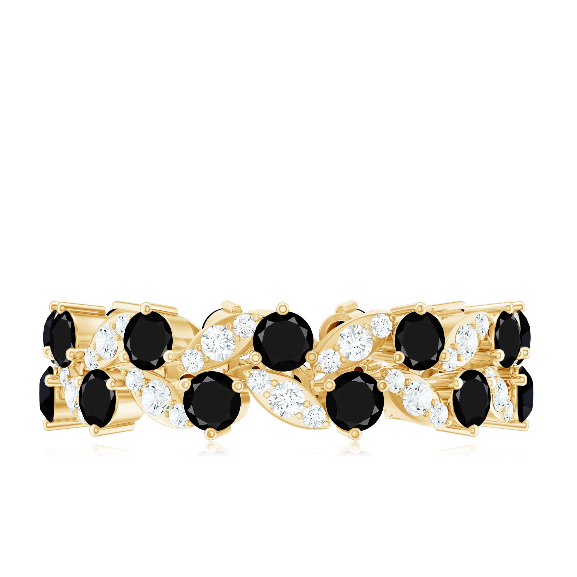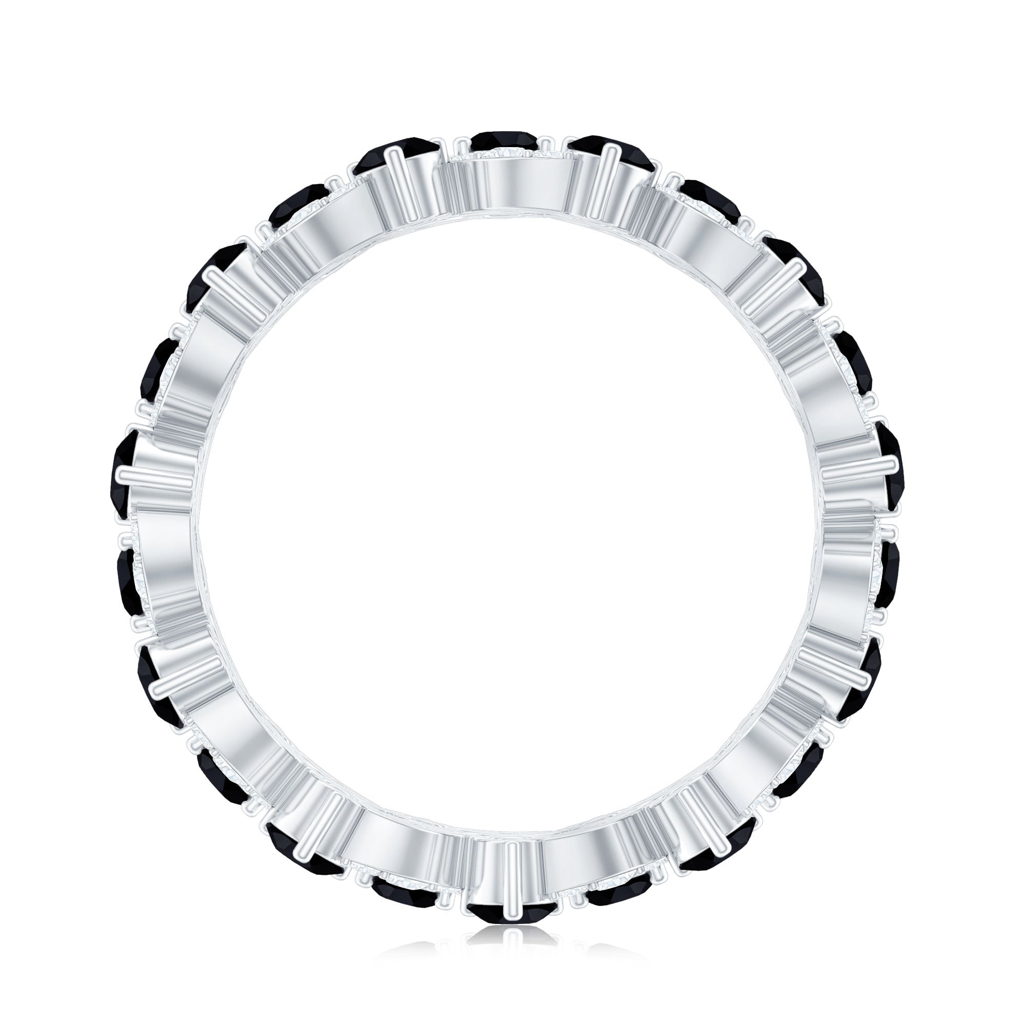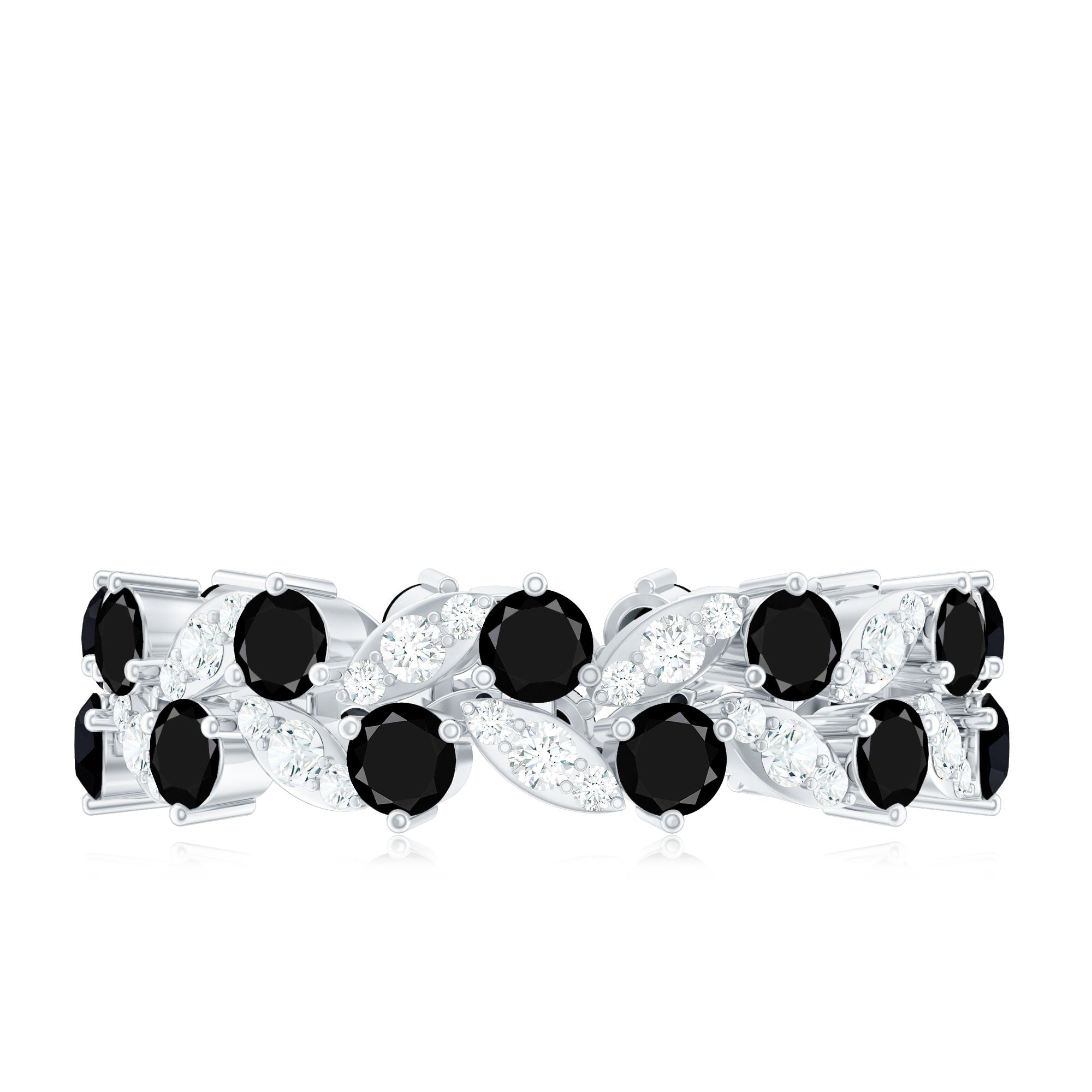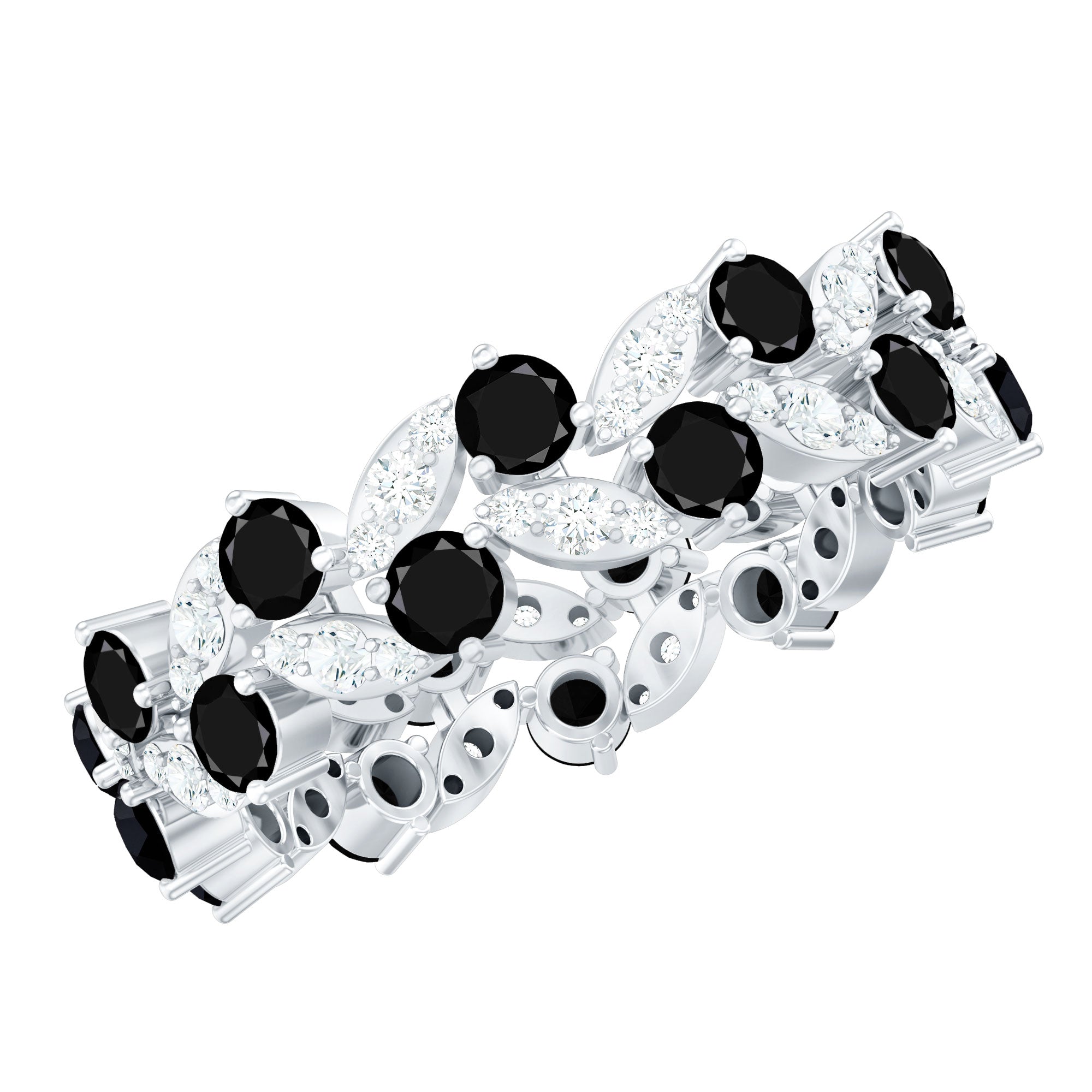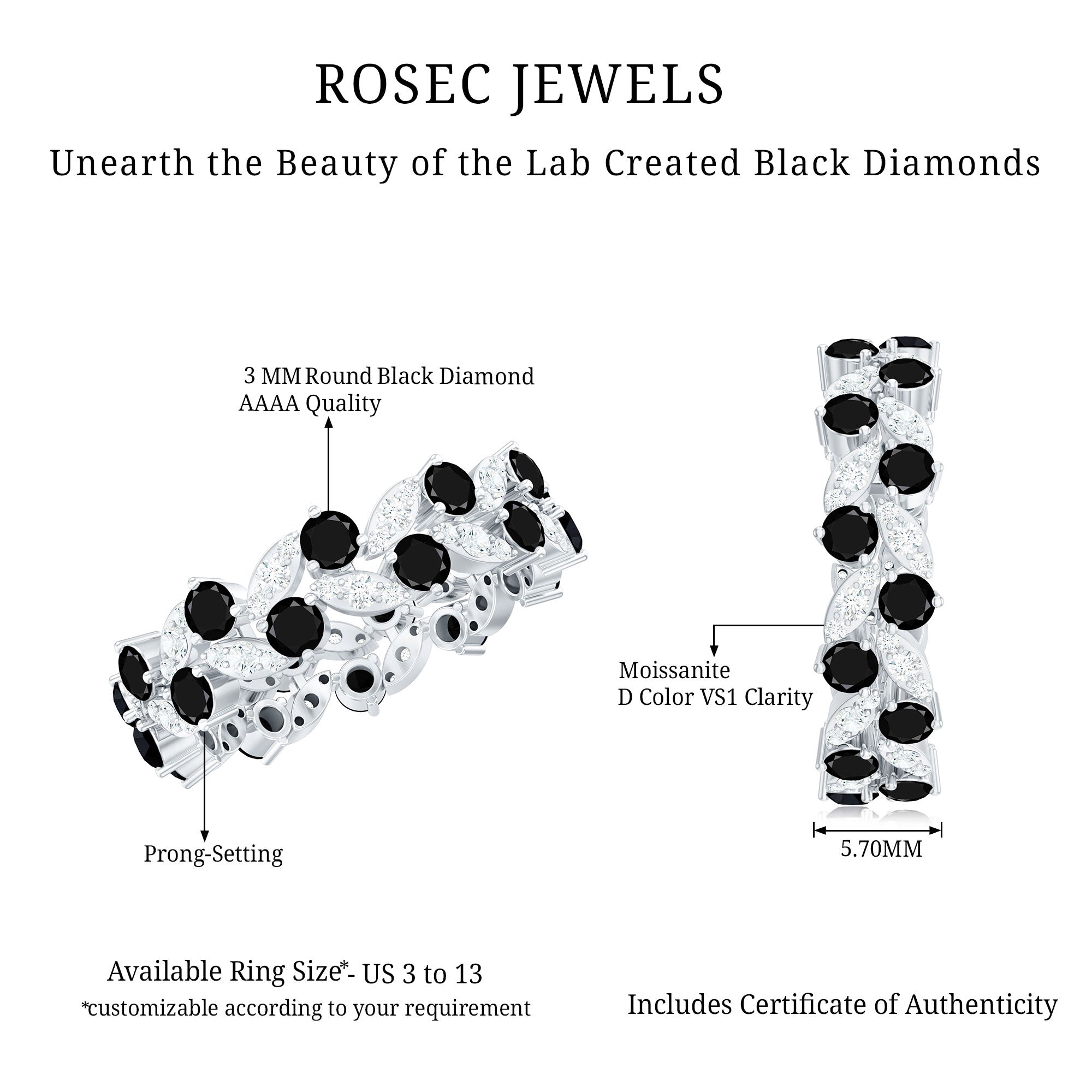 This stunning band ring features beautiful created black diamond and moissanite. The created black diamond adds a touch of elegance and sophistication, while the moissanite provides a brilliant sparkle. The eternity design of the ring symbolizes endless love and commitment, making it the perfect choice for a special occasion such as an engagement or anniversary. The leaf eternity ring is crafted with meticulous attention to detail, ensuring that it will be a cherished piece of jewelry for years to come.