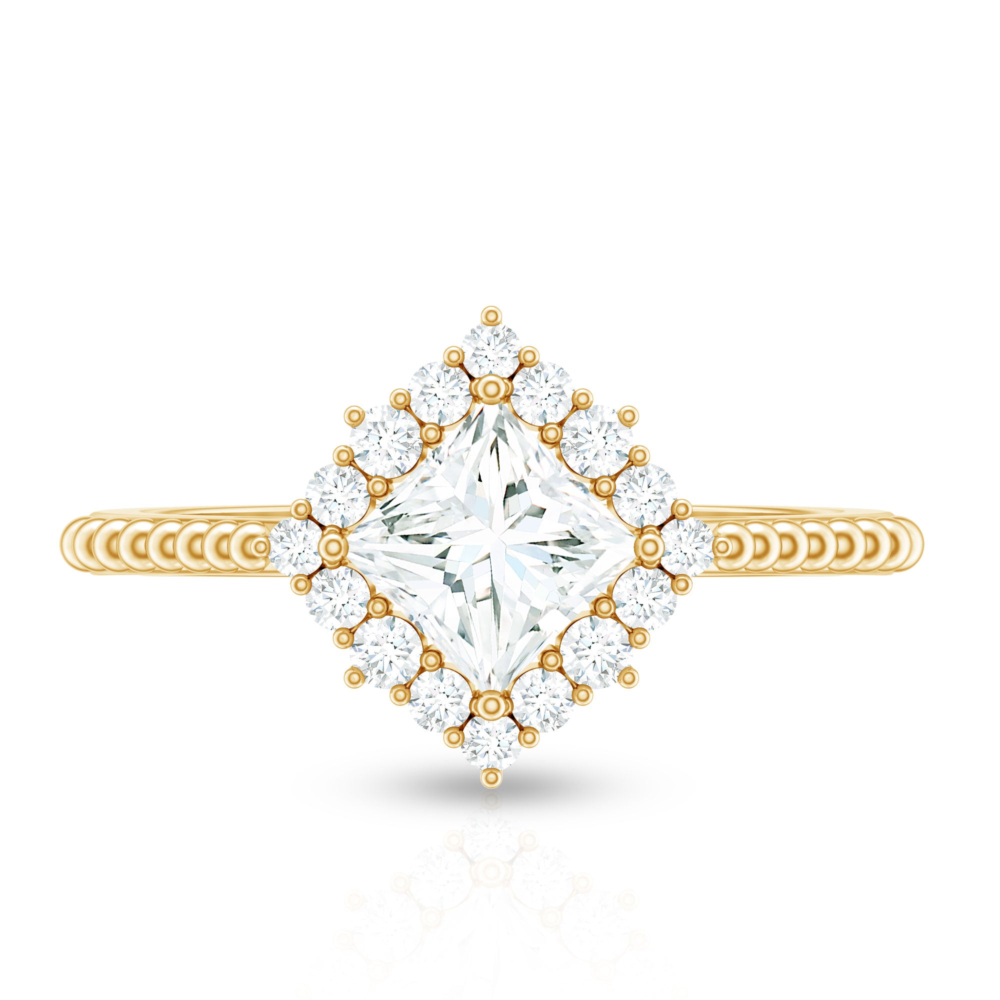 True love is expressed in many ways, and a carefully selected ring for your big day is one of the best ways of doing it. This outstanding Moissanite Halo Ring featuring 5 mm tilted Princess Cut Moissanite surrounded by tiny round shape moissanites, enhancing the sparkle of the center stone. This Halo Engagement Ring has beaded embellished shank, which give this piece an antique look. Moissanite has exceptional chemical, physical, and optical properties that closely resemble those of a diamond, giving this ring a brilliant sparkle and radiant look she’s sure to adore. Crafted with meticulous attention to detail, this Moissanite Square Ring is a symbol of strength, unity, and enduring love. Its soft yet daring look makes this Halo Engagement Ring a standout piece that she will wear and adore for a lifetime. Designed for everyday comfort and timeless appeal, this Womens Moissanite Engagement Ring is available in US sizes 3 to 13 to ensure the perfect fit. Whether youre preparing for a heartfelt surprise or a quiet, intimate moment, it comes thoughtfully packaged in a beautiful jewelry box, ready to be treasured from the moment it’s revealed.
