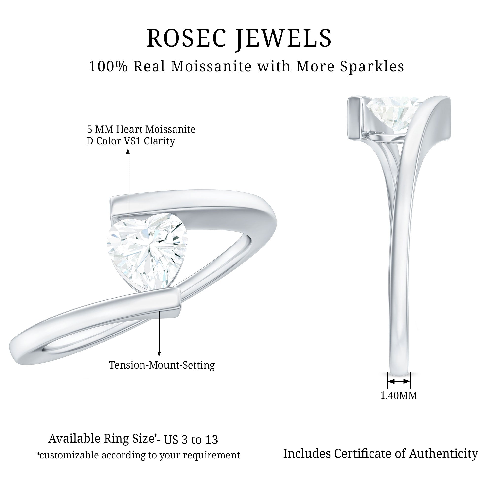 Celebrate love with the Sweetheart Promise Ring, a stunning symbol of affection and elegance. This Moissanite Solitaire Ring featuring a beautifully 5mm heart-shaped Moissanite at the center set in a tension mount setting, this romantic ring is perfect for proposals, anniversaries, or simply showing you care. The sleek and minimalist bypass shank gently twists to embrace the sparkling heart, blending classic charm with a modern silhouette that not only imparts a contemporary aesthetic but also protects the stone, this Half Carat Moissanite Ring perfect for everyday use. Expertly handcrafted, this Heart Promise Ring is offered in a range of high-quality metal with purity and color options, that reflects your individual style. Additionally, it is available in US standard sizes from 3 to 13, guaranteeing an ideal fit for every hand. Whether intended for a proposal, an anniversary, or a special occasion for just the two of you, this Solitaire Promise Ring is a timeless piece that she will treasure for a lifetime. A classic design meant to evoke emotions — just as yours did when you discovered your soulmate.