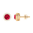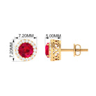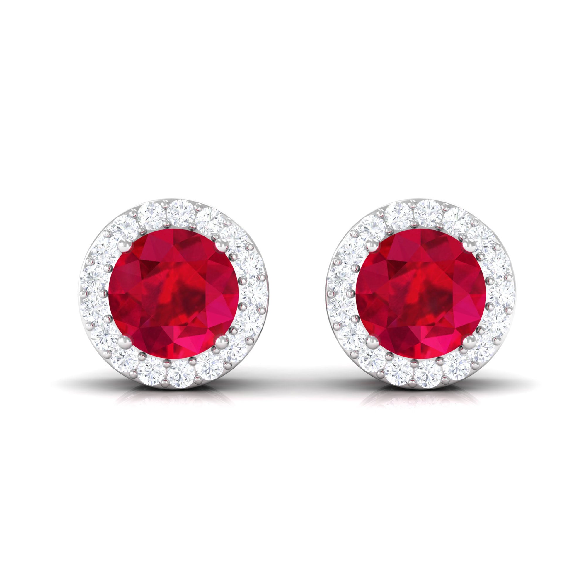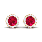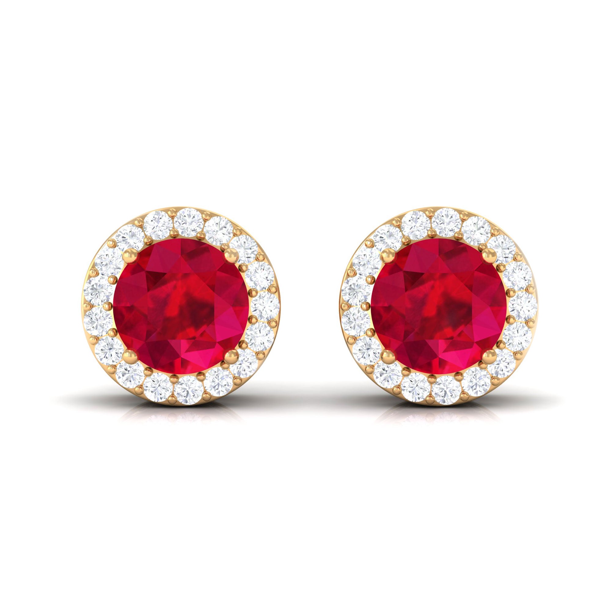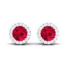 Grace your look with effortless beauty through these elegant Ruby Stud Earrings. Designed to catch the light from every angle, they bring a radiant sparkle that enhances any outfit. At the center of each earring rests a 5 MM round cut lab created ruby, set in prong setting and surrounded by a delicate halo of round brilliant cut diamonds. The striking contrast between the fiery red ruby and the bright white diamonds creates a graceful balance of color and sparkle, giving these Ruby and Diamond Earrings a timeless yet modern appeal. Whether worn for a special event or as part of your everyday style, they bring sophistication and charm to any look. Expertly crafted with precision, the AAAA quality ruby and sparkling HI-SI quality diamonds ensure lasting beauty and shine. The secure screw-back closures offer comfort and confidence, making them easy to wear throughout the day. Perfect for birthdays, anniversaries, or simply as a meaningful gift, these Ruby Halo Earrings are a beautiful way to express elegance and love.