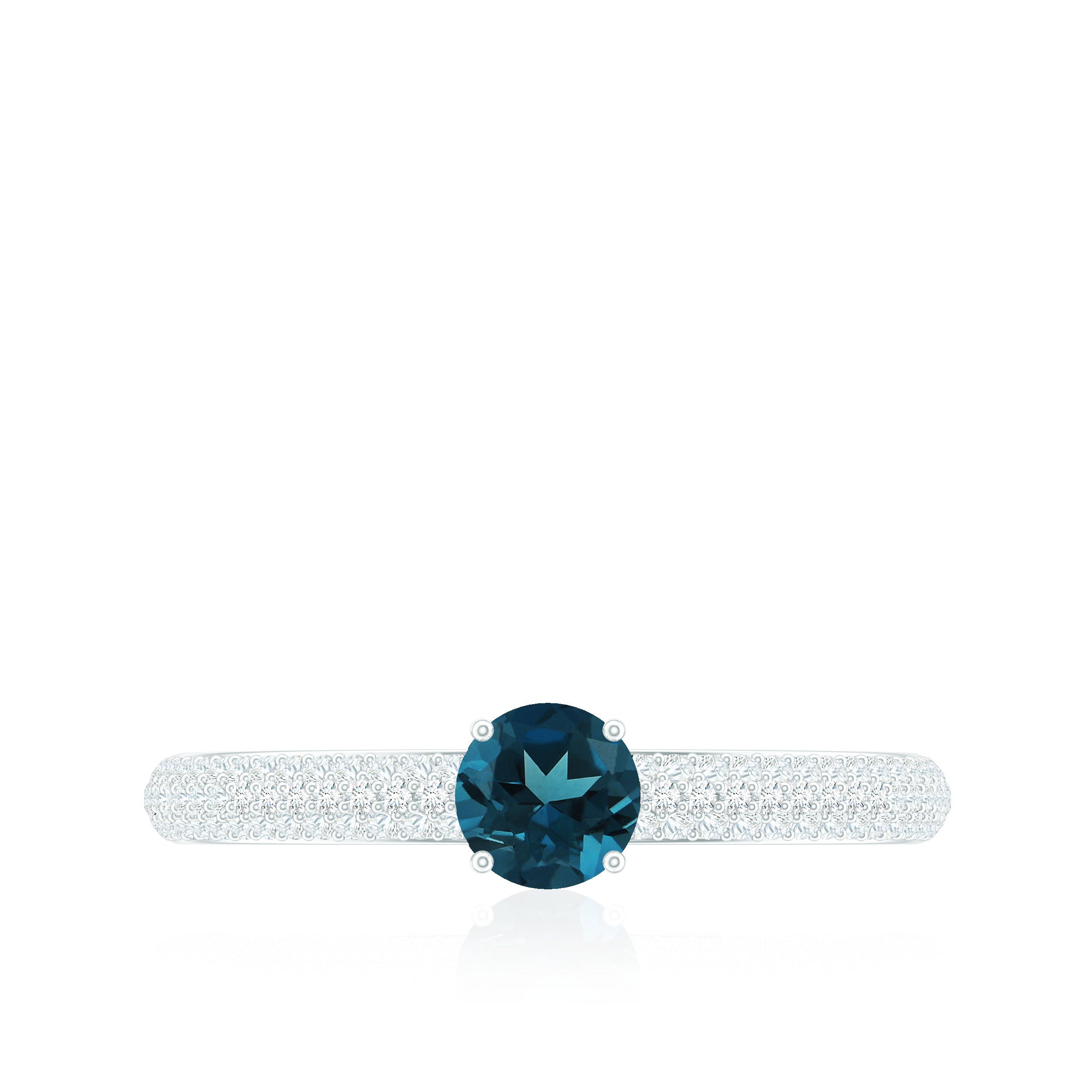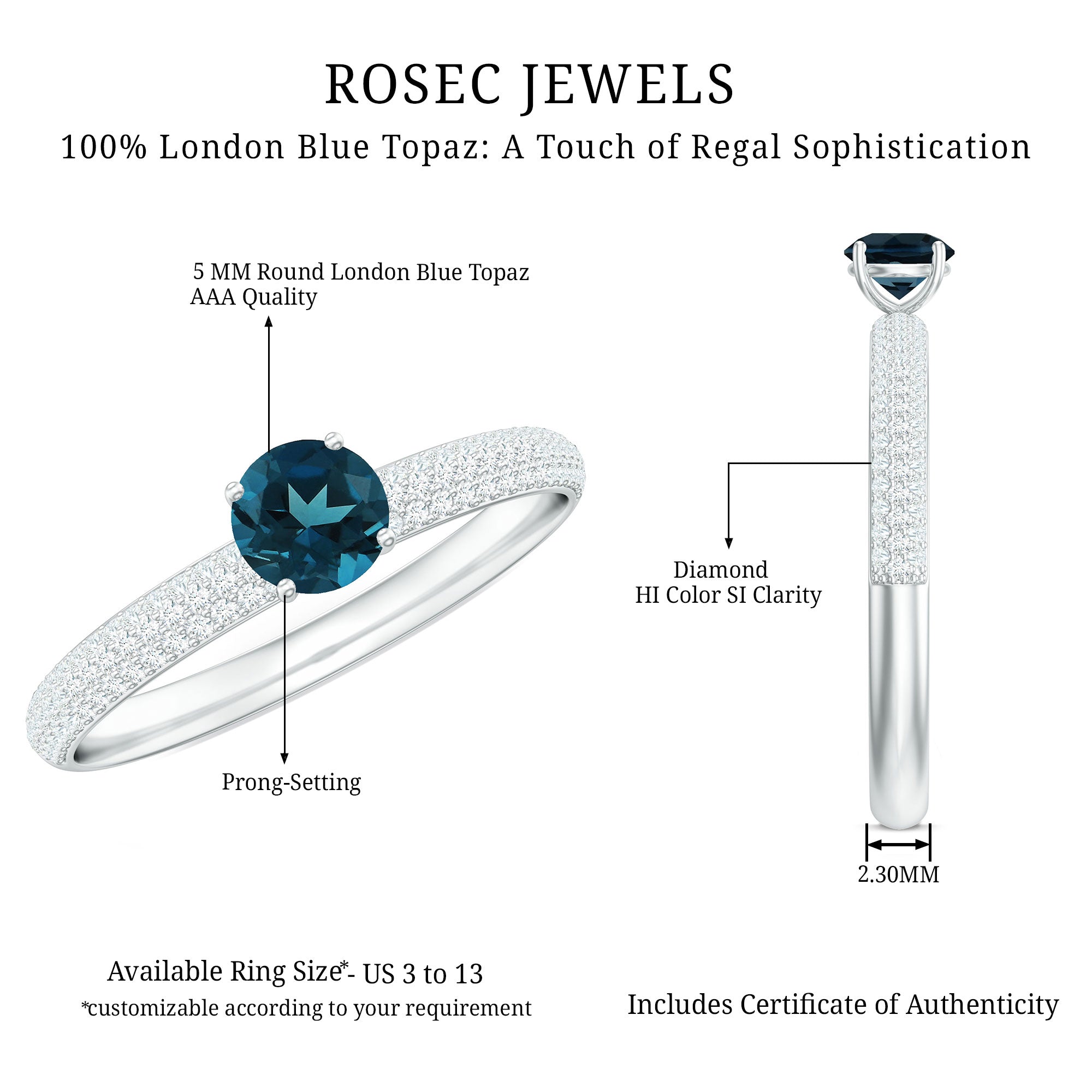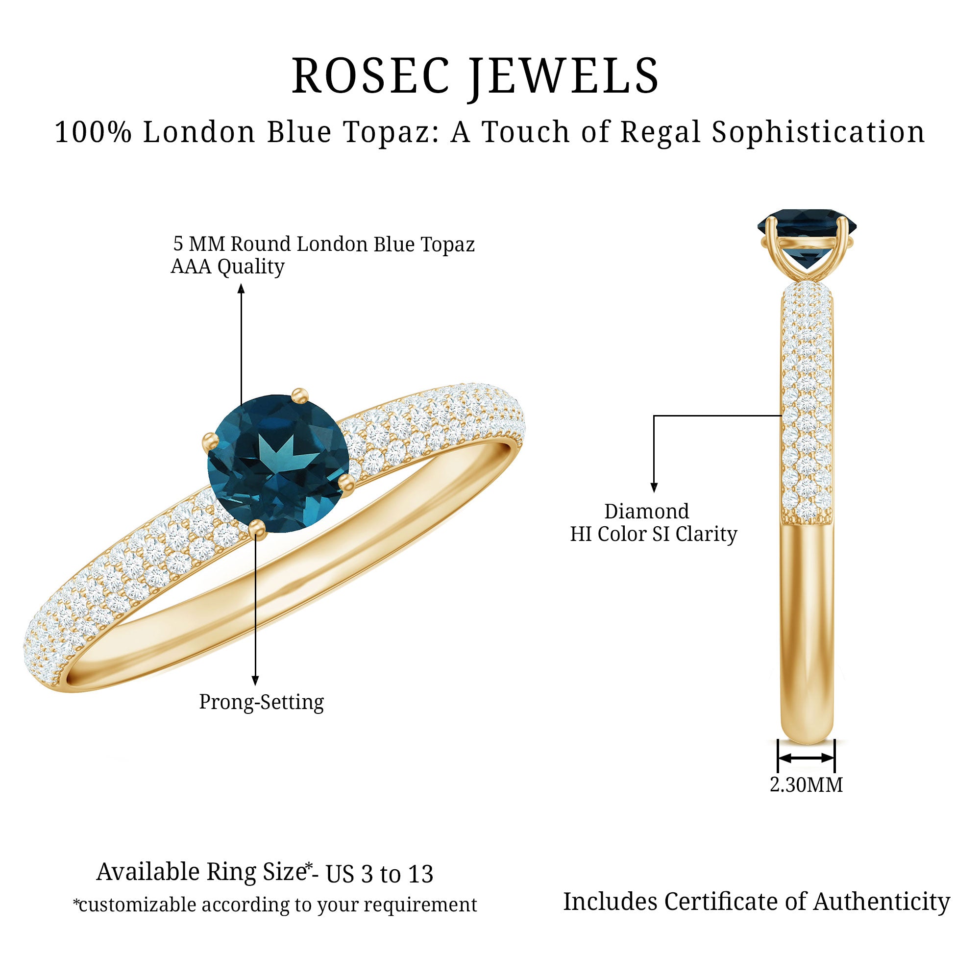 Crafted to honor your most treasured moments, this Solitaire Promise Ring exudes contemporary elegance. At its core lies a breathtaking 5 MM round shaped London Blue Topaz, securely set in a prong setting, renowned for its remarkable brilliance and enchanting sparkle. Surrounding this focal point are exquisite pave set side Diamond stones, carefully selected for their HI color and SI clarity, designed to reflect light from every angle and celebrate your love with unmatched radiance. Presented in an elegant jewelry box, this London Blue Topaz Ring is poised to create lasting memories, whether for a surprise proposal, an anniversary celebration, or any special occasion that requires a hint of extra sparkle. Expertly crafted, this Blue Topaz Solitaire Ring features side stones that beautifully enhance the central stone, infusing a sense of sophistication and elevating its overall allure. Let this stunning London Blue Topaz Promise Ring serve as the luminous symbol of your shared journey, a piece that will continue to shine with your love for many years to come.