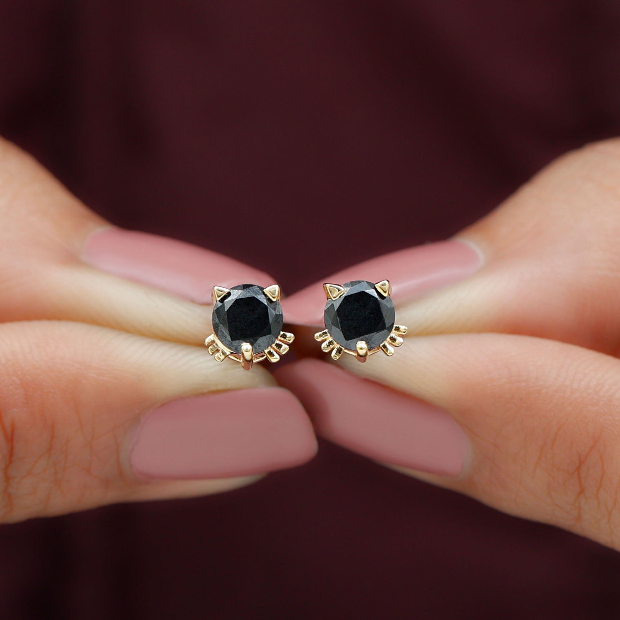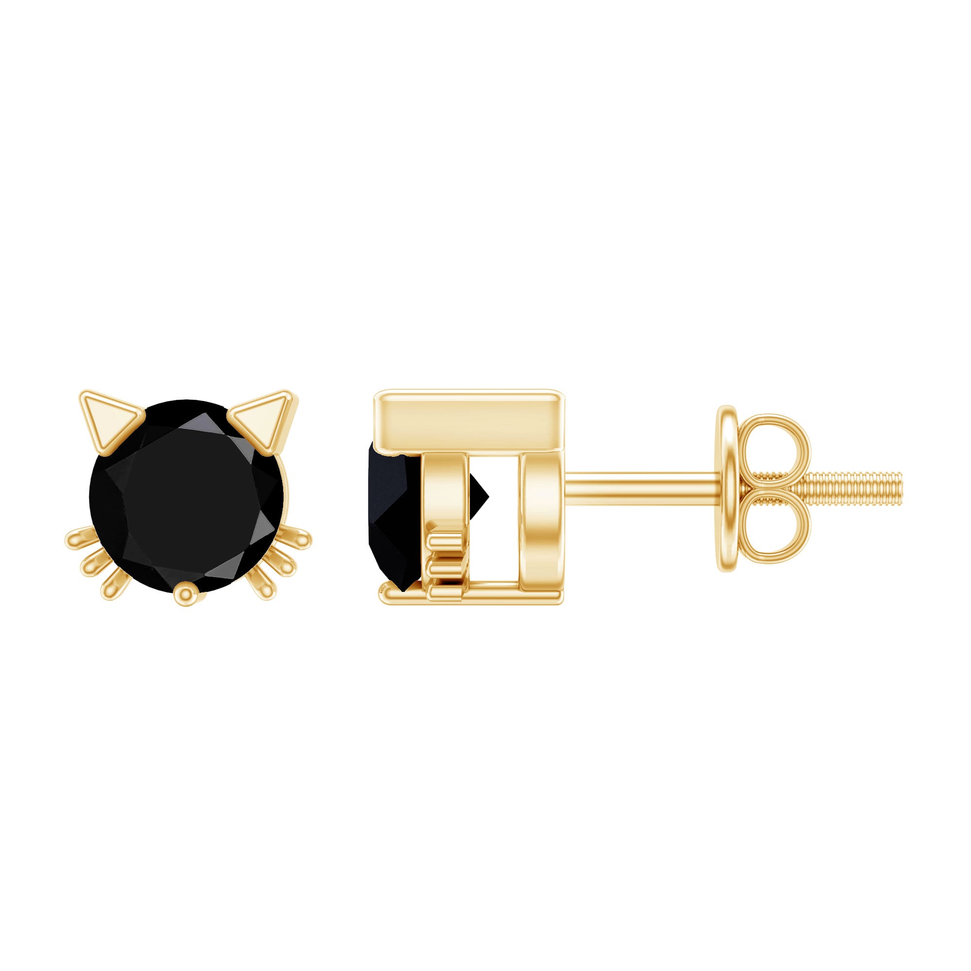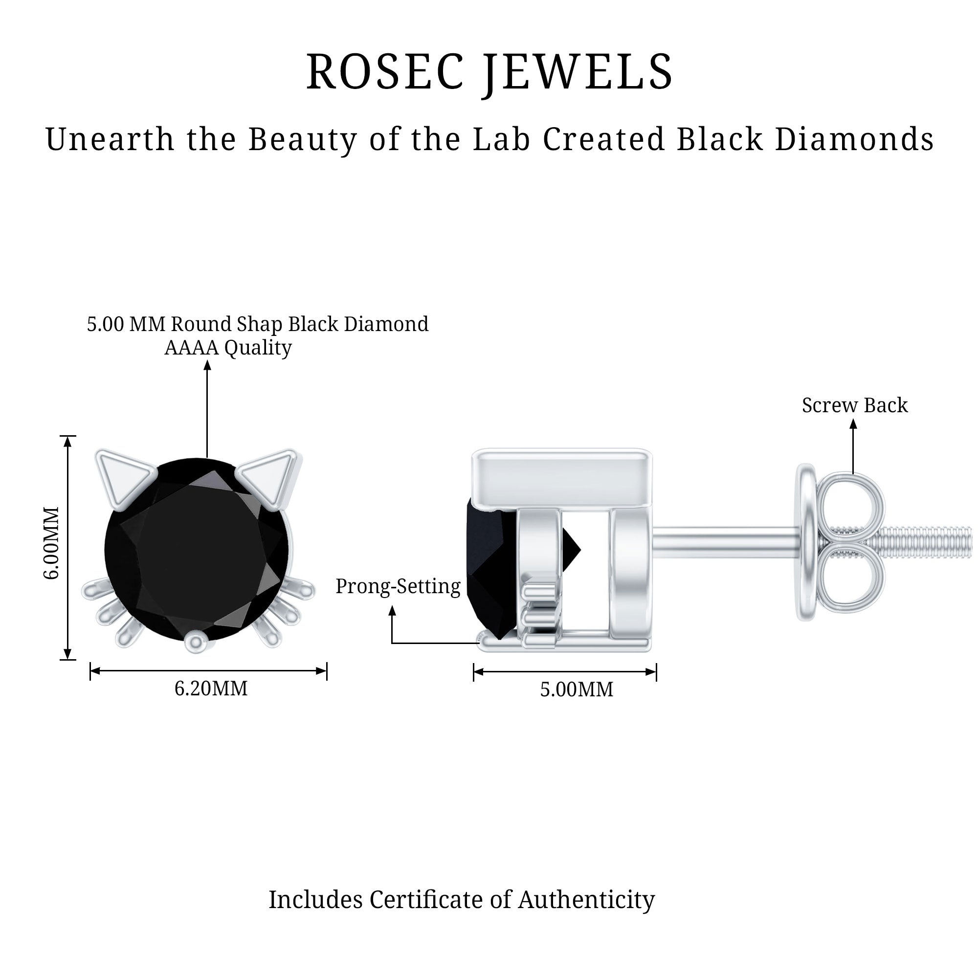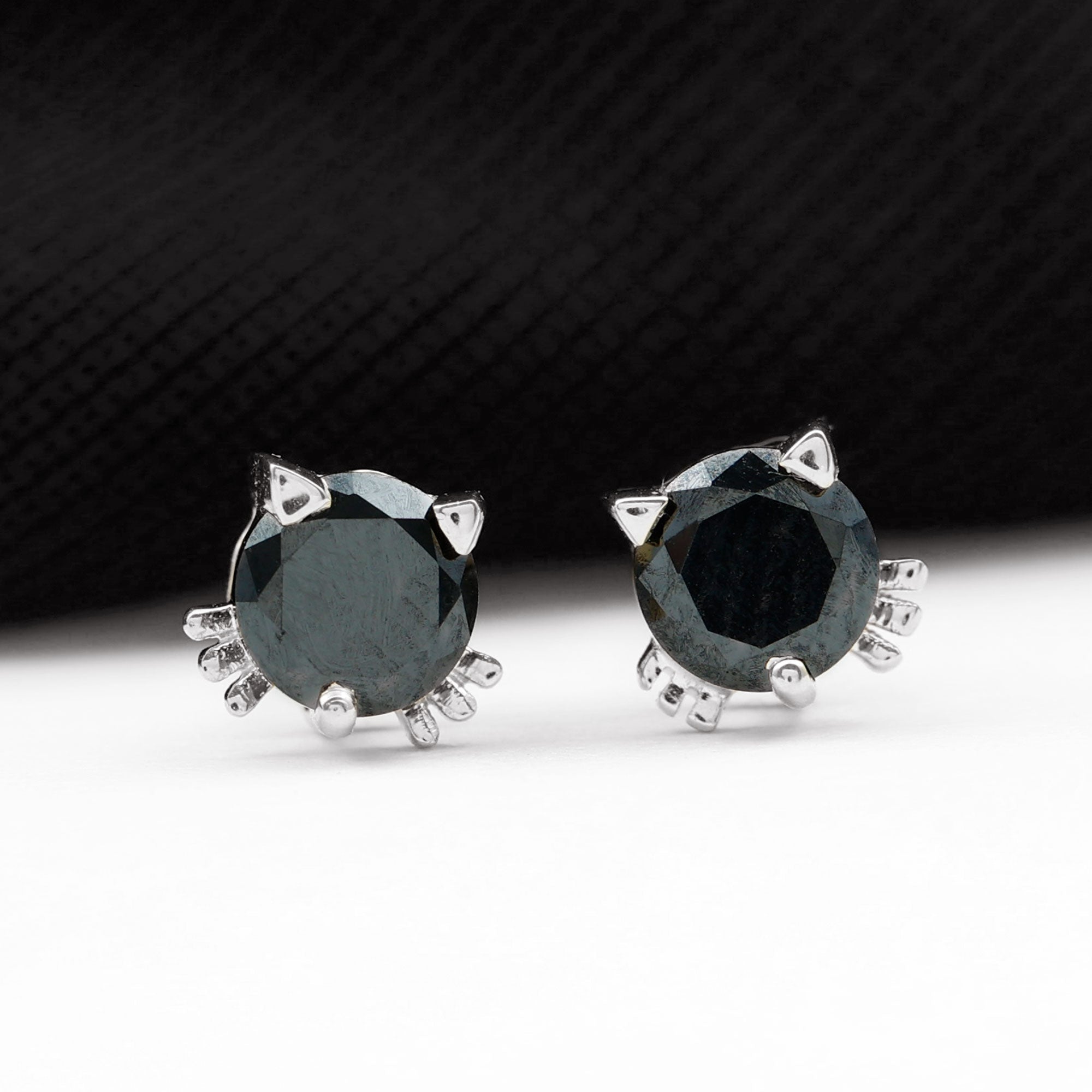Bring a fun and stylish touch to your look with these adorable Lab Grown Black Diamond Earrings. Each earring features a 5 MM round cut lab created black diamond placed at the center in secure prong setting. The earrings are shaped like a cute cat face, with metal ears and whiskers adding a charming and cheerful detail. This cat inspired design makes the studs perfect for animal lovers and anyone who enjoys unique accessories. Despite their fun look, the Black Diamond Stud Earrings are easy to wear and suitable for everyday outfits. Screw back closures provide a secure and comfortable fit, allowing you to wear them with confidence throughout the day. Made with AAAA quality lab created black diamonds, these Cat Stud Earrings are an environment-friendly choice and a thoughtful option for conscious shoppers. These Kitty Stud Earrings come neatly packed in a jewelry box, making them ready for gifting or safe storage.