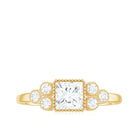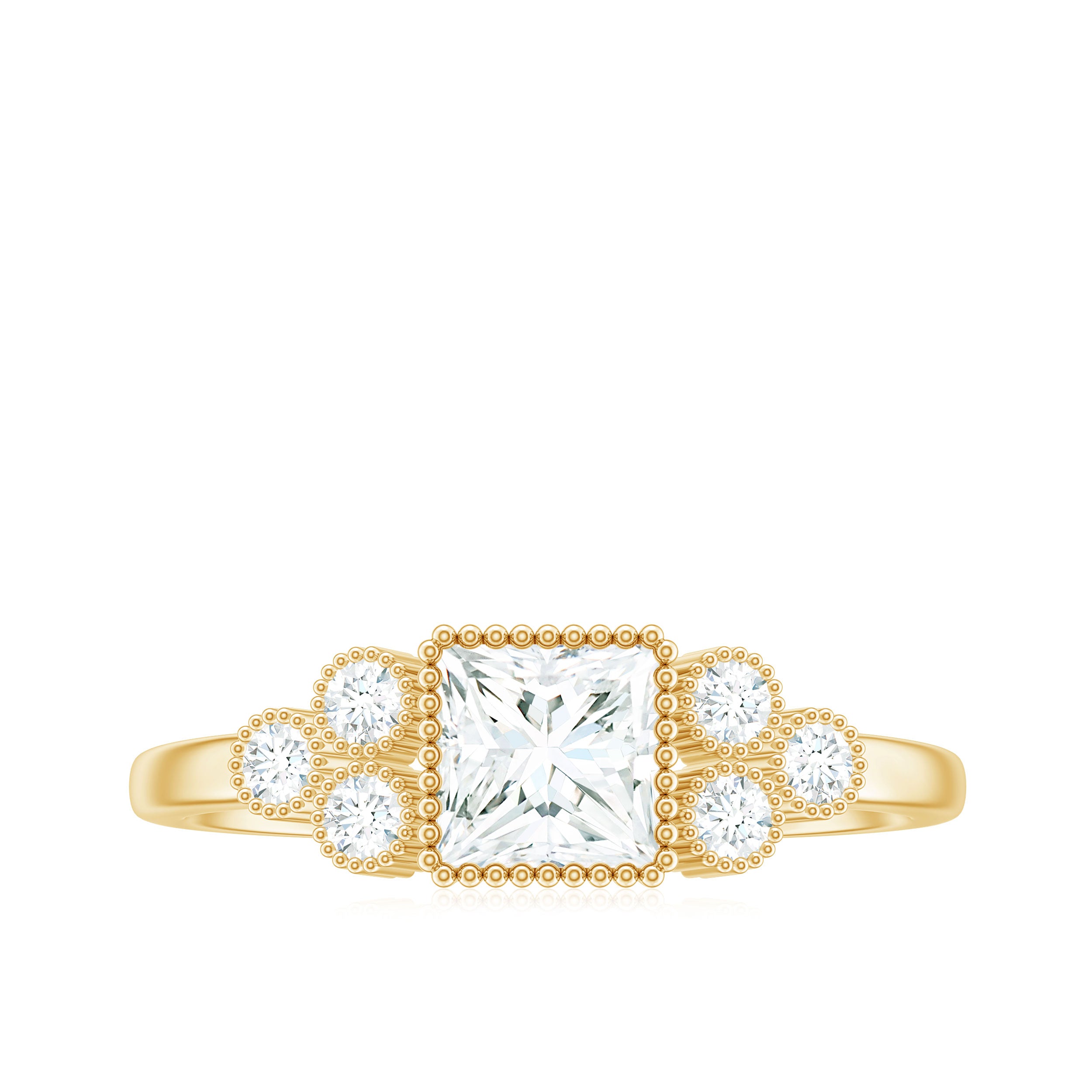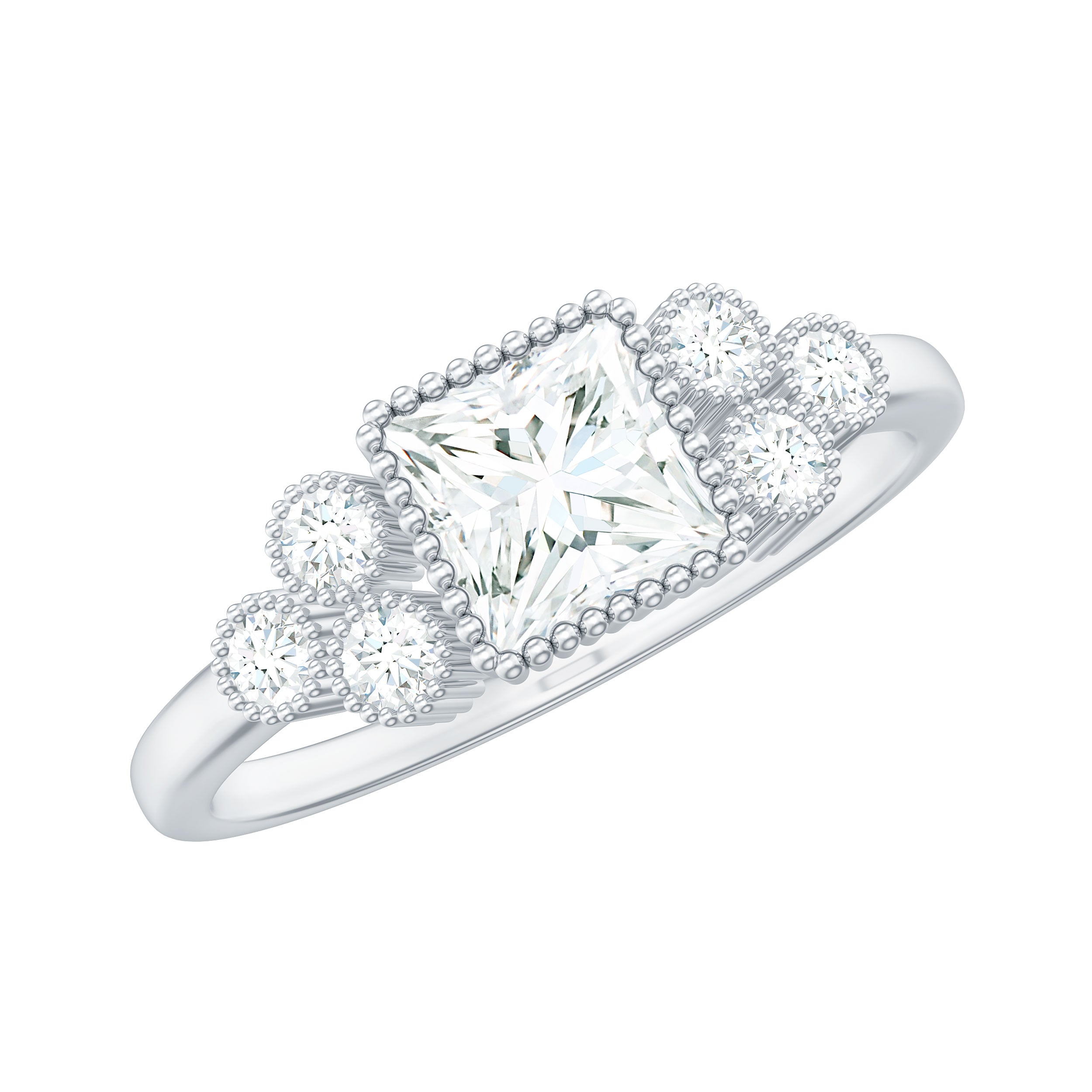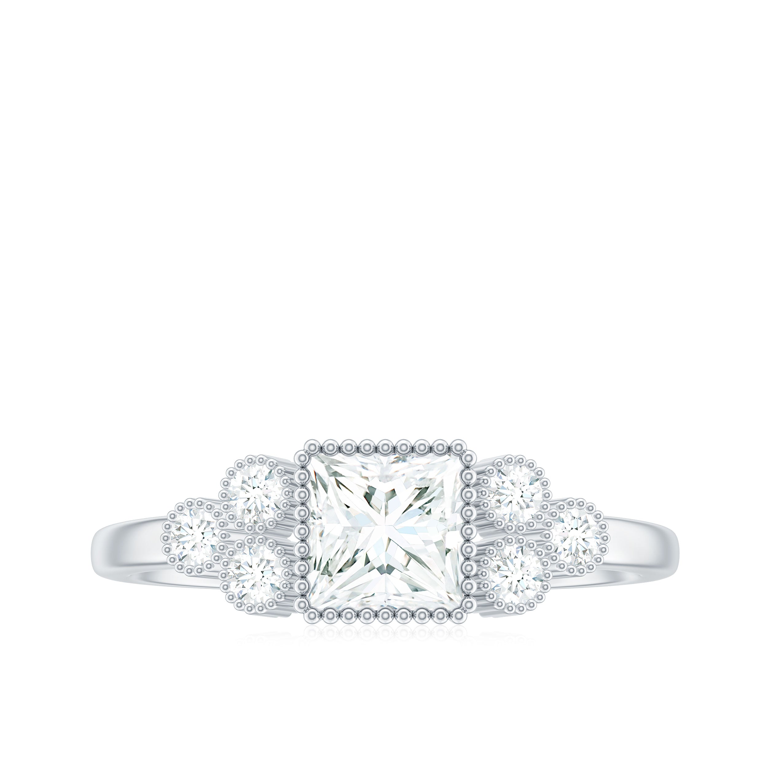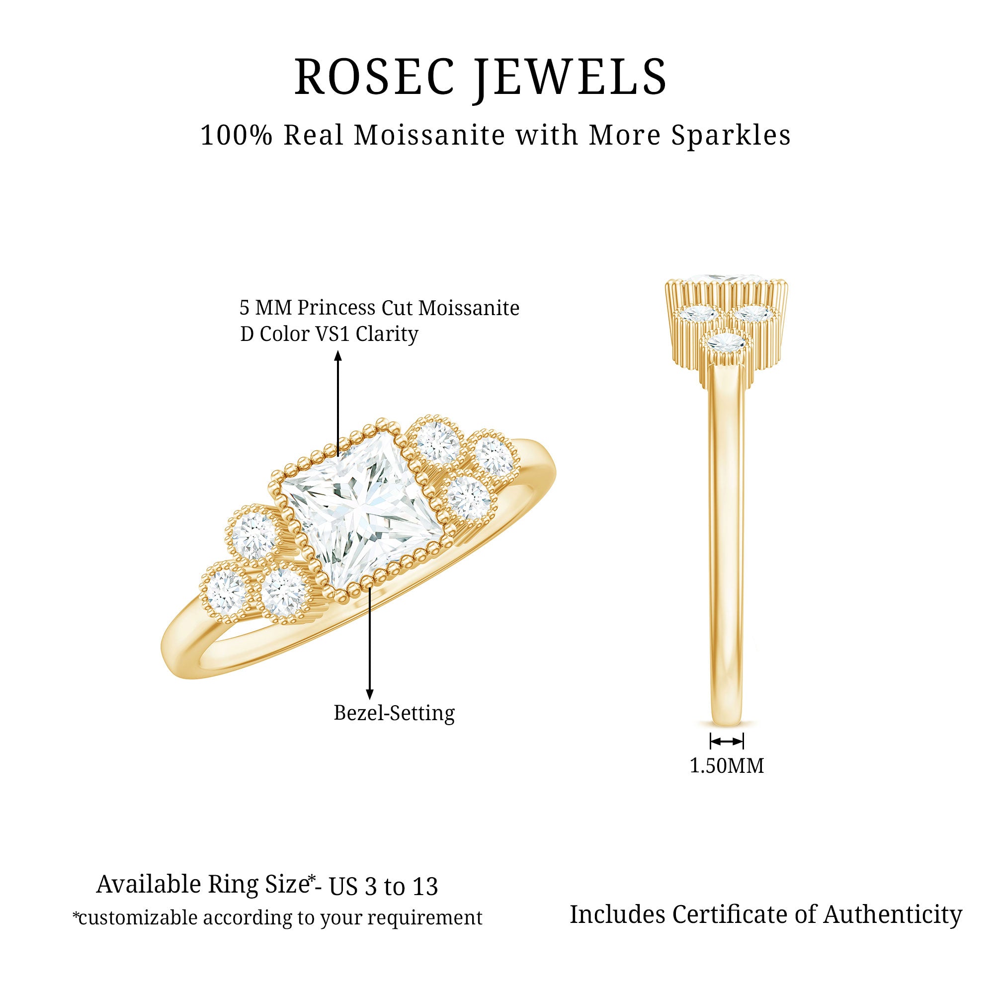 Celebrate love with timeless beauty in this stunning Moissanite Engagement Ring. Featuring a sparkling 5x5mm princess cut moissanite set at the center in a bezel setting accompanied with round moissanite trio on both sides, enhancing the brilliance of the ring. Crafted for special moments, this 1.25 Carat Moissanite Ring is a meaningful symbol of love, whether you are planning a proposal or marking an important milestone. The bezel setting not only adds a stylish touch but also keeps the stone safe and secure, perfect for everyday wear. With its D color and VS1 clarity, the moissanite sparkles beautifully, offering the brilliance of a diamond at a more affordable price. Packed in a beautiful jewelry box, this Princess Moissanite Ring is ready to gift or keep as a personal treasure. Whether it is for an engagement, anniversary, or a heartfelt surprise, this Moissanite Solitaire Ring is designed to make moments unforgettable. Simple, elegant, and full of charm, this Bezel Engagement Ring is a reflection of the love and memories youll cherish forever.