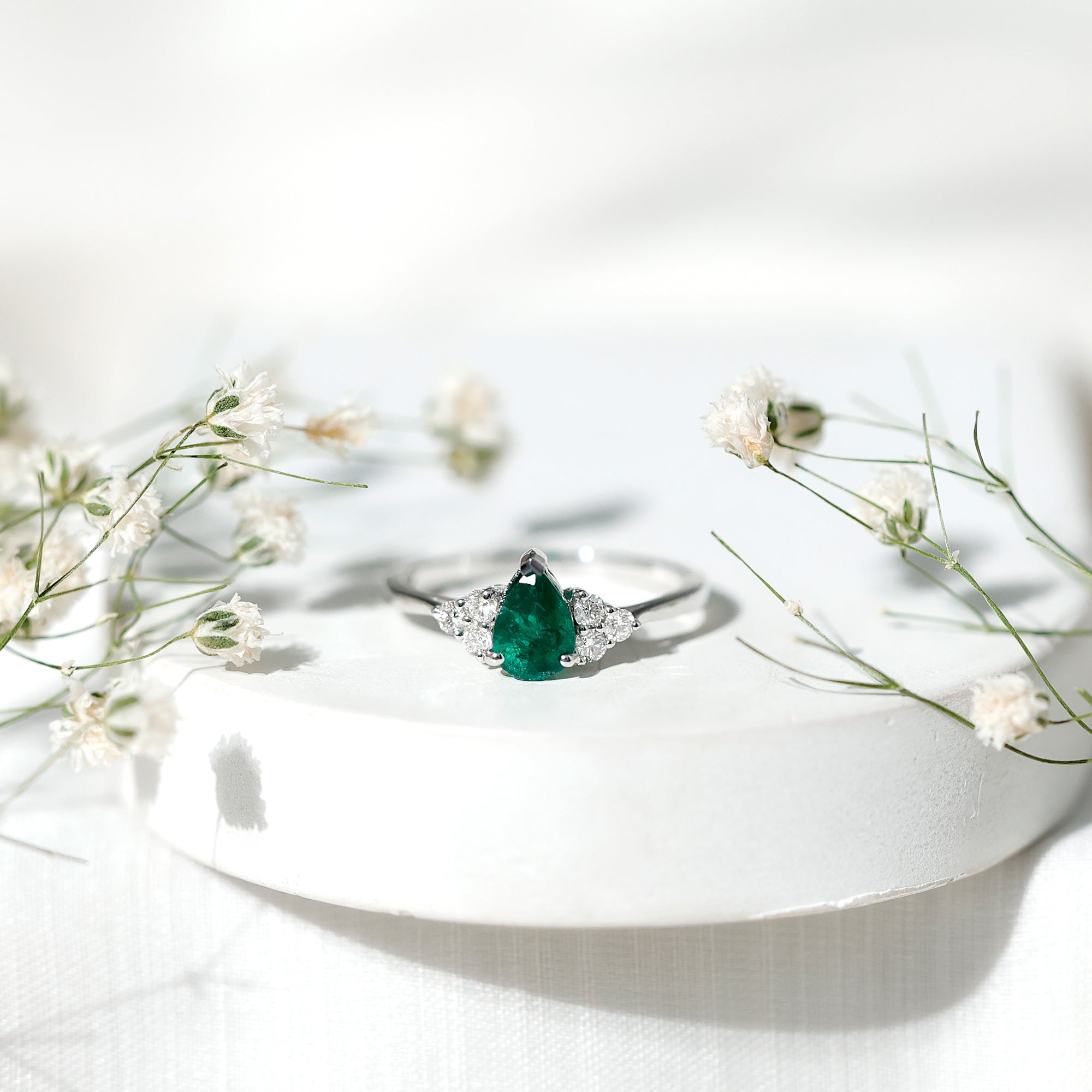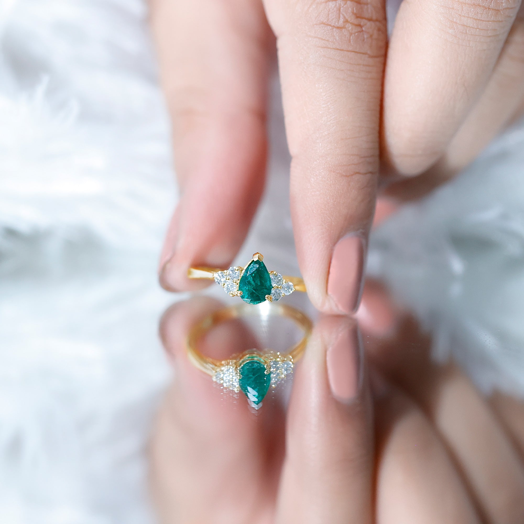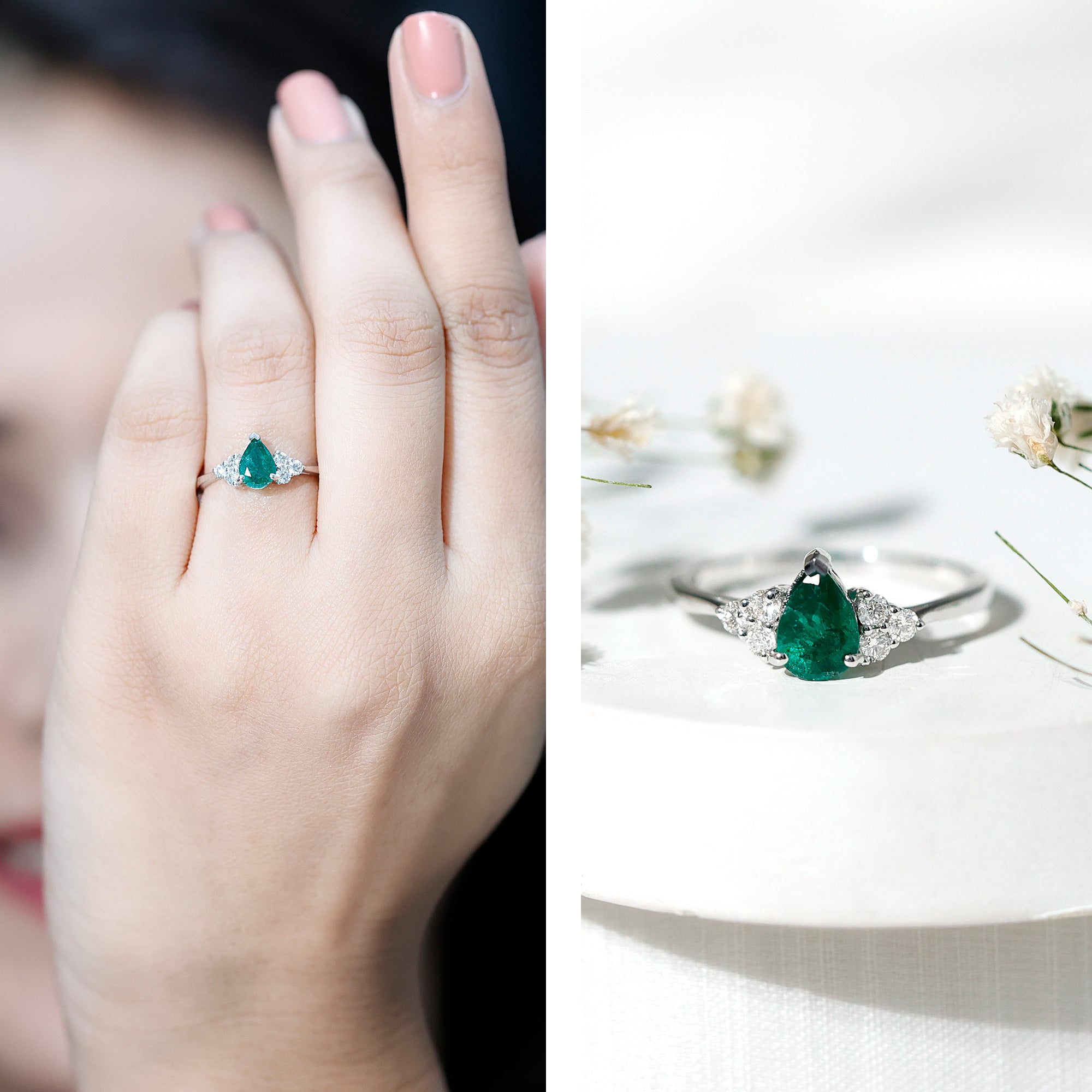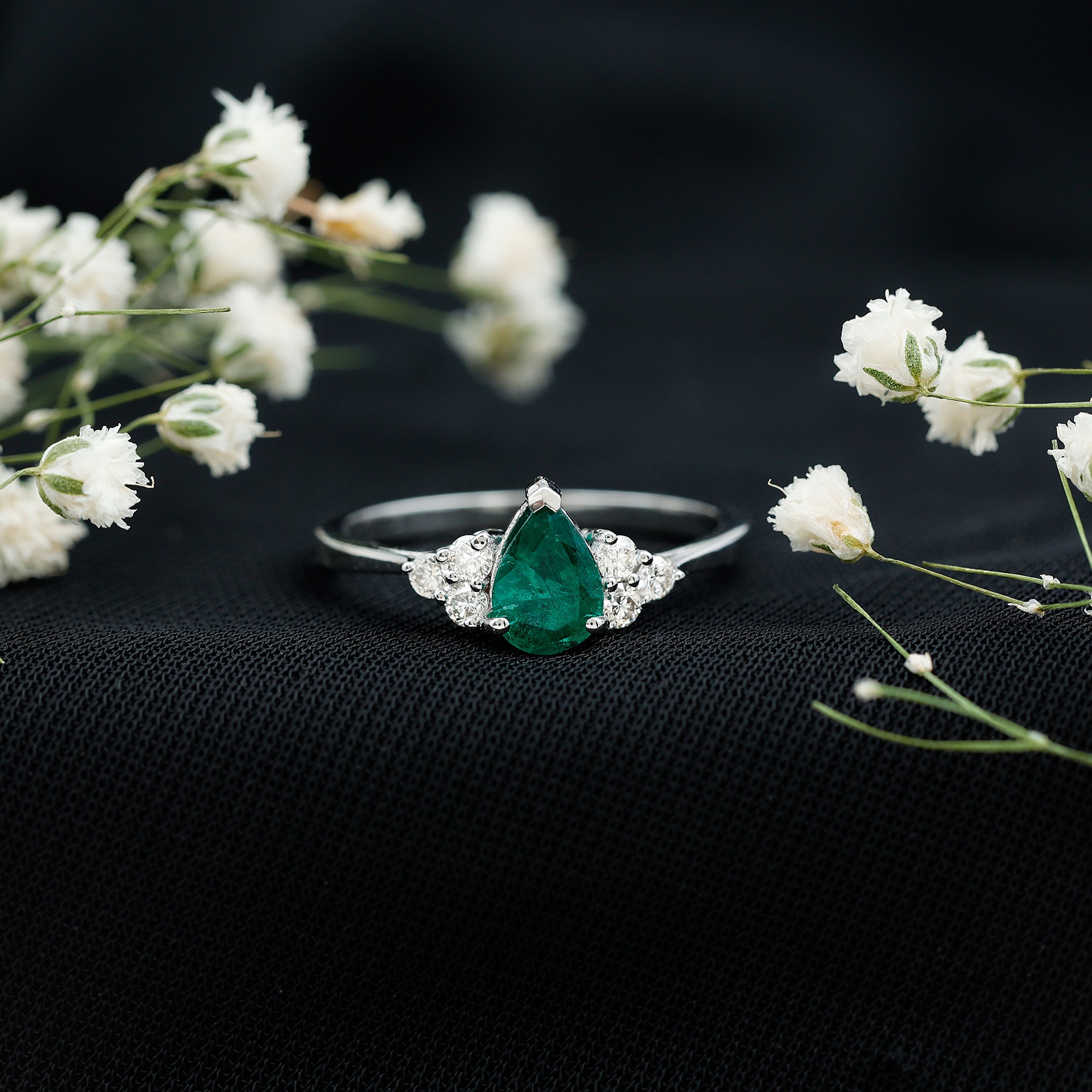 5X7mm AAA Quality Pear Shape Emerald Solitaire Engagement Ring with Diamond Trio