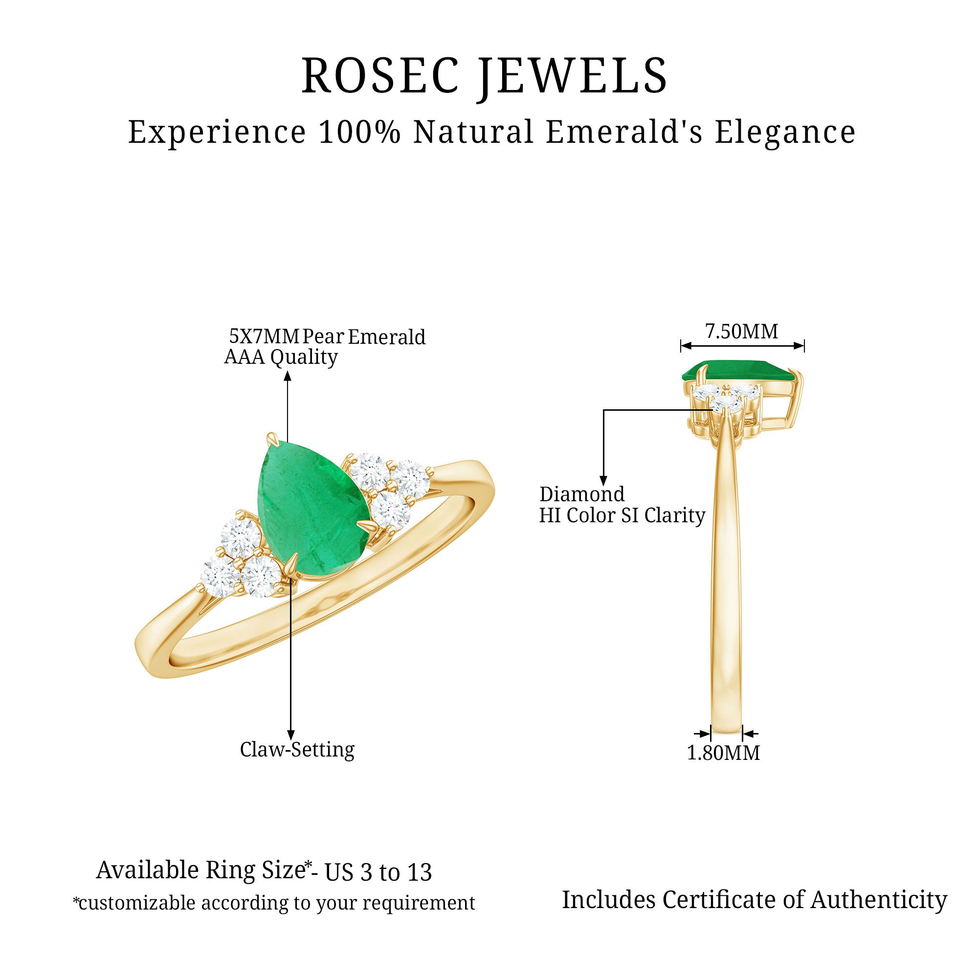 Celebrate love with a dazzling Emerald Engagement Ring – the perfect symbol of forever. Make your proposal unforgettable with this mesmerizing pear shaped engagement ring, a stunning representation of timeless elegance and emotional depth. The ring features a captivating 5X7 mm AAA quality emerald at its heart, radiating rich green brilliance, flanked by shimmering HI-SI quality round diamonds on either side, totaling a precise 0.948 carat weight. Designed in a secure claw setting, this minimal engagement ring reflects sophistication and simplicity in perfect harmony, making it an ideal token for life’s most meaningful promise. Crafted for modern romantics, this emerald and diamond engagement ring embodies purity, passion, and individuality, suited for those seeking a classic yet fresh expression of their journey. The teardrop-shaped emerald lends the piece a graceful and organic silhouette, beautifully blending into the designs subtle sparkle, making it an exquisite green emerald ring for any bride-to-be. Whether you see it as a pear cut engagement ring or a womens ring emerald, its delicate style and luxurious feel mark it as a piece to treasure for a lifetime. Perfect for engagements, this emerald diamond ring isnt just a piece of jewelry — its a heartfelt story, a memory frozen in time, and a symbol of commitment that transcends trends. An iconic trio engagement ring like this makes an unforgettable impression and is sure to be cherished as an heirloom for generations.