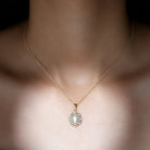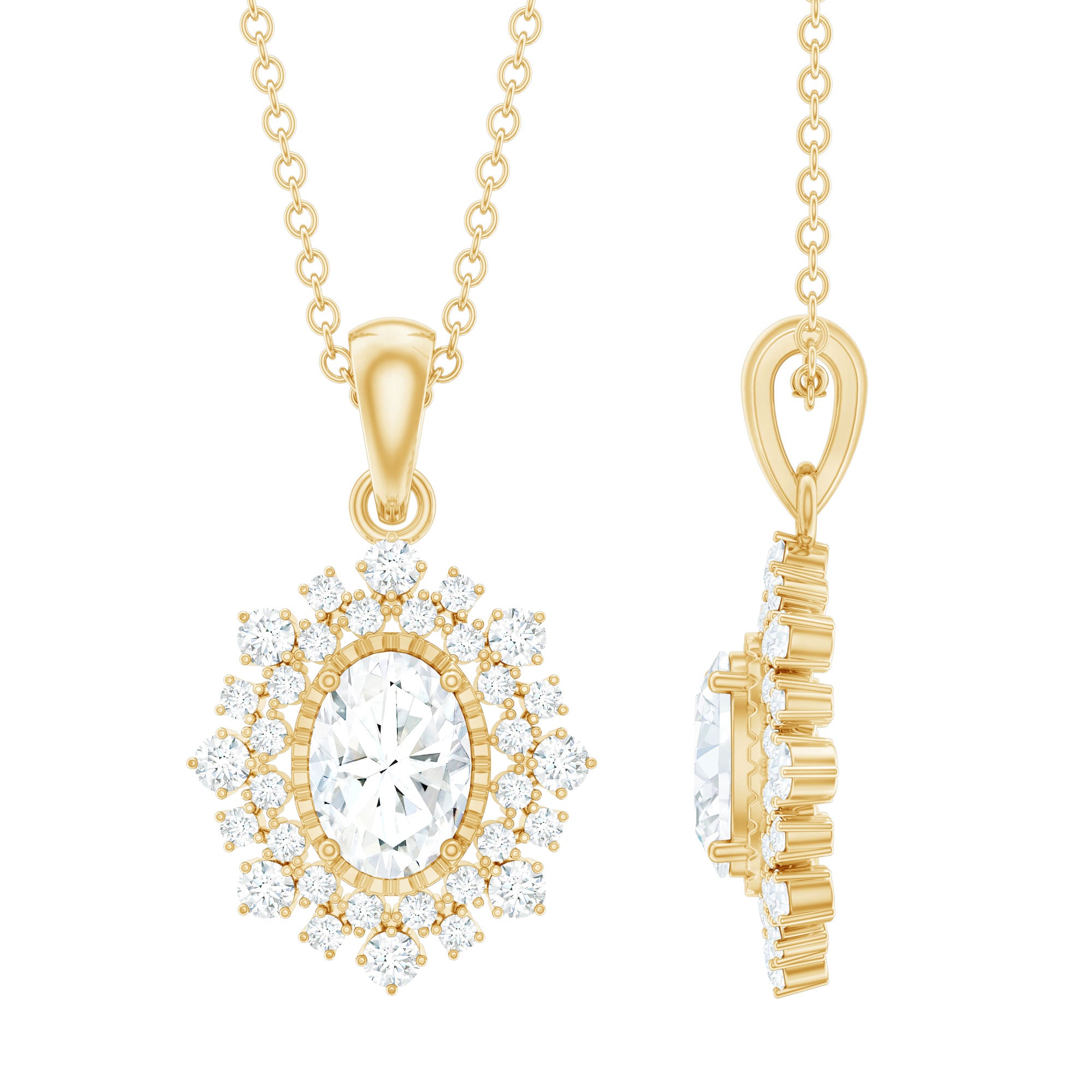 With the perfect blend of royal essence and modern style here is the Oval Diamond Necklace. This Statement Necklace from Rosec Jewels is handcrafted from a 5X7 MM Oval Shape Diamond securely placed in the Prong Setting. This Diamond Necklace Pendant is beautified with a Double Halo of Diamonds and Accented Bail. The Halo Diamond Pendant is perfect to dazzle the special occasions when paired with the bridal earrings. To make sure that your feelings and emotions attached to this Bridal Pendant Necklace is delivered securely to her, we send this pendant in the premium quality gift box.