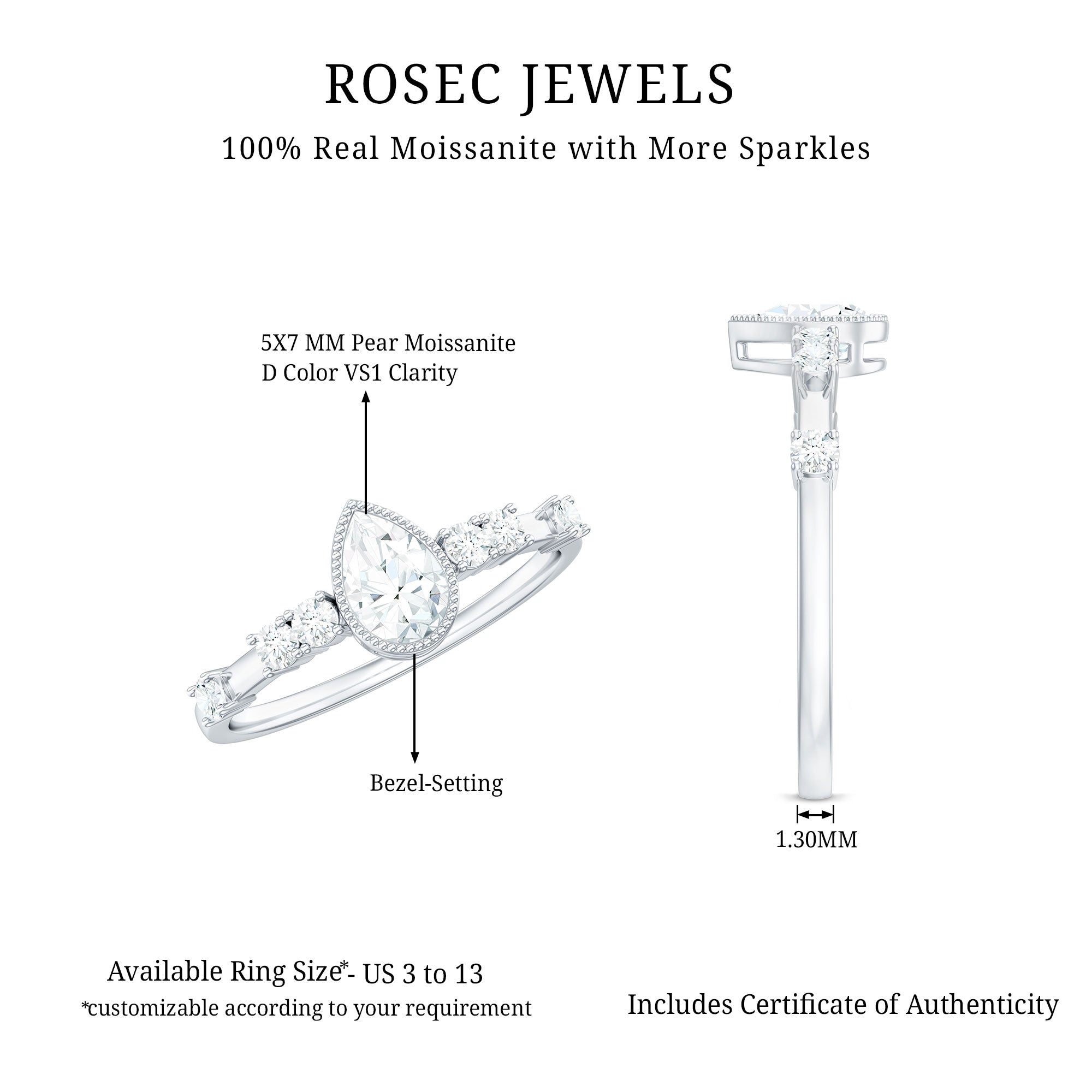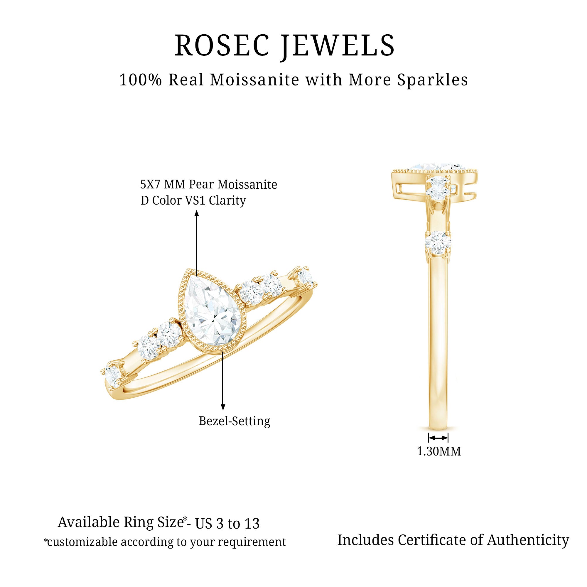 Enhance your life with a touch of elegance through this captivating Teardrop Engagement Ring, which showcases a 5X7 mm pear cut Moissanite at its center, elegantly set in a bezel surrounded by a beaded frame. This dazzling Pear Cut Moissanite Ring features a shank adorned with three round-shaped moissanites on each side, providing additional brilliance to the piece. The delicate beaded accents flanking the central gem contributing to vintage charm, ensuring that the Moissanite Engagement Ring truly stands out. Authentically Certified Moissanites, possessing D color and VS1 clarity, exhibit the similar luster and brilliance as natural diamonds, all at more accessible prices. Elevate your special day with this remarkable Pear Shaped Engagement Ring, crafted for all-day comfort and confidence. Designed by skilled professionals, this piece features quality-checked moissanites securely set, enhancing the value and uniqueness of this Pear Shaped Moissanite Ring. This Bezel Set Engagement Ring is offered in a variety of sizes and is presented in an exquisite jewelry box complete with certificates. Showcase it on any occasion, such as a party, engagement, wedding, anniversary, and more.