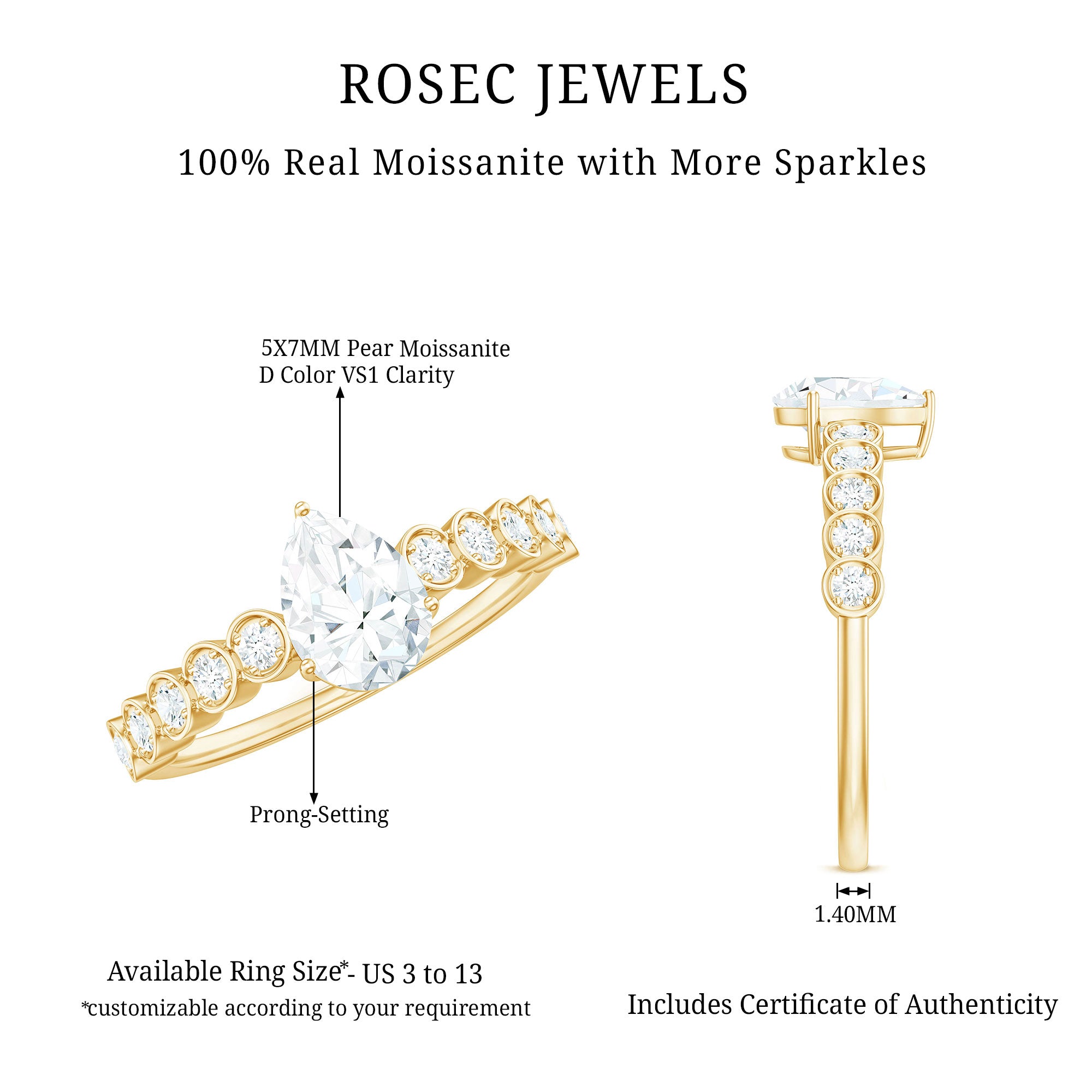 Dazzle your loved ones with the perfect gift - a Moissanite Engagement Ring from Rosec Jewels collection. Ideal for those wanting timeless elegance, the pear shaped engagement ring blends stunning beauty with graceful sophistication. This Solitaire Engagement Ring accentuates the brilliance of a superbly cut 5x7mm pear shaped Moissanite set at the center as solitaire in a 3 prong setting with round shape moissanites side stones. This White Moissanite Ring, characterized by its striking and timeless elegance, represents everlasting love, making it an ideal selection to commemorate the commencement of your infinite journey together. The D-VS1 Quality Moissanite radiates with understated elegance, merging traditional beauty with contemporary design. Glimmering from every perspective, this 1 Carat Moissanite Ring enhances brilliance with its breathtaking look. Additionally, we provide a range of ring sizes and an extensive array of metals to select from. This Pear Shaped Moissanite Ring serves as an excellent gift for your Wife, Fiancee, Girlfriend, or Mother.