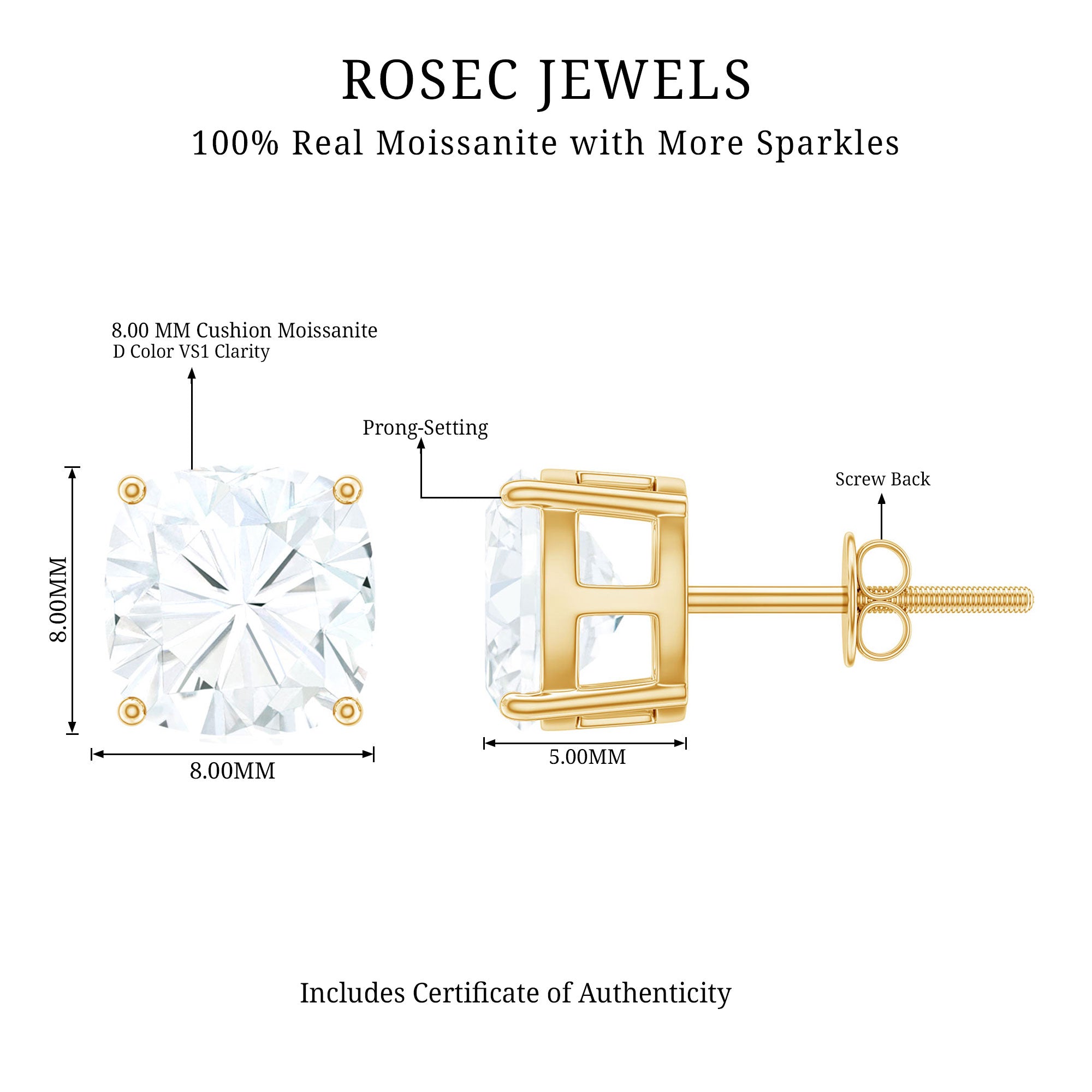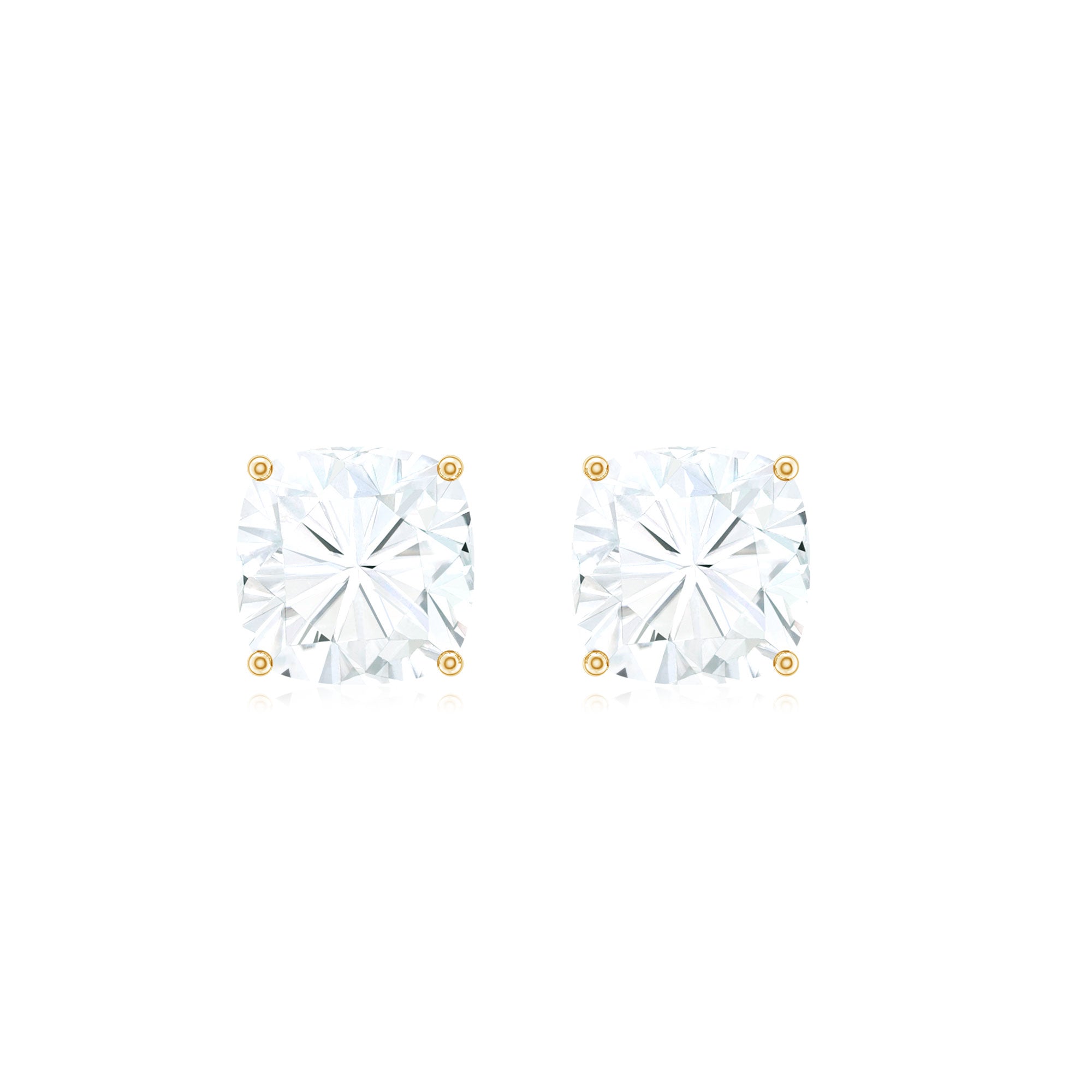 Elevate your outfit with these stunning stud earrings featuring a Cushion Cut Moissanite solitaire. The earrings are crafted in gold to add an opulent touch to your look. The cushion cut moissanite solitaire is the perfect addition to your jewelry collection and will complement any outfit.