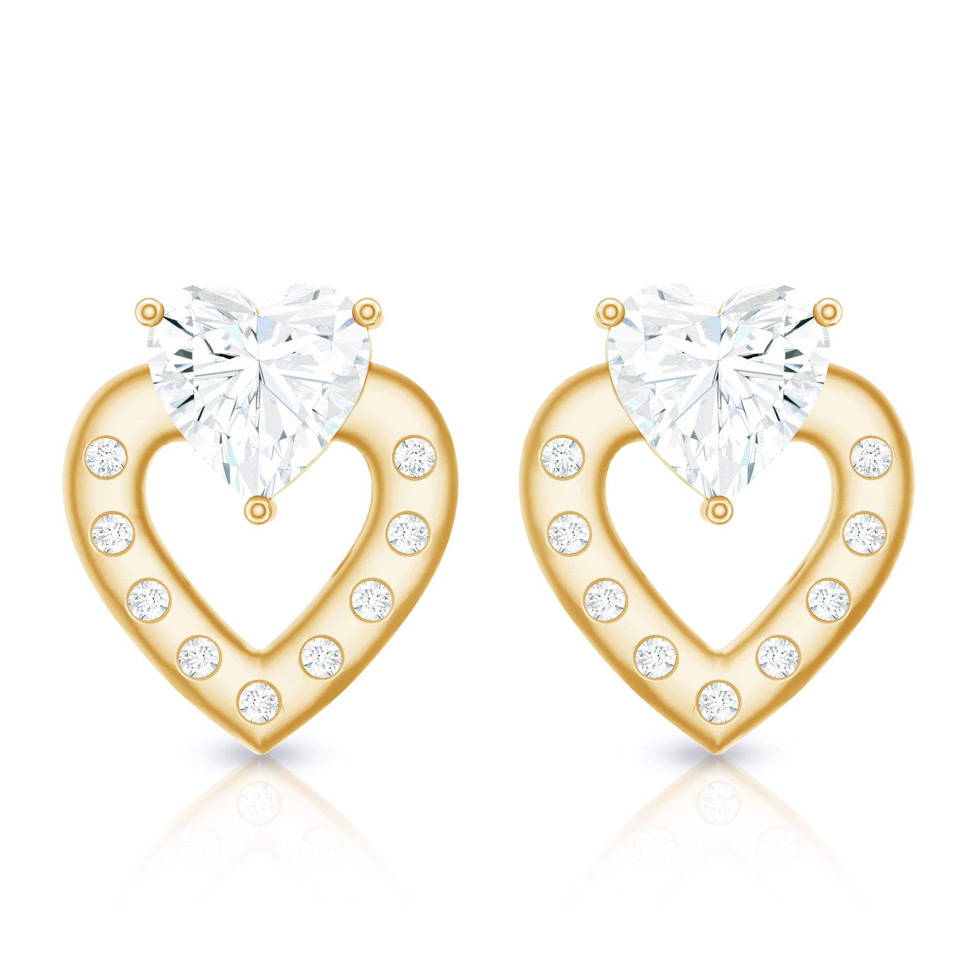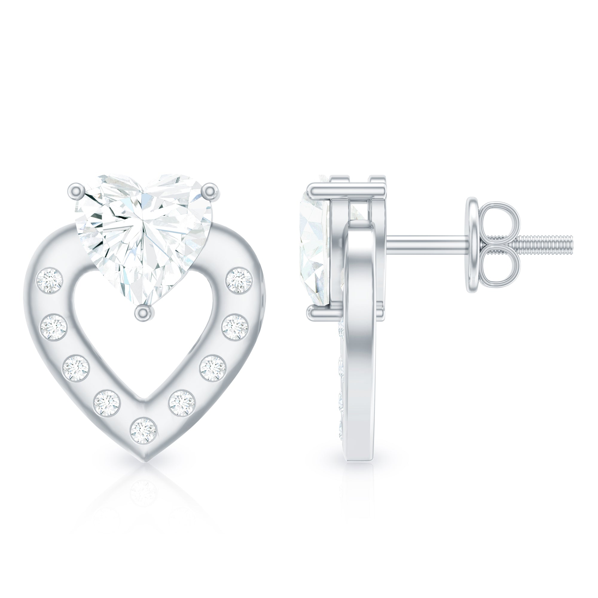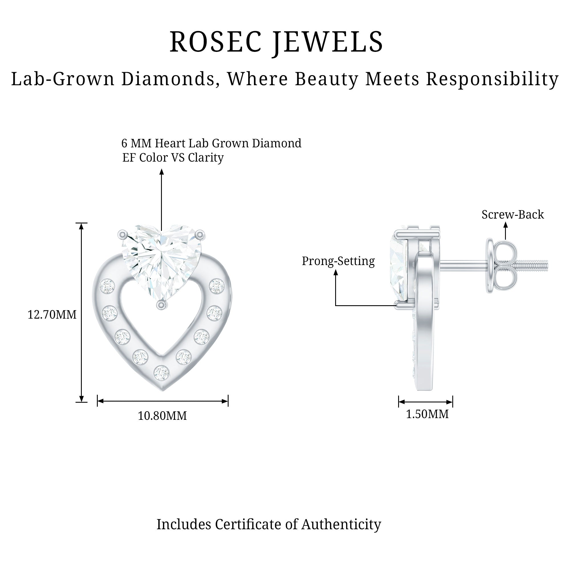 Delight in the beauty of these exquisite Lab Grown Diamond Heart Earrings designed for women. These eye-catching Stud Earrings showcase a 6 MM Heart Shape Diamond gemstone elegantly set in a prong setting, complemented by shimmering round diamonds arranged in an open heart design in a gypsy setting. Crafted with precision, they offer both security and style because of Screw Back Closure. Experience the perfect combination of luxury and ethical craftsmanship with Rosec Jewels, where each piece embodies a narrative of elegance and responsibility. These lab-created Diamond Earrings make a thoughtful and affordable gift for anyone born in April, serving as beautiful Birthstone Earrings. Plus, they come with a jewelry box for safe and stylish storage.