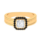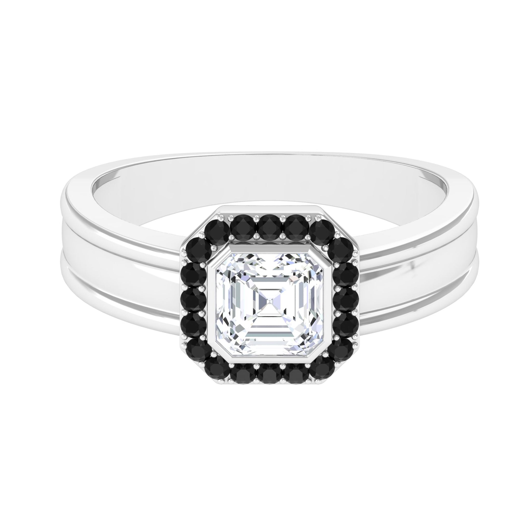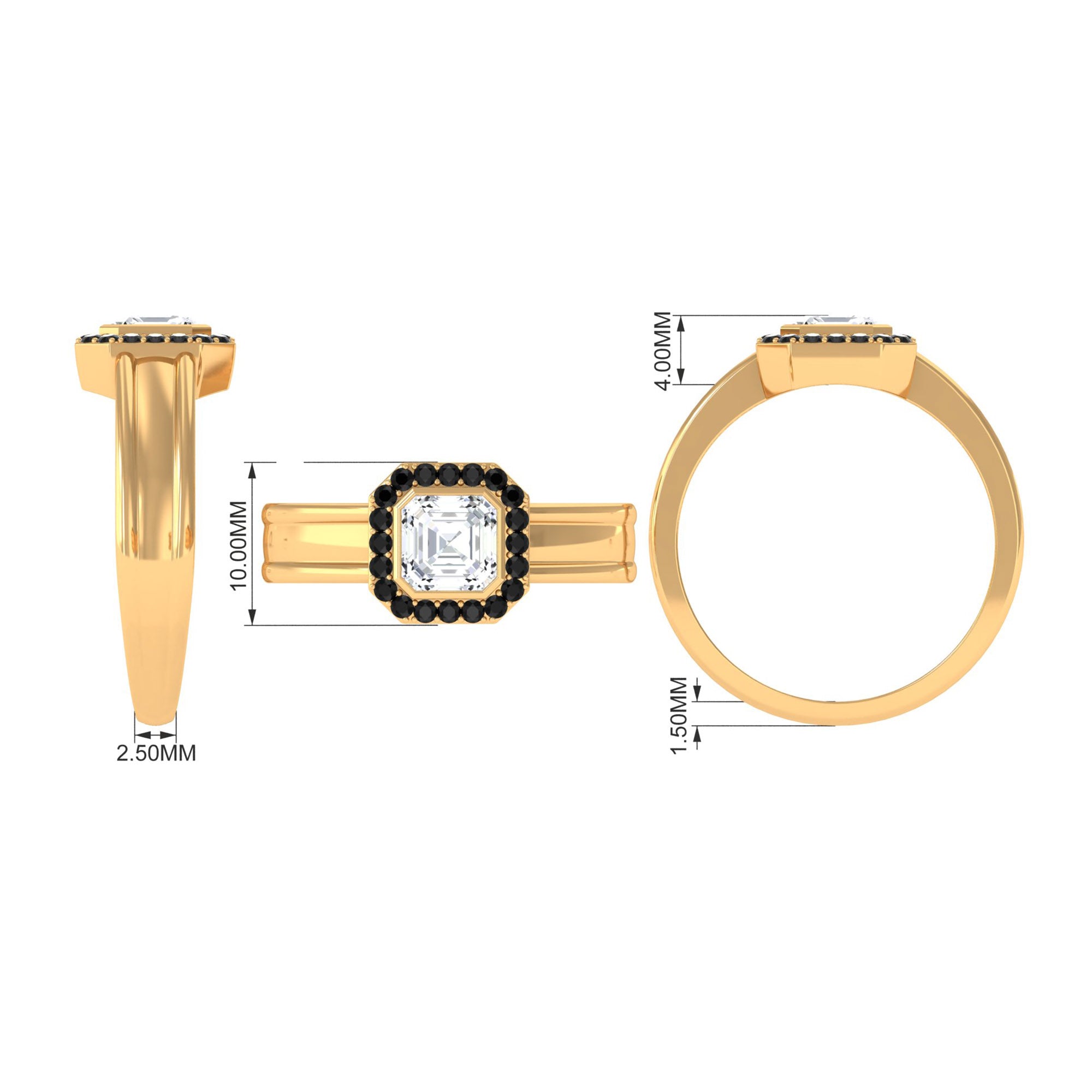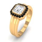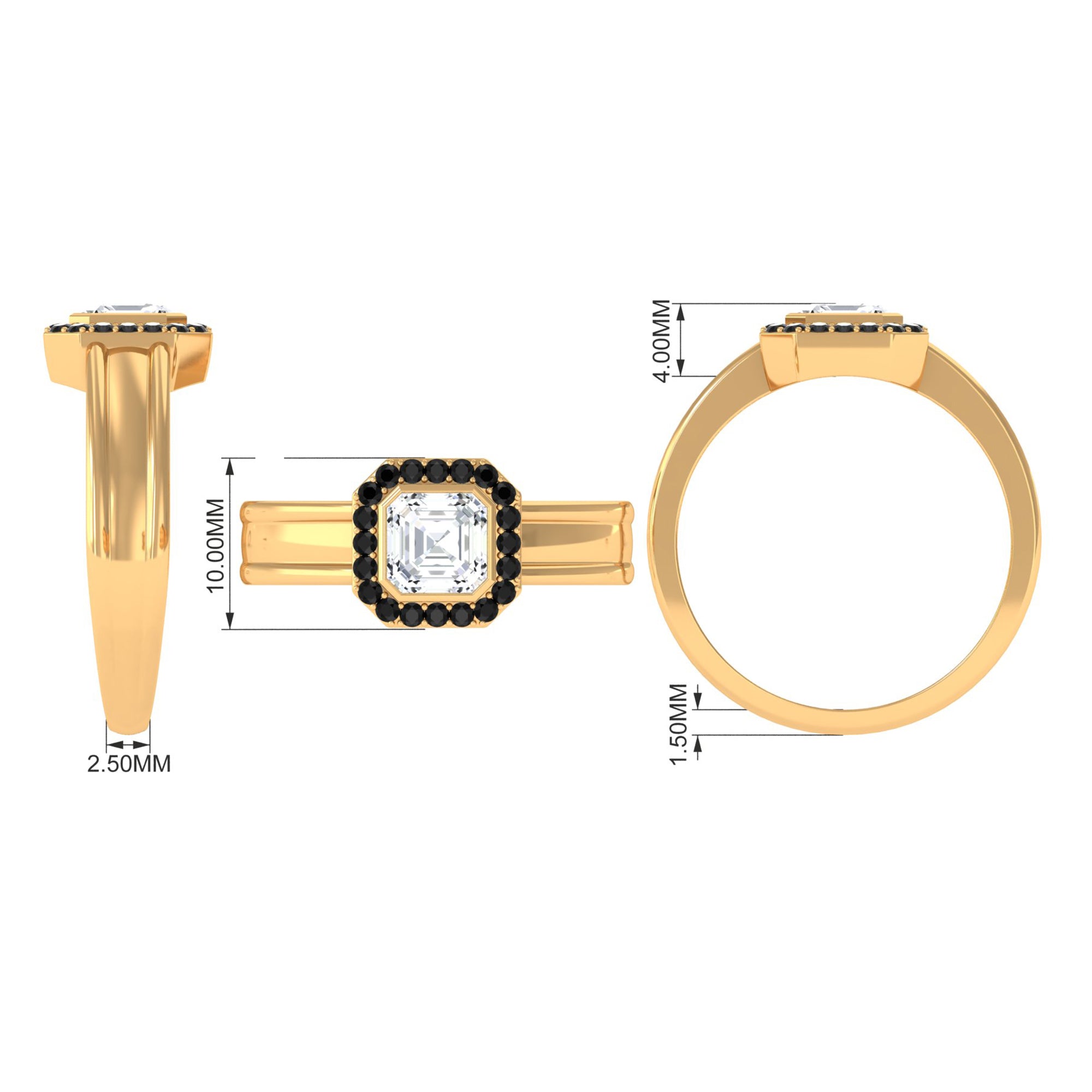 A dazzling moissanite engagement ring with a black diamond that captures the essence of eternal love. A sparkling 6 MM moissanite center stone surrounded by a halo of black diamonds, makes this piece more astonishing. The bezel setting ensures the stability and durability of the center stone. This stunning ring is sure to captivate your beloved. It is a symbol of a love that is as rare and precious as a star, destined to shine forever.