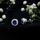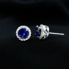 Add glamour to your overall look with these Lab Grown Sapphire Stud Earrings crafted with delicate perfection. They feature a 6 MM Round Shape Lab Made Sapphire securely placed in Prong Setting encircled by a Halo of petite Moissanites, which enhances the earrings beauty. These Halo Stud Earrings exude the classic shine of AAAA quality Lab Created Sapphire that represents wisdom and nobility. The deep hue of sapphire is perfectly accompanied by the bright shine of Moissanite. These Classic Stud Earrings are handcrafted with 14K White Gold Plated Silver. These Screw Back Stud Earrings will be delivered to you in a velvet pouch with a certificate of authenticity.