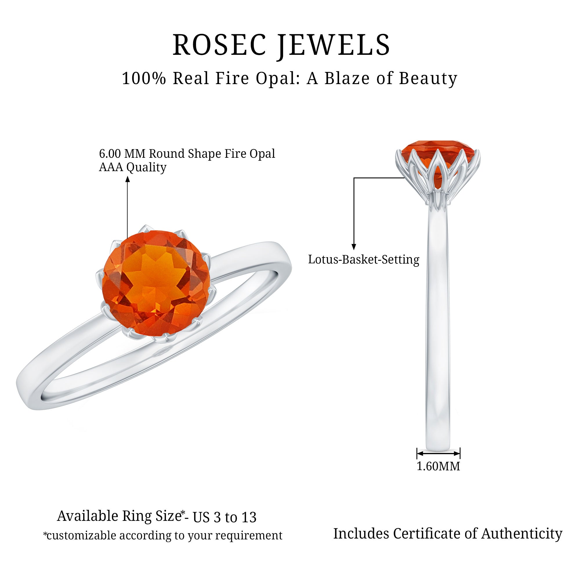 6 MM Round Fire Opal Solitaire Ring in Lotus Basket Setting