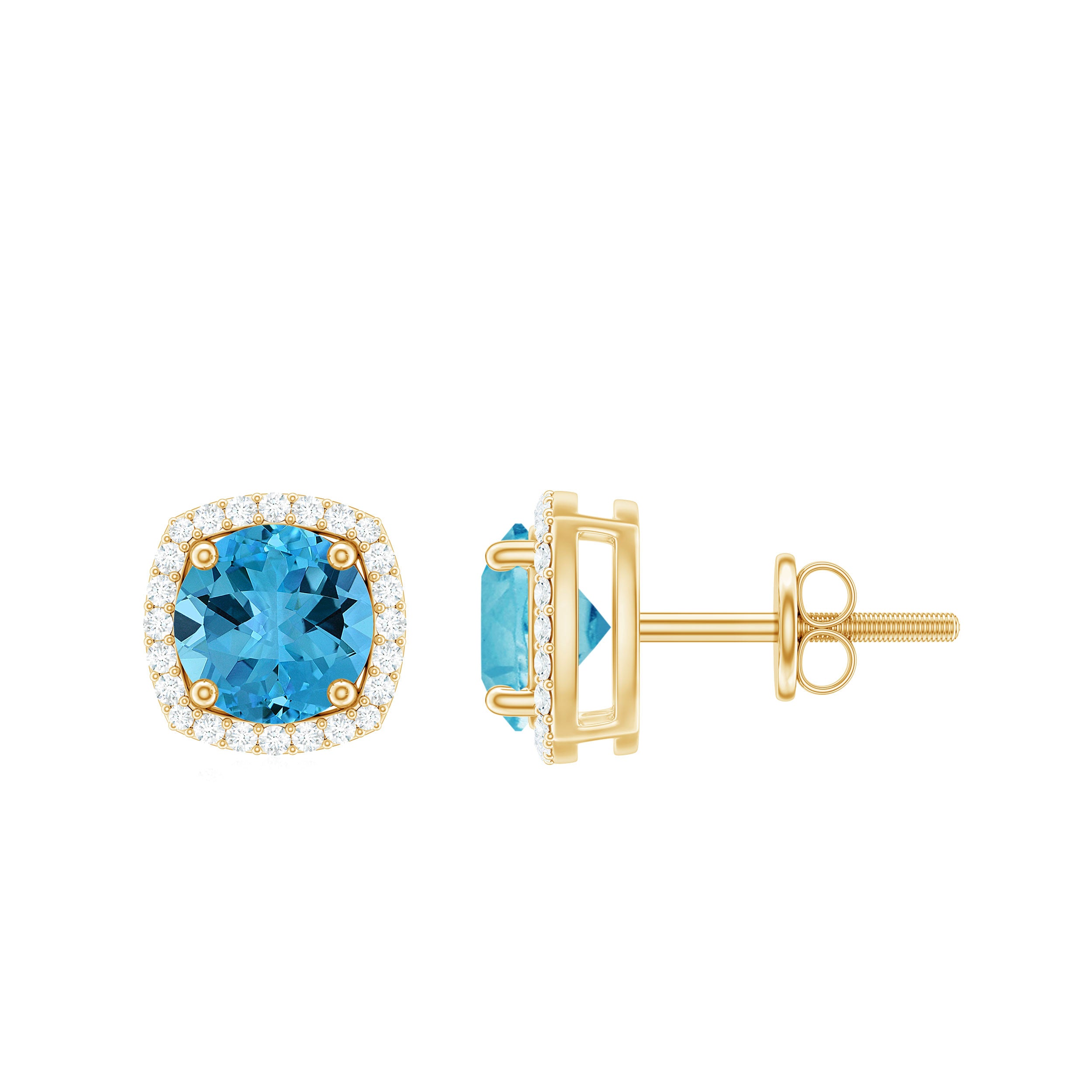 6 MM Round Shape Swiss Blue Topaz Stud Earrings with Diamond Halo