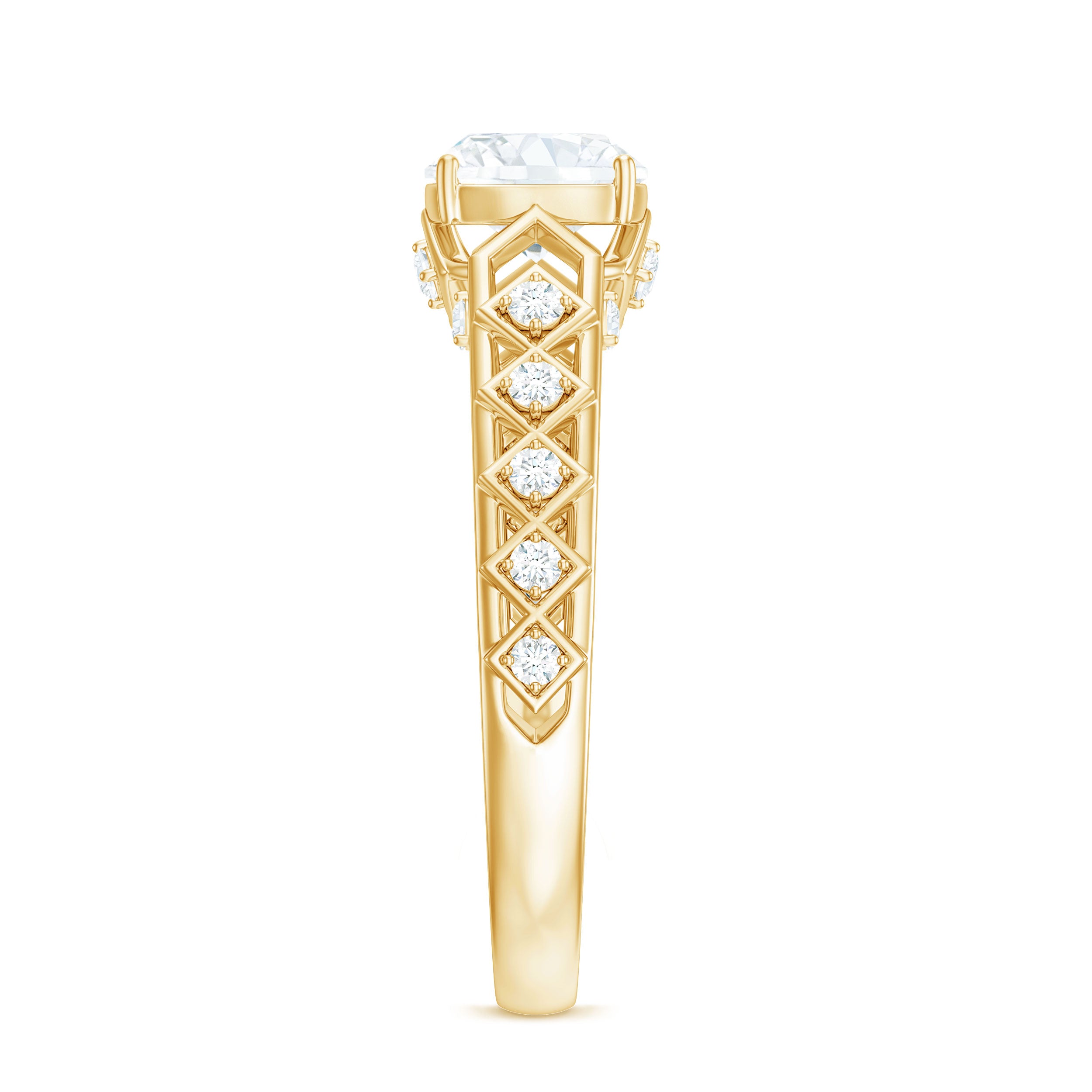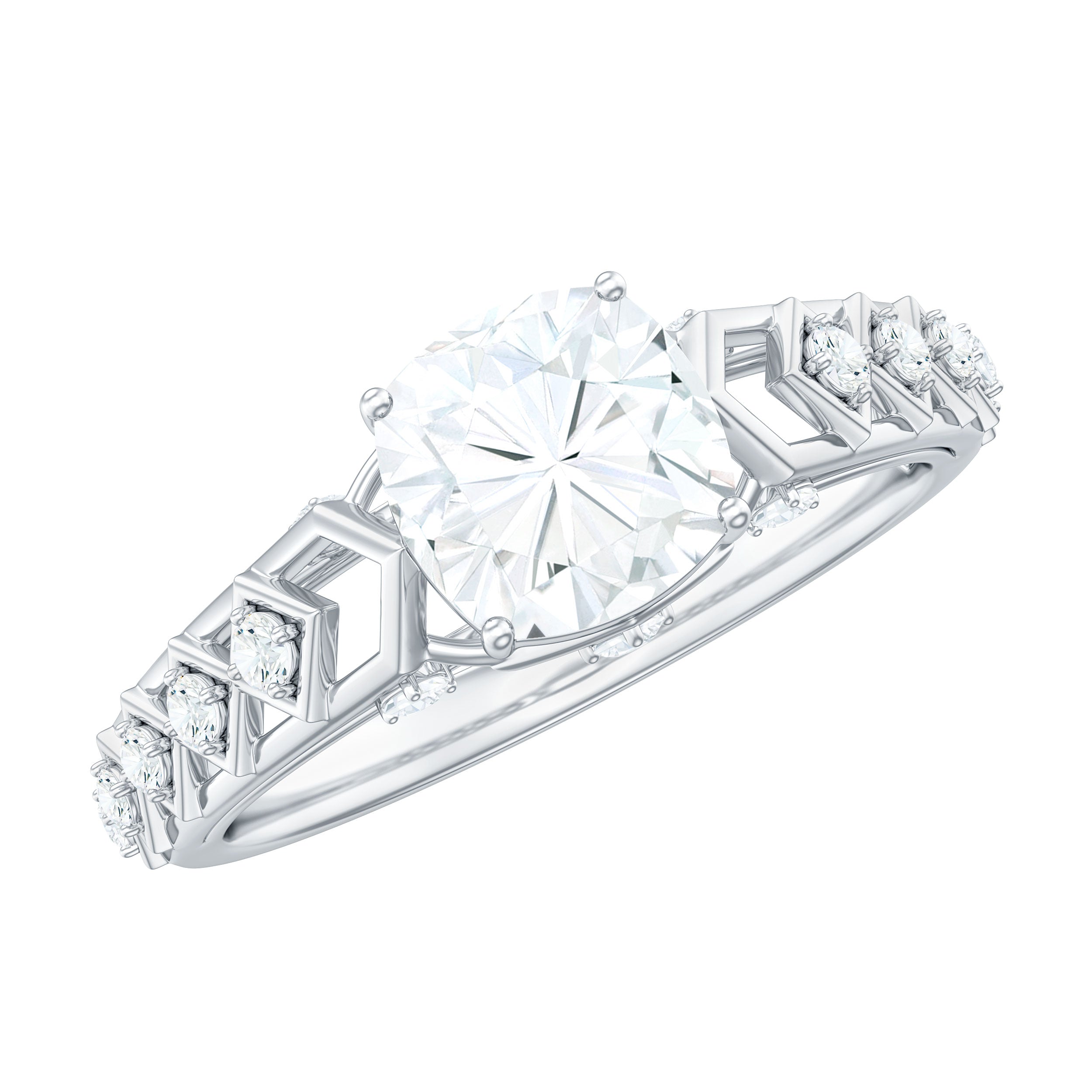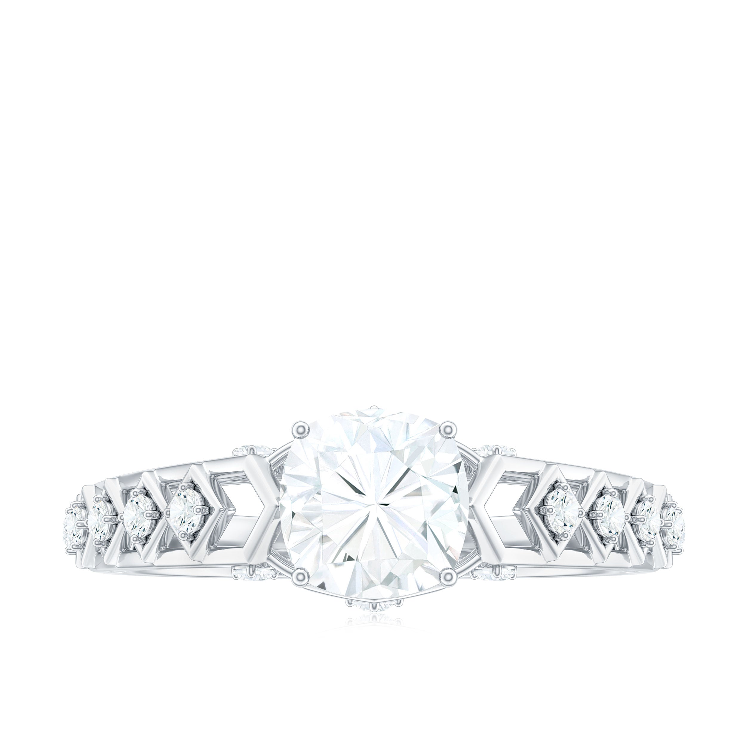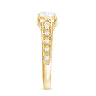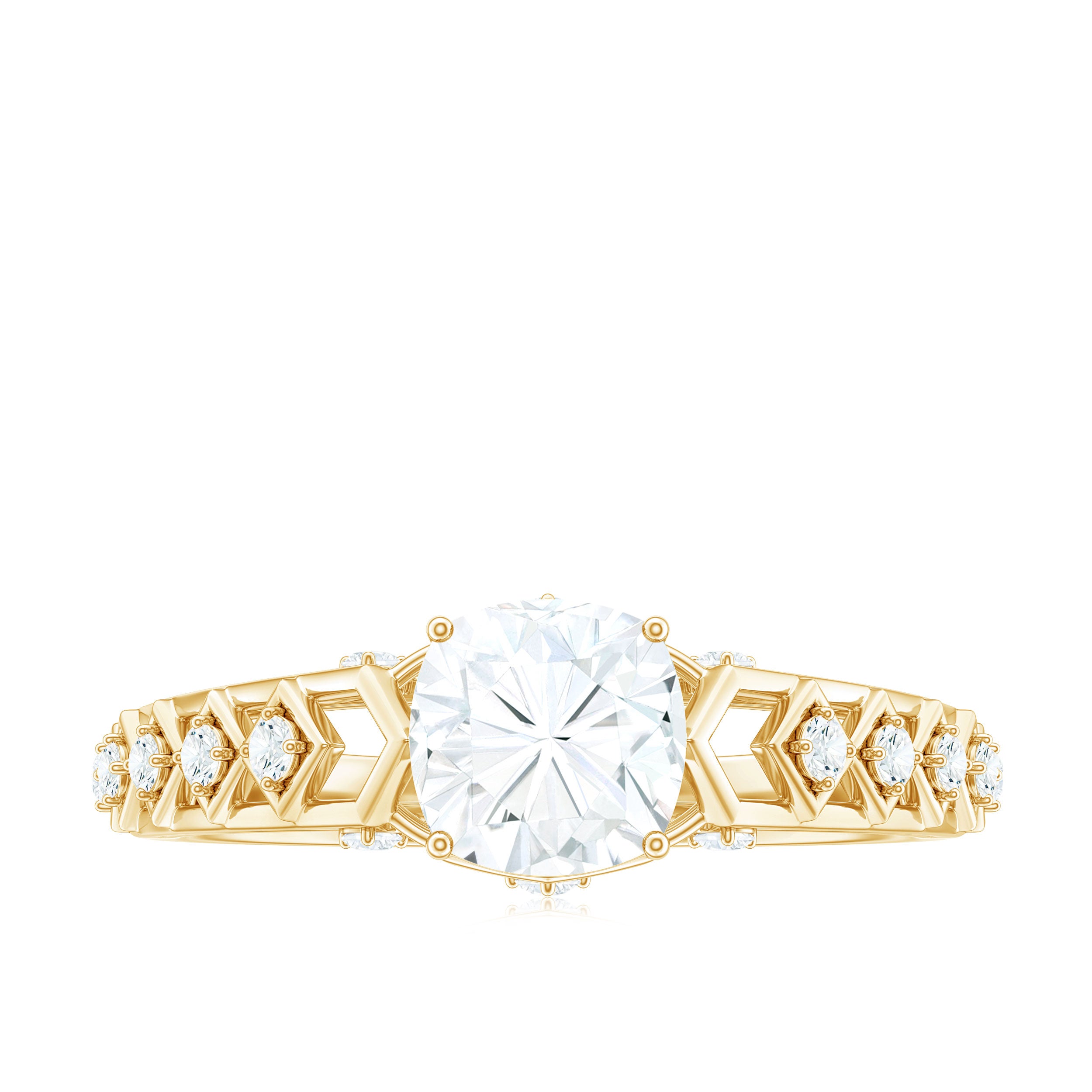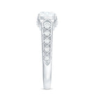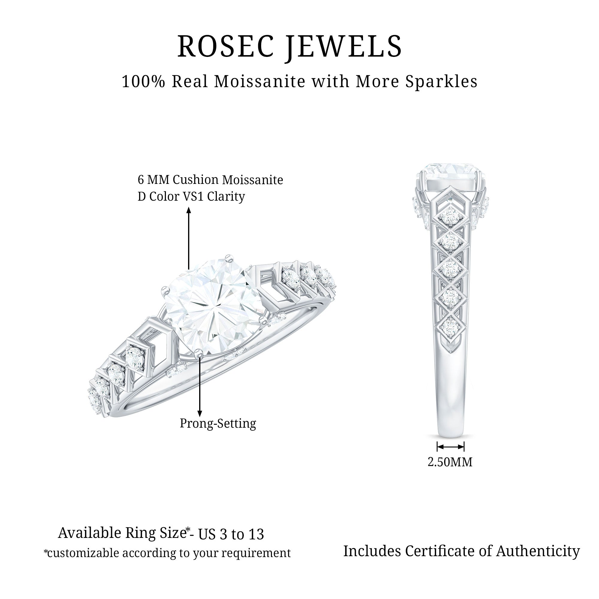 Elevate your love story with this exquisite Art Deco Engagement Ring. Designed with timeless sophistication, this Solitaire Moissanite Ring captures the essence of vintage glamour while offering a bold, modern twist. At its heart lies a captivating 6 MM cushion cut moissanite, renowned for its soft corners and brilliant sparkle. The centerpiece is expertly faceted to maximize fire and brilliance, drawing the eye with every movement. Framing the center stone is an intricate geometric style band that reflects the elegance and precision of the Art Deco era. The openwork design features sharp angles and symmetrical patterns, while the round cut moissanite side stones add just the right amount of sparkle. Crafted with exceptional attention to detail, this Moissanite Engagement Ring balances bold design with refined artistry. Perfect for the non-traditional bride who values artistry, symbolism, and individuality, this Cushion Cut Engagement Ring is more than just an engagement piece, it is a celebration of character and love. Whether youre drawn to its vintage allure or its standout sparkle, this cushion cut moissanite ring is a statement of enduring beauty and unforgettable style. A true heirloom in the making, it promises to be cherished for generations to come.