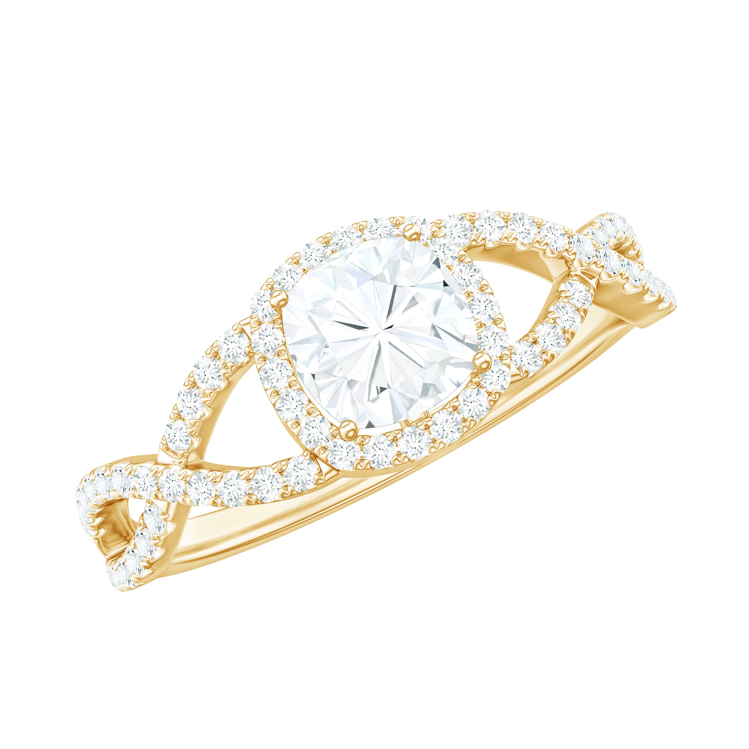 Given the purity and unconditional nature of your love for her, why not select this Halo Ring to convey your emotions. The Crossover Engagement Ring showcases a 6mm cushion cut Moissanite set in a 4-Prong Setting, enhanced by the Halo design, while the crossover shank is embellished with side stones both having tiny round shape moissanites, making it a more attractive choice for her. This Halo Engagement Ring has a total weight of 2 ct, featuring D Color and VS1 Clarity quality. Having a classic design, this Moissanite Halo Ring has a modern style and unique aesthetic that enhances the beauty of your special day. Brilliantly catching the light, this Moissanite Engagement Ring is a treasure hunt that symbolizes the unwavering growth of your love. Having a timeless appeal, this Womens Moissanite Ring captivates admirers with the mesmerizing play-of-color and has a classy way to showcase your love with the state-of-the-art deco design.