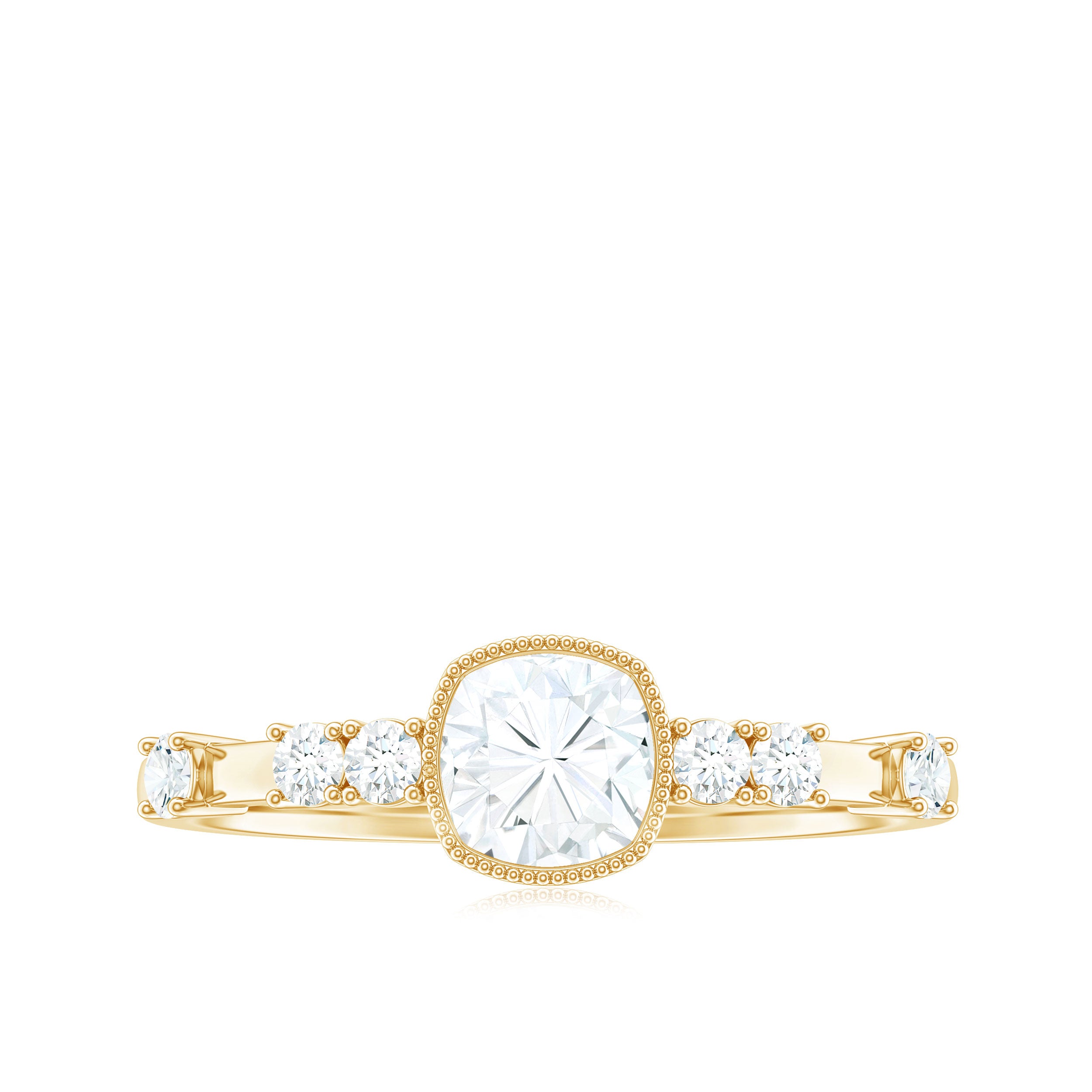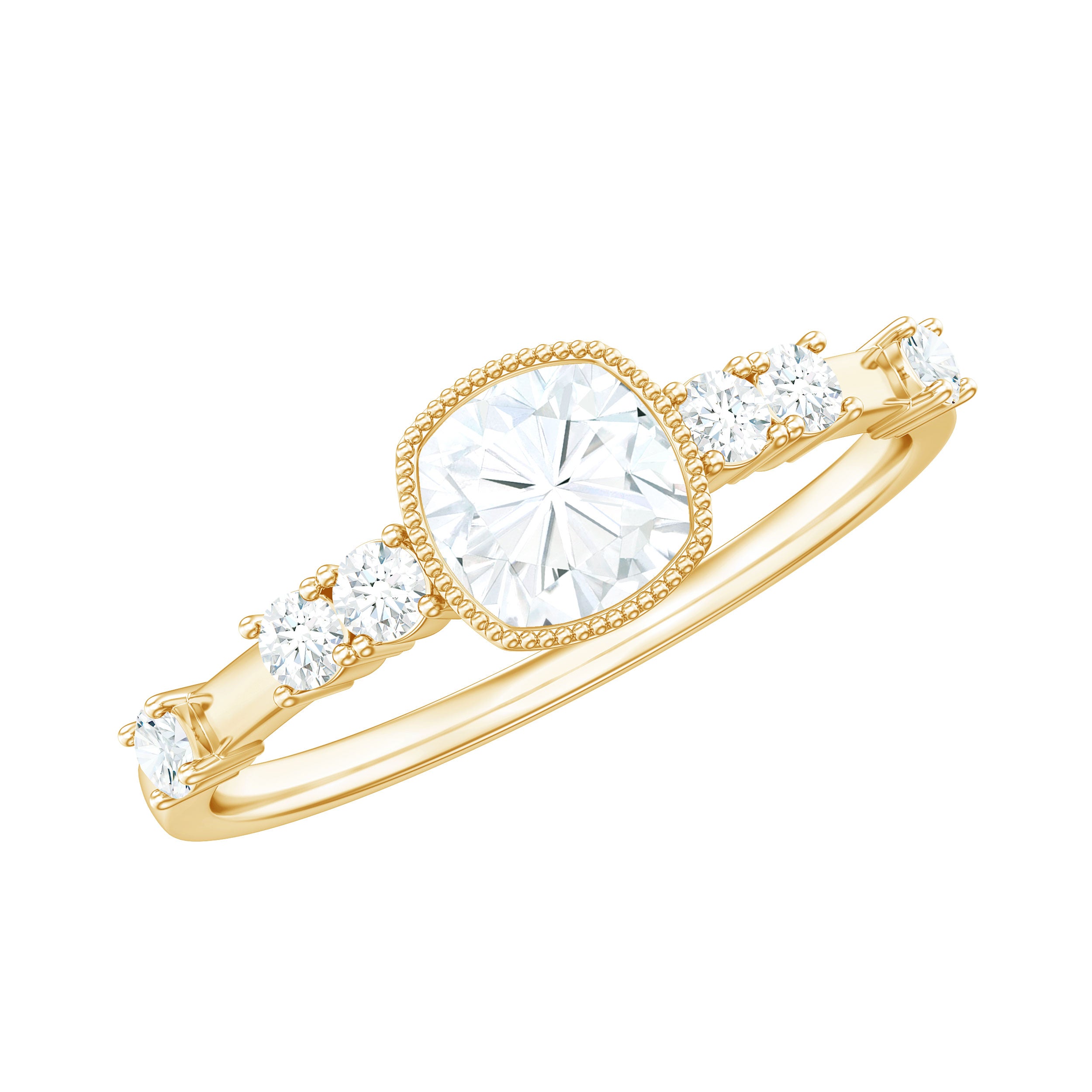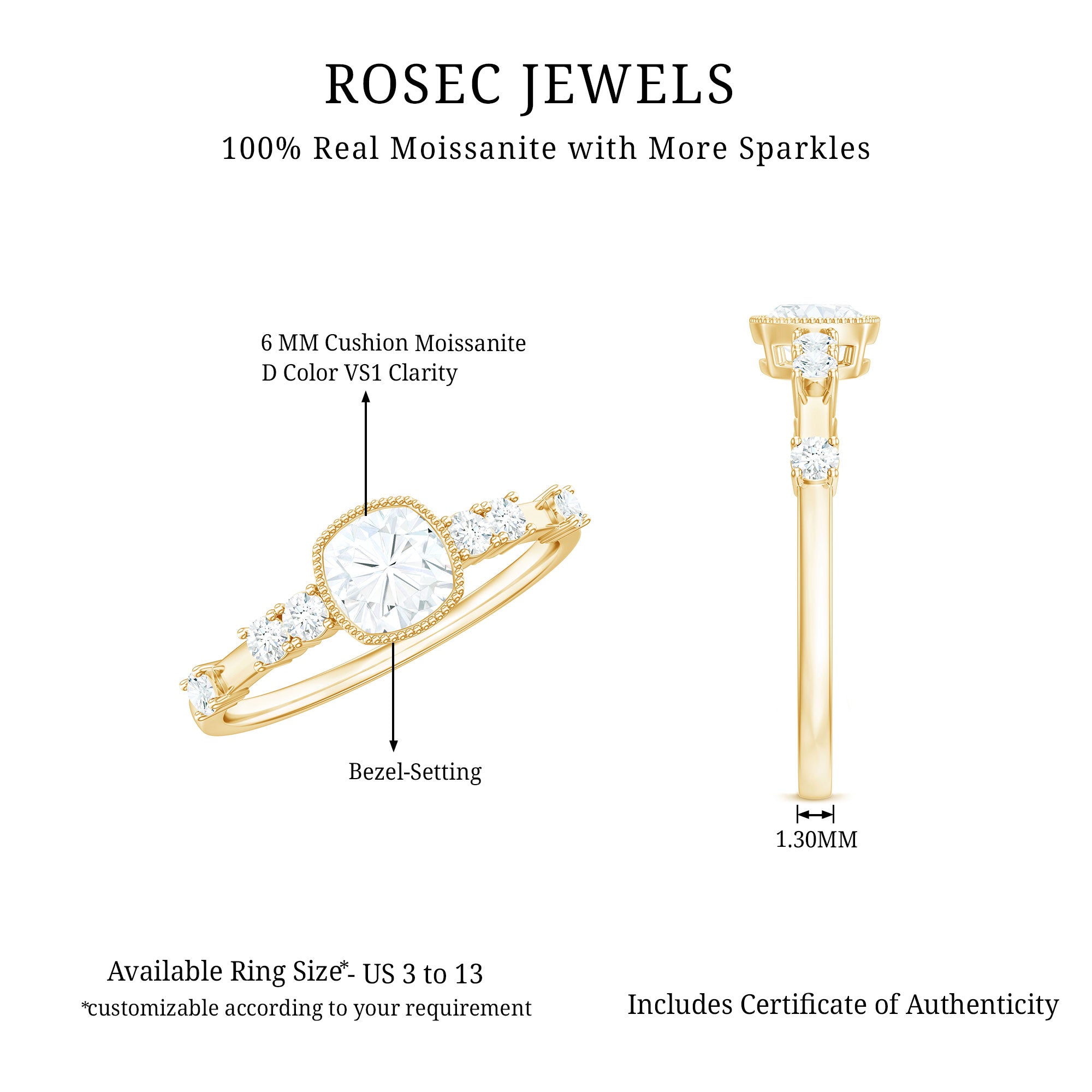 Add some sparkle to your life with this enchanting Solitaire Engagement Ring, featuring 6mm cushion cut Moissanite set at the center in a bezel setting surrounding with a beaded frame. This sparkling Cushion Cut Moissanite Ring has a shank embellished with round shape moissanite on both sides give extra brilliance to the ring. The tiny beaded details surrounds the center gem to add a vintage feel and make the Moissanite Engagement Ring stand out. Moissanites has D color VS1 clarity have same shine and brilliance as natural diamonds at affordable prices. Make your day more special with this outstanding Cushion Cut Engagement Ring, designed to feel confident and comfortable whole day long. This piece is designed by experts, with quality checked moissanites set in a secure settings make this Solitaire Moissanite Ring more valuable and special. This Beaded Engagement Ring is available in various sizes and comes in a beautiful jewelry box with certificates. Flaunt it on any occasion like, party, engagement, wedding, anniversary etc.