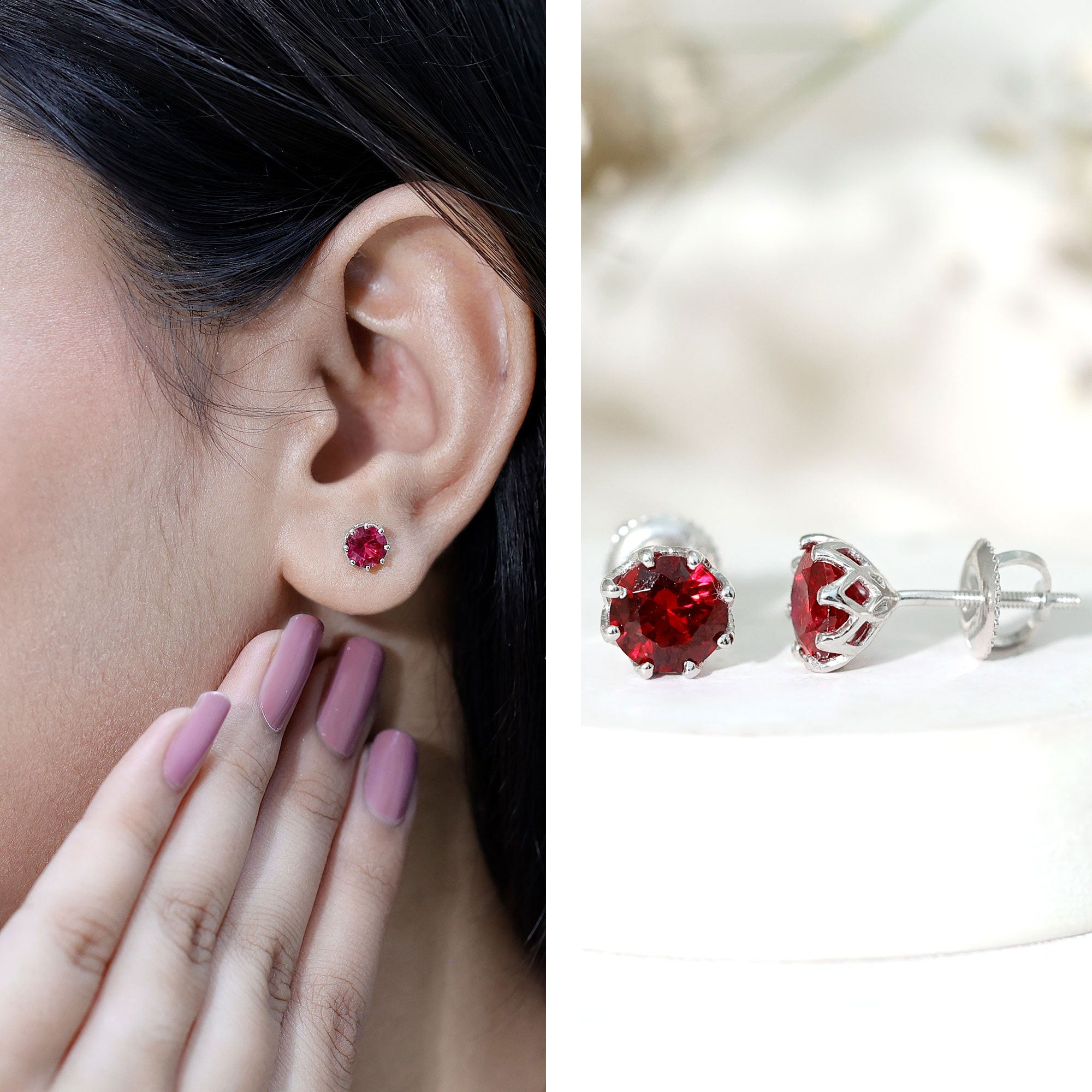 Add a touch of timeless beauty to your look with these Solitaire Ruby Earrings. Each earring features a 6 MM round cut lab created ruby that shines brightly and adds a pop of color. The rubies are set in decorative setting, making them a designer piece of everyday jewelry. These Ruby Stud Earrings are lightweight and comfortable, designed with a secure screw back closure to keep them safely in place all day. You can wear them to work, casual outings, or evening events, and they will complement any outfit effortlessly. Their versatile design makes them a perfect addition to your jewelry collection. Crafted with AAAA quality lab created rubies, these Solitaire Earrings are bright, durable, and ethical. They offer the beauty of natural rubies while being eco-friendly and budget-friendly. This pair goes through careful inspection to ensure the stones are authentic and of high quality, giving you confidence in your purchase. The Red Stone Earrings come in a signature jewelry box, making them an ideal gift for a loved one or a special treat for yourself.