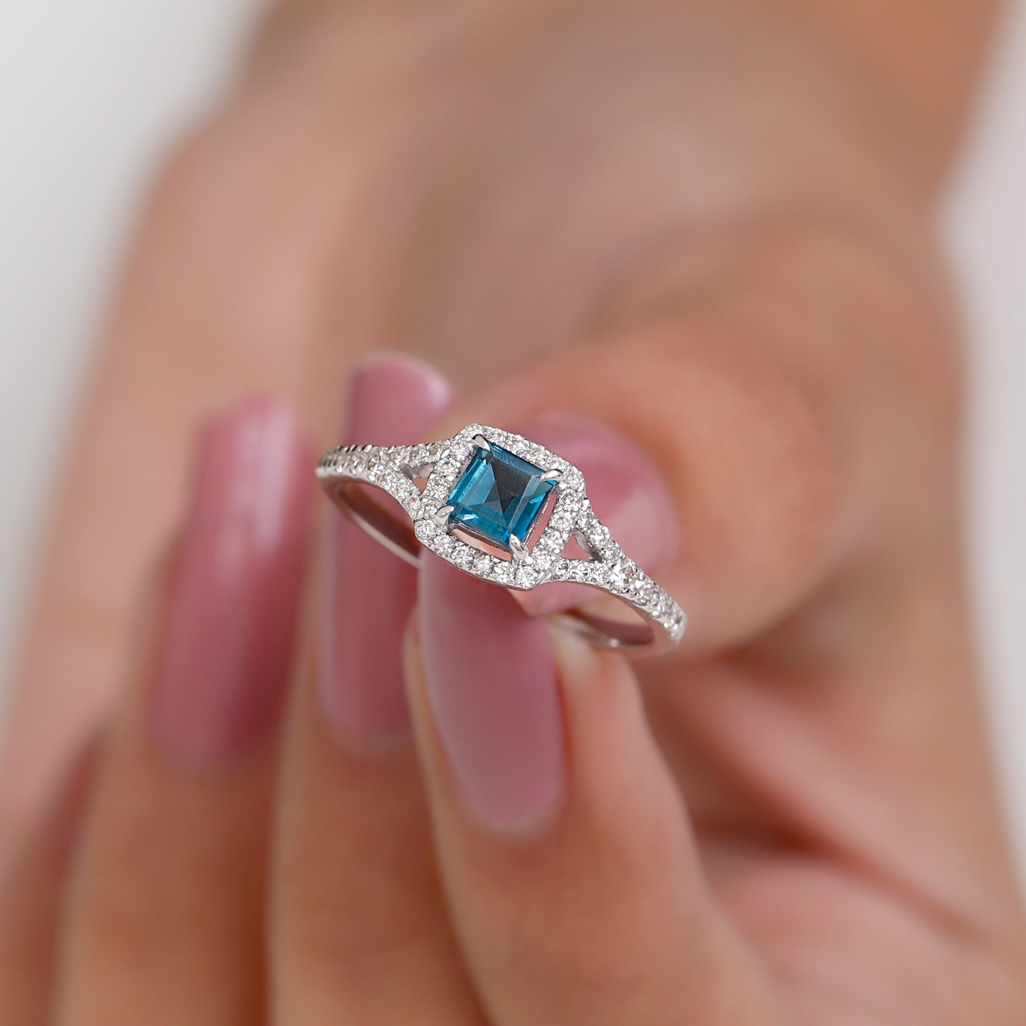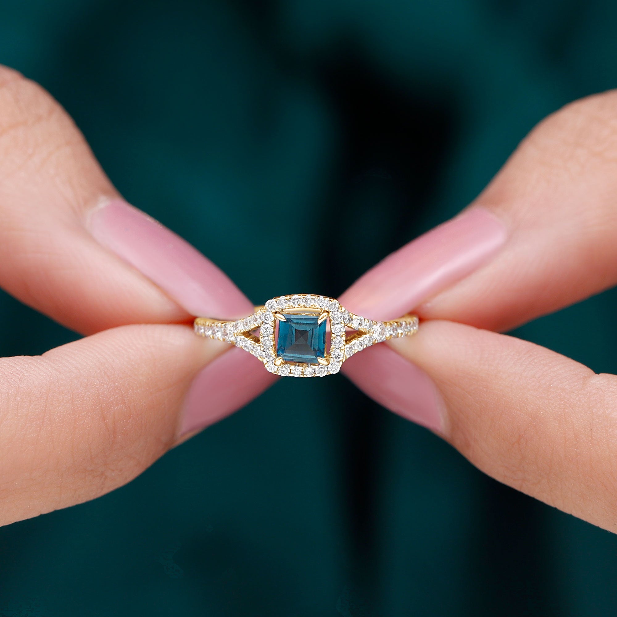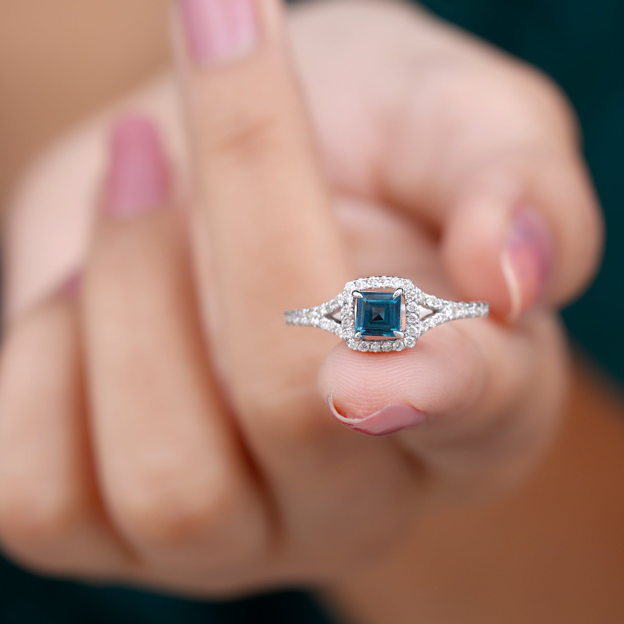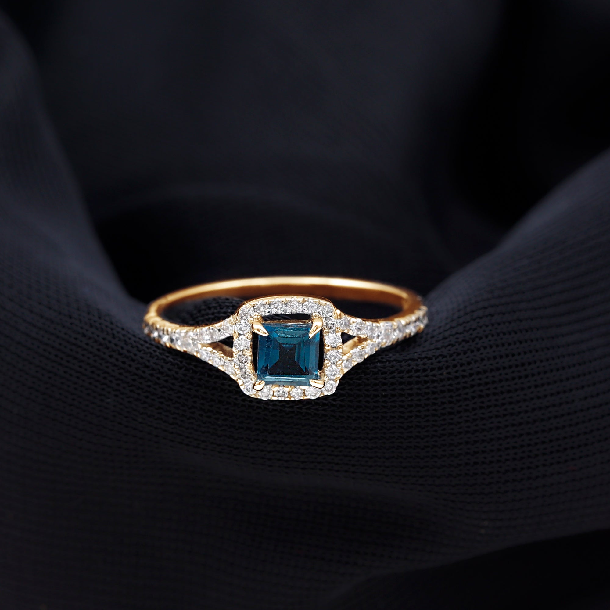 This stunning Square Engagement Ring serves as an excellent means to convey your affection to your beloved. At its core lies a 6 MM Princess cut London Blue Topaz, securely held in a claw setting surrounded with small round shape diamonds set as halo style. The Split Shank Engagement Ring features a open shank band, embellished with round cut Diamond stones. Meticulously crafted, this London Blue Topaz Engagement Ring exudes a designer aesthetic and refined details, making it perfect for anyone in search of something unique and striking. Whether you are proposing or celebrating a significant milestone, this Split Shank Ring is intended to radiate and be treasured for a lifetime. It offers remarkable brilliance, durability, and timeless elegance without exceeding your budget. The Princess Cut Blue Topaz Ring is presented in an exquisite jewelry box, ideal for gifting. Additionally, you will receive a certificate of authenticity for the stone, ensuring your confidence in your purchase. This fashionable and Halo Engagement Ring is designed to shine in every aspect, just like your love.
