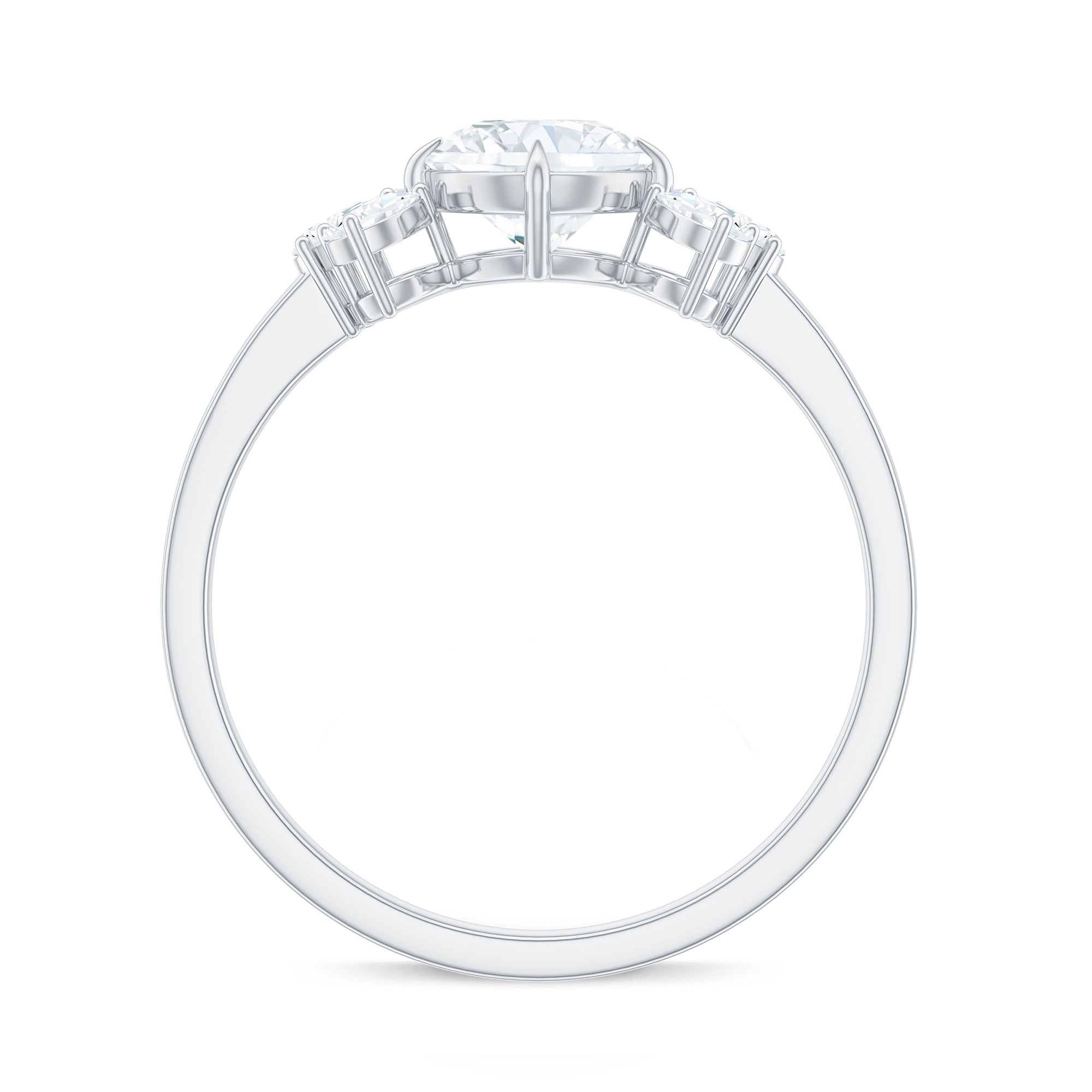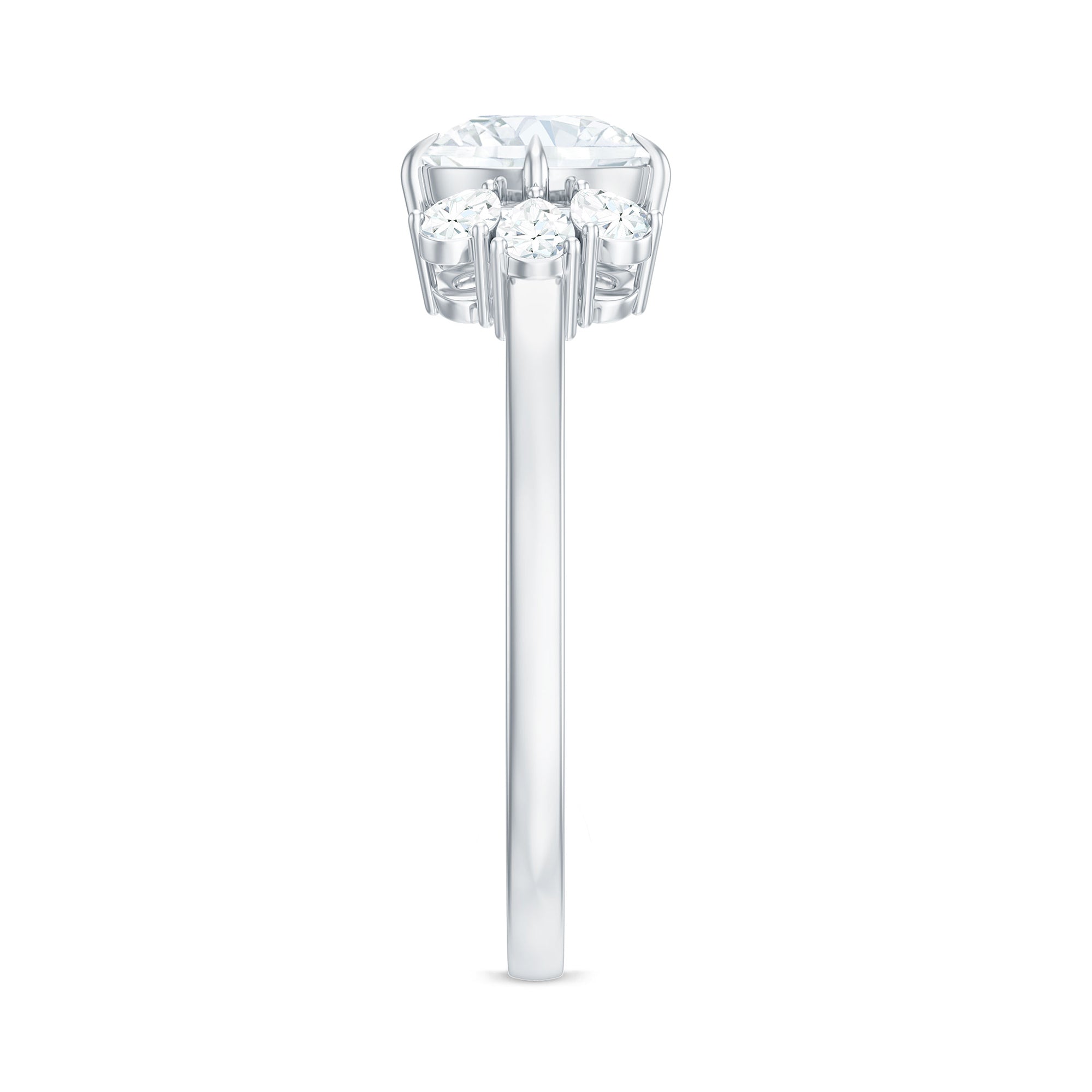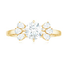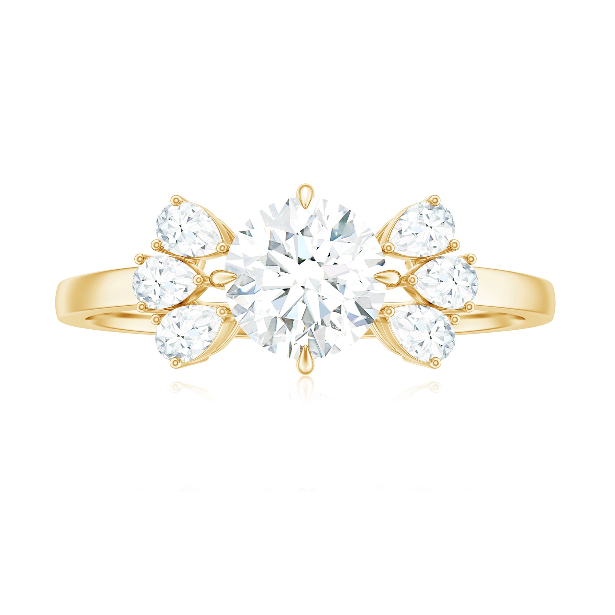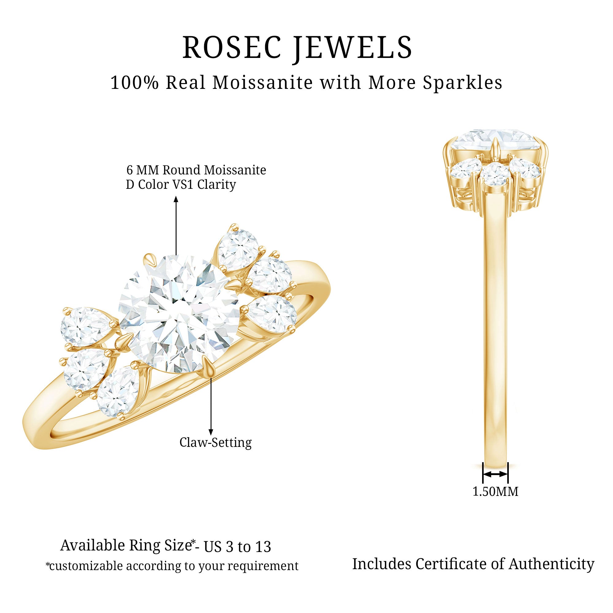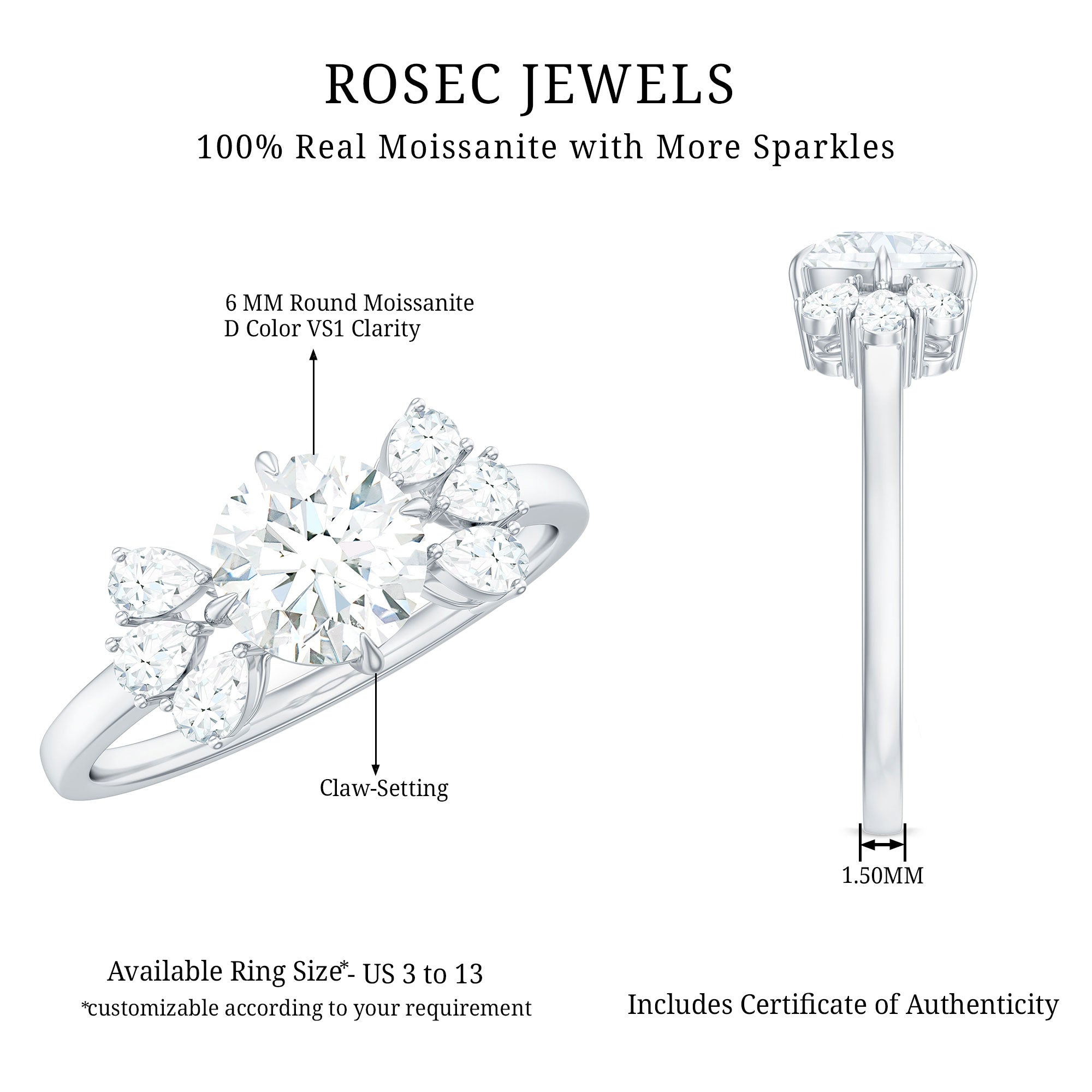 Make an entrance with this brightly polished Moissanite Engagement Ring. At the center of this romantic piece glows a brilliant 6MM round cut moissanite, cradled in secure claw setting. On each side of the center stone, dainty trios of pear shape moissanite stones shimmer like drops of light, symbolizing the past, present, and future of your promise. Their sparkle adds a graceful balance to the design, while the soft curves of the band bring a sense of flow and harmony. Every stone in this Cluster Engagement Ring is offering the brilliance and fire of fine jewelry with a more thoughtful, sustainable choice. The D-VS1 quality moissanites offer outstanding clarity and a dazzling brilliance, rendering this piece an extraordinary selection in terms of both sentiment and visual appeal. Whether you are solidifying a commitment, expressing love, or offering a meaningful present, this Certified Engagement Ring tells a story of connection and consideration. Carefully designed with an emphasis on precision and a modern flair, this Moissanite Ring for Women is presented in an elegant jewelry box, making it perfect for personal enjoyment or as a gift. With its floral charm and timeless design, it is a ring meant not just for adornment but also for everlasting appreciation.