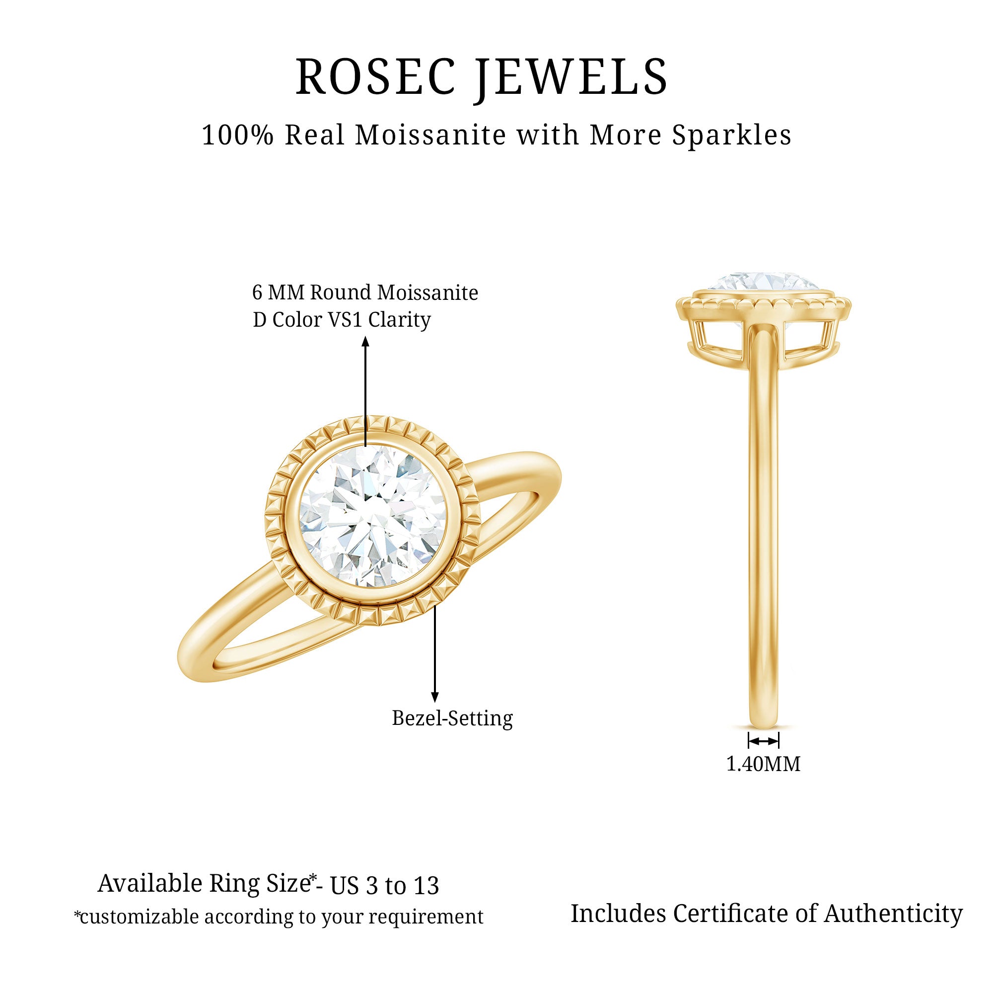Symbolizing eternal love and telling your unique love story, this Moissanite Engagement Ring is the perfect way to start your journey together. Its elegant design catches the light with every move, featuring a D Color VS1 Clarity Moissanite that dazzles with its brilliance and shine. This Solitaire Engagement Ring showcases a 6 MM round cut moissanite in bezel setting surrounded with engraved style frame. Both classic and modern, this 1 Carat Moissanite Ring represents commitment and honors the lasting connection between you two. With its versatile design, this Round Moissanite Ring is both understated and chic, making it an excellent choice for a solitaire ring, a birthday gift, or everyday wear. We provide a variety of metal options for you to select from. Moreover, this Bezel Set Engagement Ring is available in different ring sizes according to US standards, ranging from 3 to 13. The timeless ring adds a hint of simplicity and classic elegance, making it perfect for any occasion. Its allure makes this Solitaire Moissanite Ring suitable for any event, whether it is an Engagement, Wedding, or Anniversary.