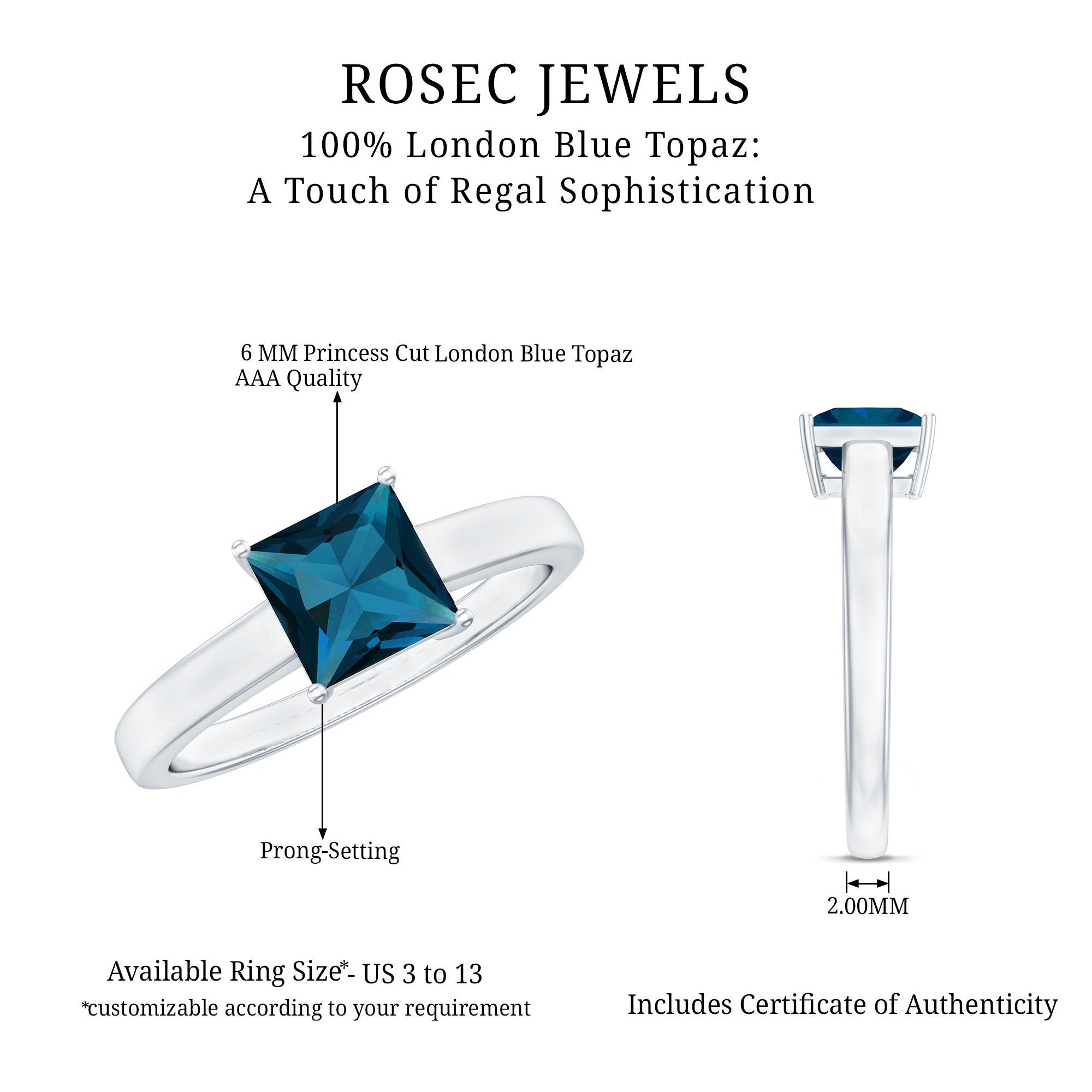 This 6mm square cut London blue topaz solitaire ring is designed for those who appreciate saturated color and structured simplicity. The rich, inky-blue hue of London blue topaz creates a striking focal point, while the solitaire style keeps the overall look clean and intentional.