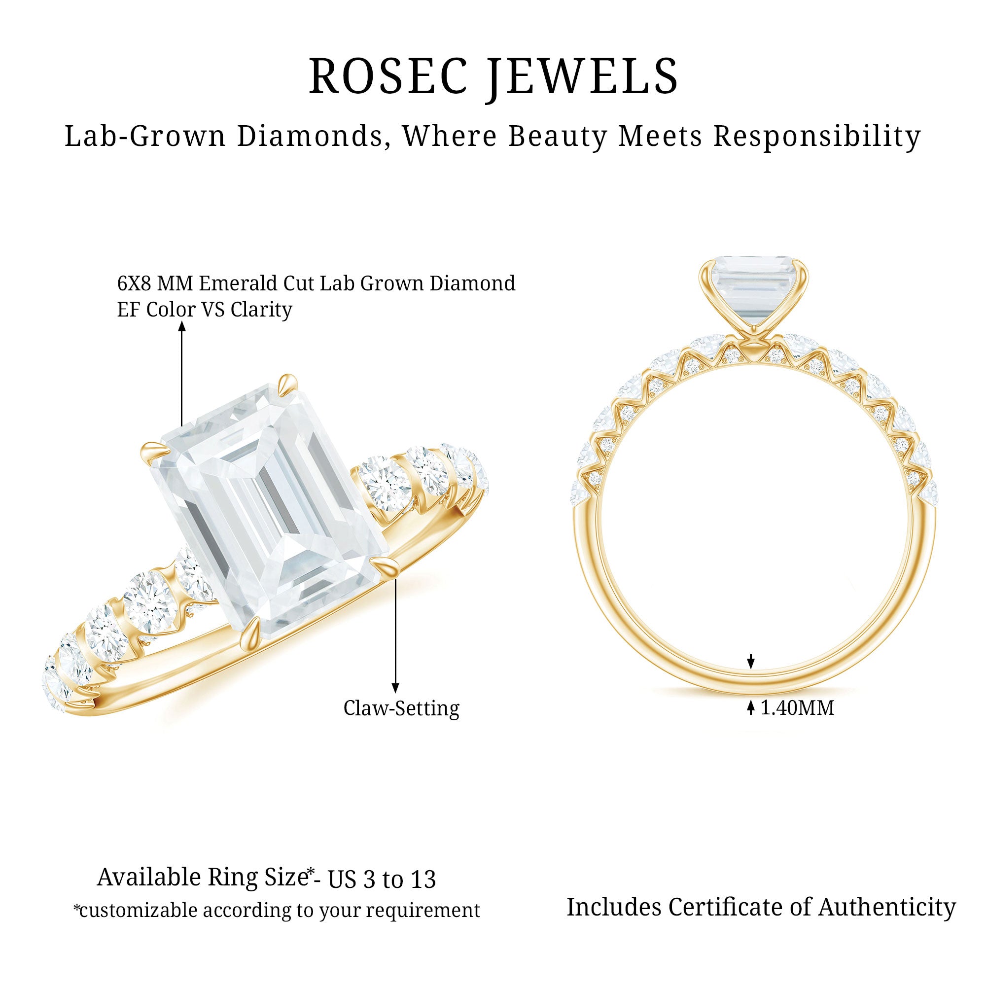 6X8 MM Emerald Cut Lab Grown Diamond Engagement Ring with Accent