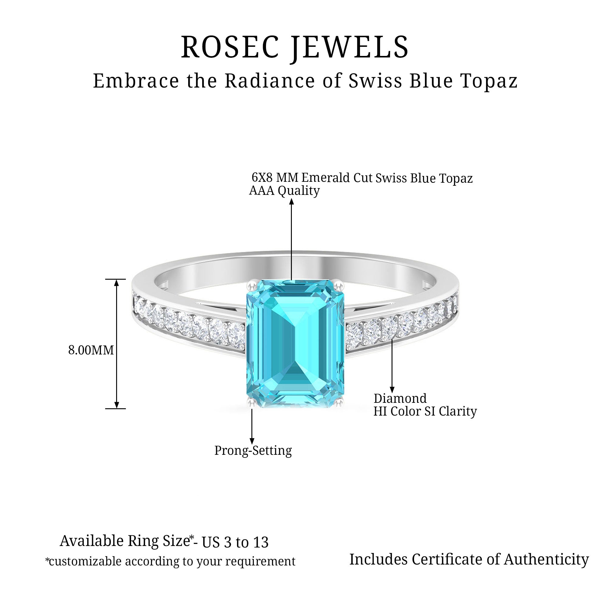 6X8 MM Emerald Cut Shaped Swiss Blue Topaz Solitaire with Diamond Side Stone Ring