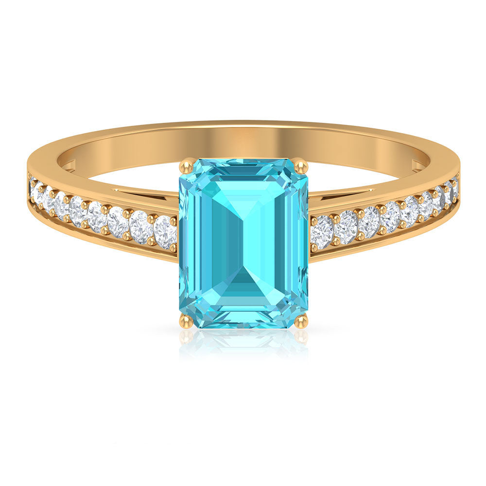 Dazzle around in this Solitaire Engagement Ring studded with a 6X8 MM Emerald Cut Solitaire of Swiss Blue Topaz, birthstone of the month December accentuated by Diamond side stone which will enhance your ensemble.
