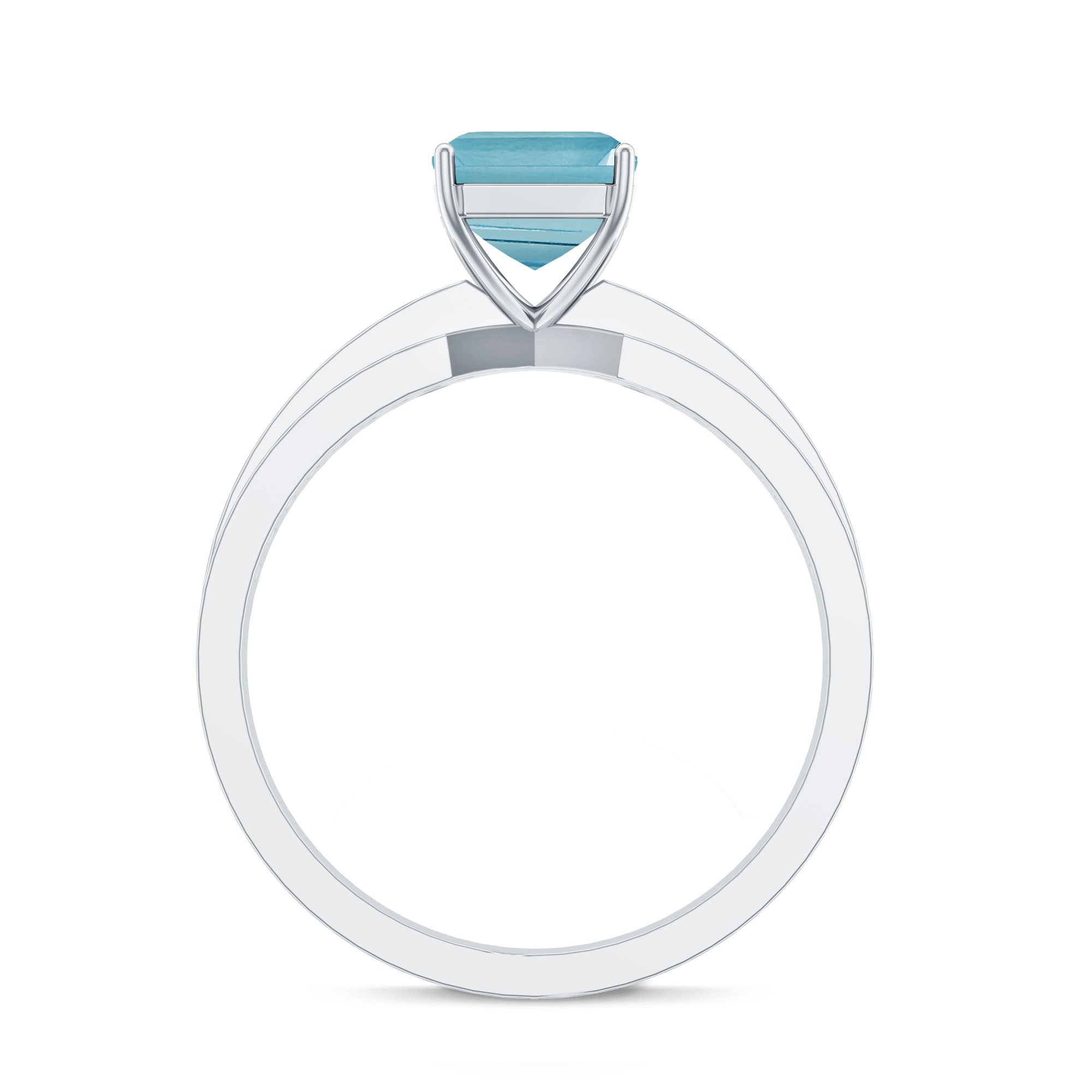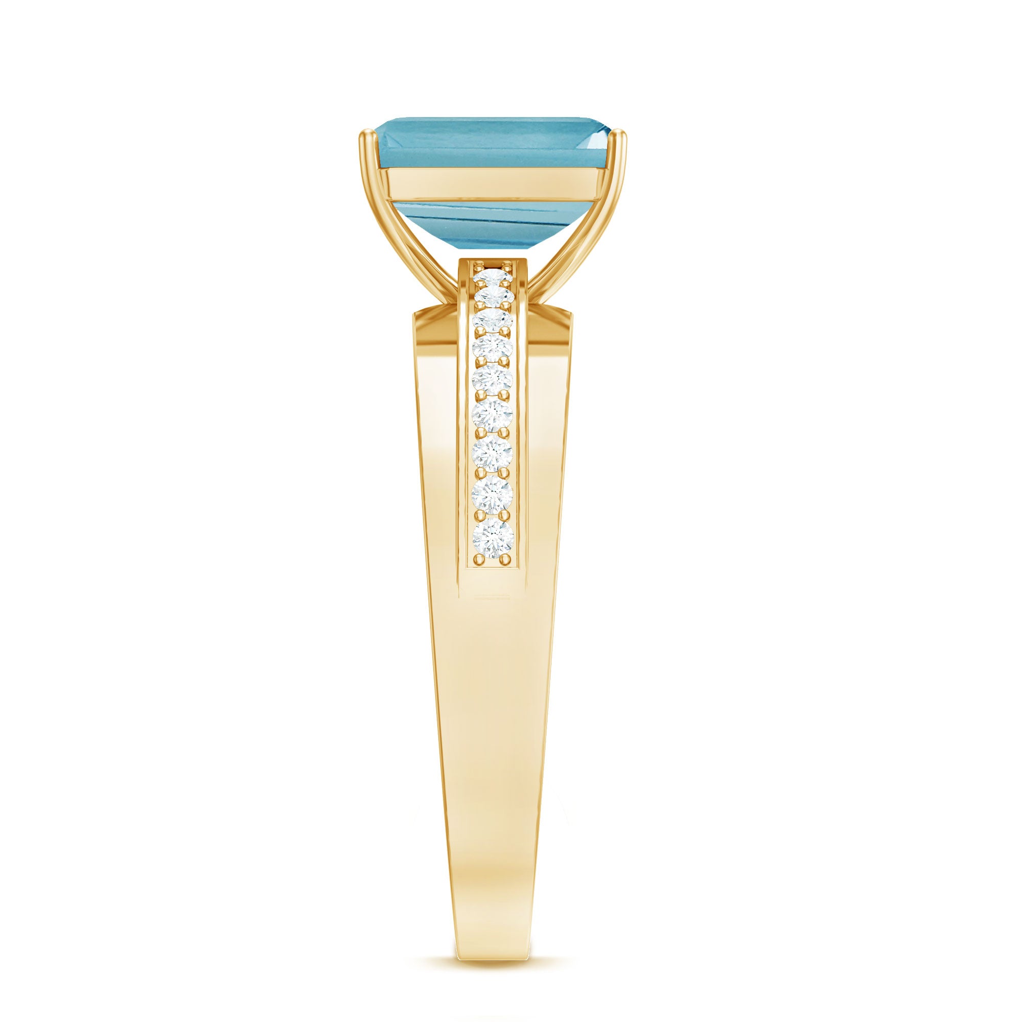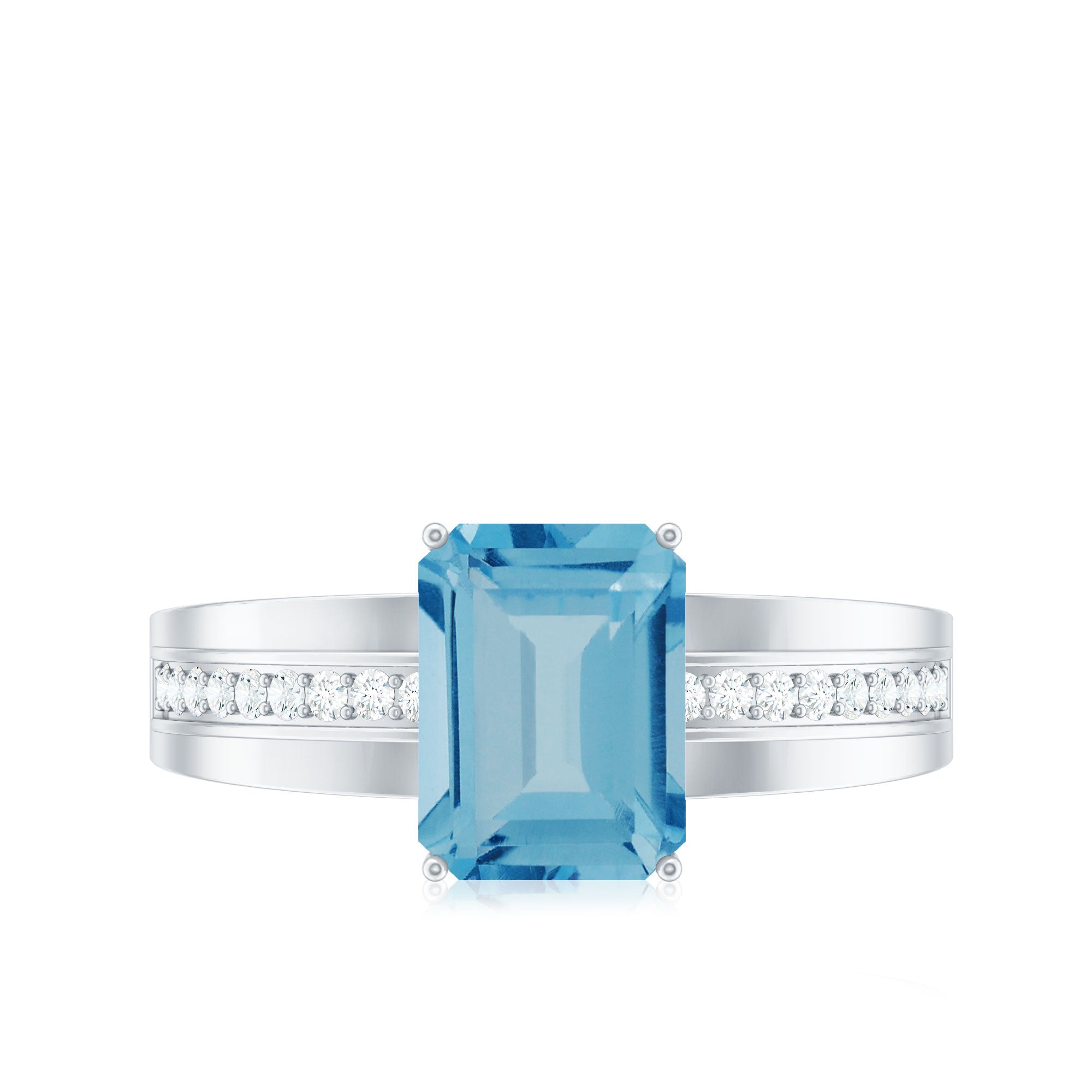 This Two Tone Engagement Ring is embellished with Emerald Cut Swiss Blue Topaz Gemstone is set as Solitaire in a Prong Setting with Brilliant Round Shape Diamonds are set as Side Stones, crafted in a Solid Gold Metal.