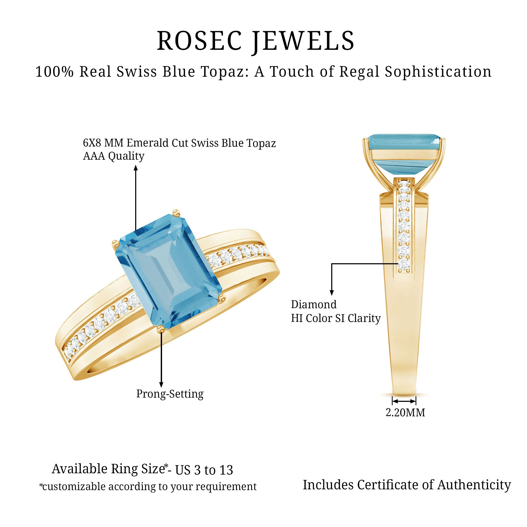 6X8 MM Emerald Cut Swiss Blue Topaz Solitaire with Diamond Two Tone Ring