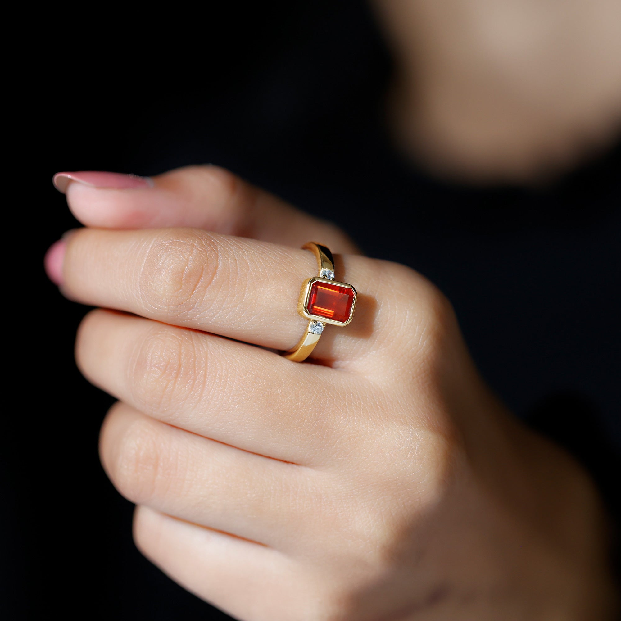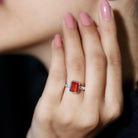 Adorn your better half with this phenomenal and elegant Fire Opal Emerald Cut Engagement Ring. It features 6X8 MM octagon-cut fire opal set in Bezel Setting with Diamond side stones. This Emerald Cut Ring beholds the shine of AAA Quality Fire Opal that brightens the occasion. This Opal Diamond Ring perfectly captures a vintage vibe with modern flair. The ring undergoes strict quality checks to ensure the high quality of the gemstone. This ring can be styled as a statement piece on special occasions. The ring will be delivered to you in the classic jewelry box to keep it safe when not in use.