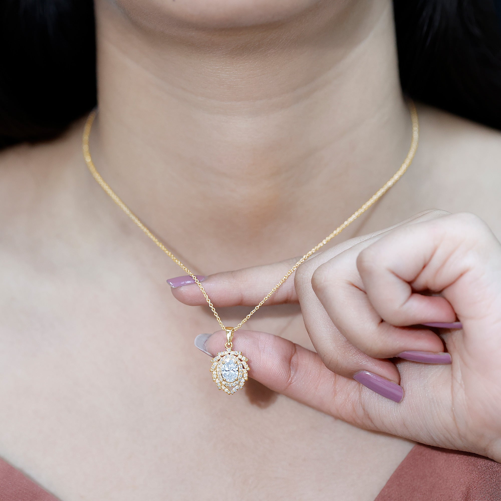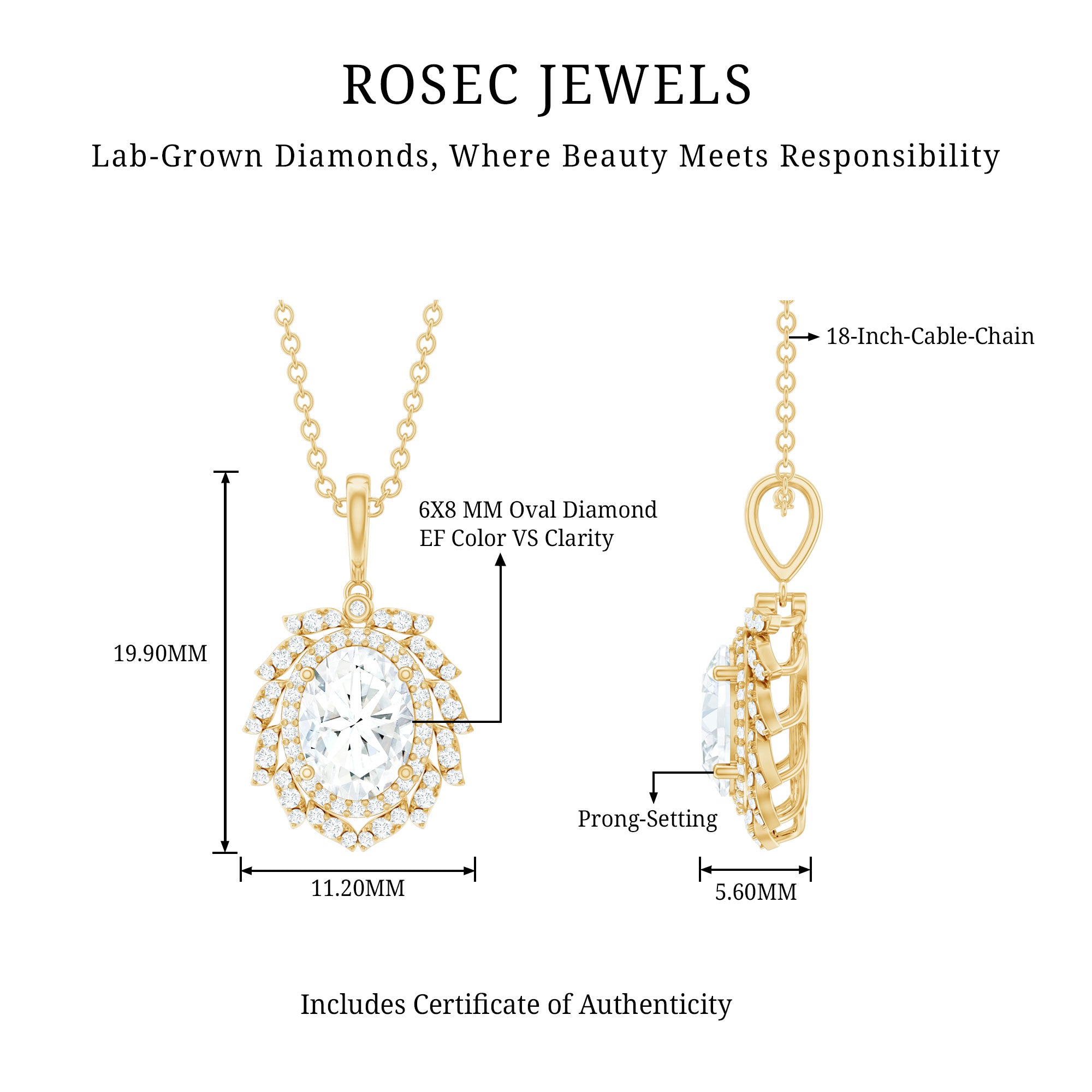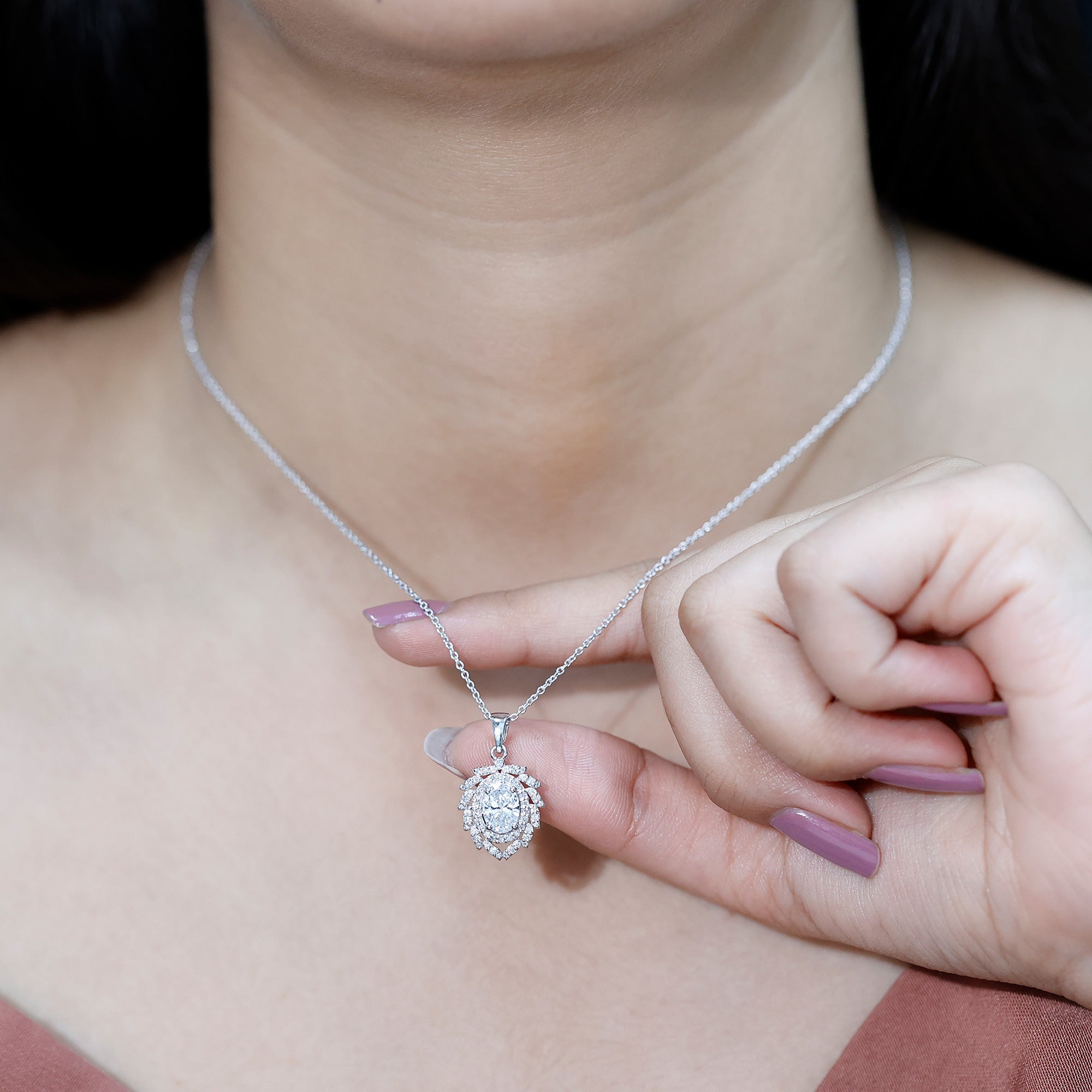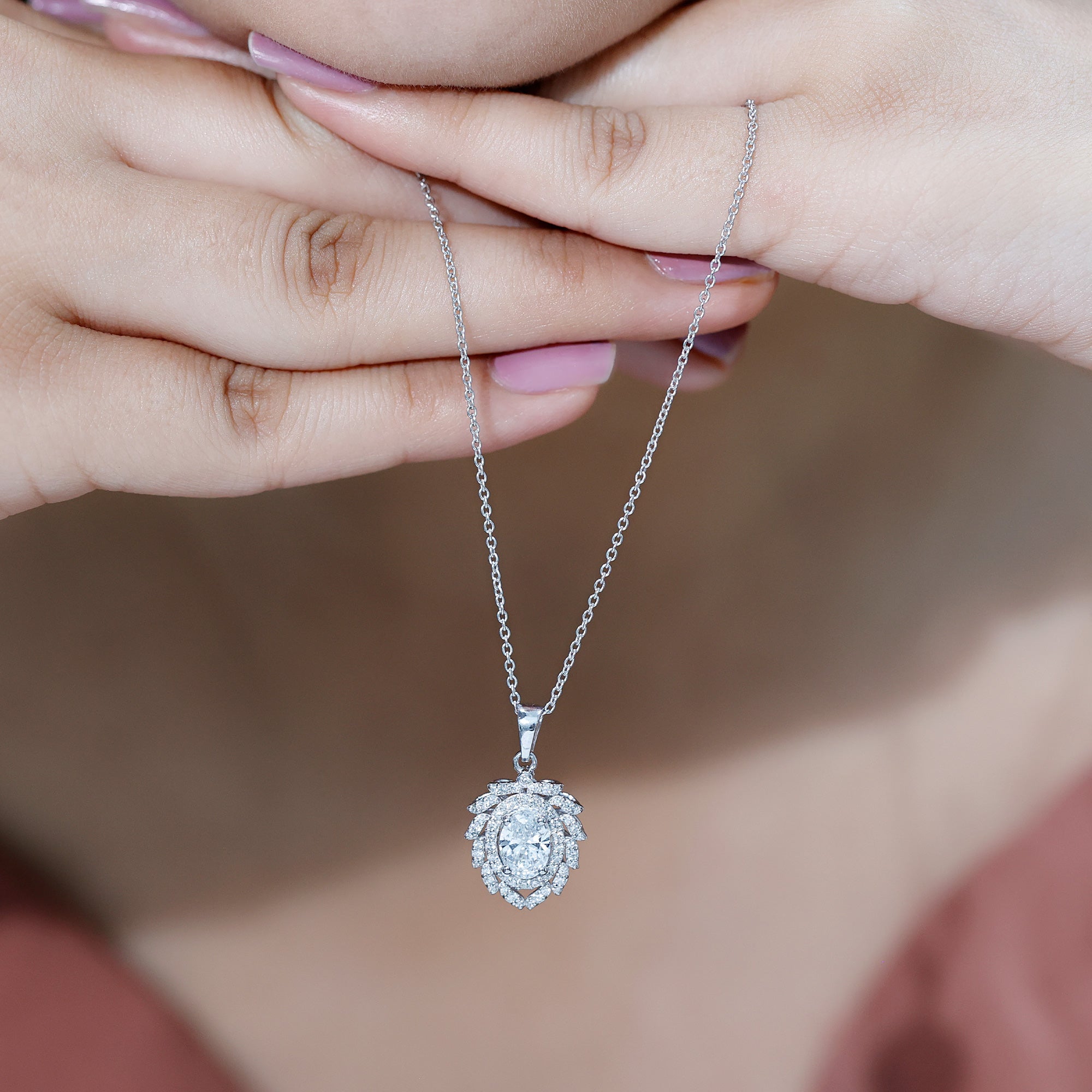 Bold, luxurious, and breathtakingly beautiful, this Diamond Antique Necklace is the ultimate expression of elegance. The centerpiece features a 6X8 MM oval shaped diamond of EF-VS Quality set in secure prong setting, radiating unmatched brilliance. Surrounding it are two diamond halos, the first one is simple, just framing the center stone with its sparkle while the second one resembles a blooming flower with meticulously placed round dainty diamonds over leaf-like metalworks. Each petal-like layer adds depth, sparkle, and grandeur, making this Oval Diamond Pendant Necklace a true showstopper. Hanging from a standard bail that seamlessly blends with the design, this floral Halo Pendant is a classic piece of jewelry.
