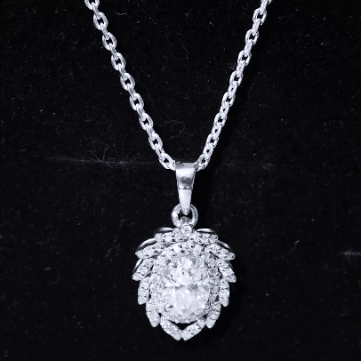 Bold, luxurious, and breathtakingly beautiful, this Diamond Antique Necklace is the ultimate expression of elegance. The centerpiece features a 6X8 MM oval shaped diamond of EF-VS Quality set in secure prong setting, radiating unmatched brilliance. Surrounding it are two diamond halos, the first one is simple, just framing the center stone with its sparkle while the second one resembles a blooming flower with meticulously placed round dainty diamonds over leaf-like metalworks. Each petal-like layer adds depth, sparkle, and grandeur, making this Oval Diamond Pendant Necklace a true showstopper. Hanging from a standard bail that seamlessly blends with the design, this floral Halo Pendant is a classic piece of jewelry.