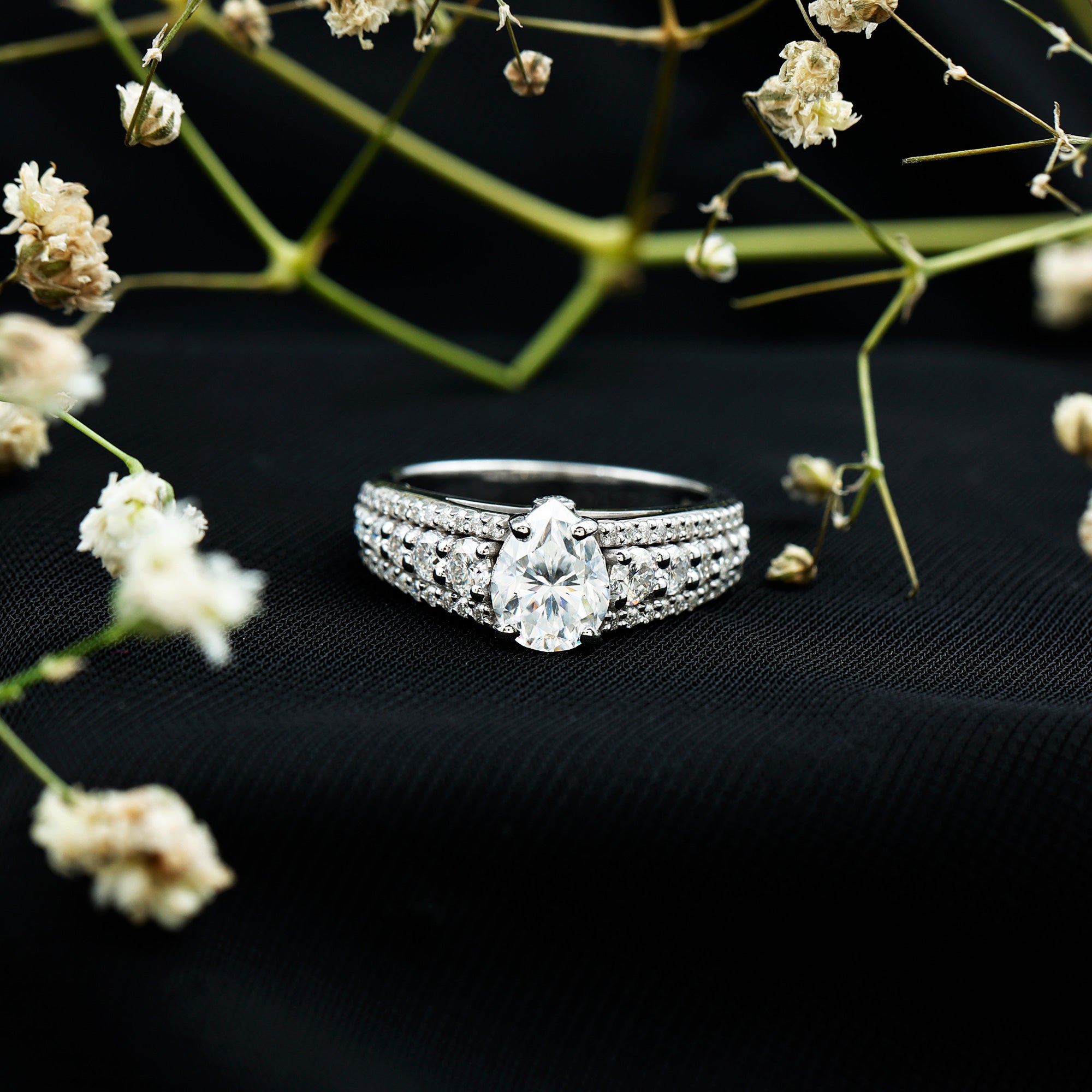 Make a statement of timeless elegance with this Vintage-Inspired Engagement Ring. Celebrate love that transcends time with this stunning 6X8 mm pear cut D-VS1 quality moissanite solitaire engagement ring, designed for the woman who cherishes meaning and brilliance in every moment. This pear shaped moissanite ring, often called a teardrop engagement ring, showcases a breathtaking center stone set in a secure prong setting, exuding sophistication and charm with every glint of light. Flanked by round shape moissanite side stones, the composition is perfectly balanced, making it one of the most exquisite vintage inspired engagement rings for those seeking heirloom aesthetics with a modern twist. Crafted with a target weight that ensures brilliance without compromise, this certified moissanite ring is a radiant symbol of your commitment and promises a lifetime of sparkling memories. Whether youre drawn to moissanite ring for their unmatched fire or the rich history found in antique engagement ring designs, this piece blends both worlds seamlessly. The design speaks of artistry, emotion, and intention—making it the ideal moissanite ring for women who appreciate grace, quality, and craftsmanship. This solitaire teardrop engagement ring isnt just a ring—its a reflection of your journey together, crafted to elevate every occasion from proposals to anniversaries. Perfect for those looking for womens vintage ring styles or a meaningful moissanite engagement ring that stands out, this timeless treasure is a bold declaration of forever