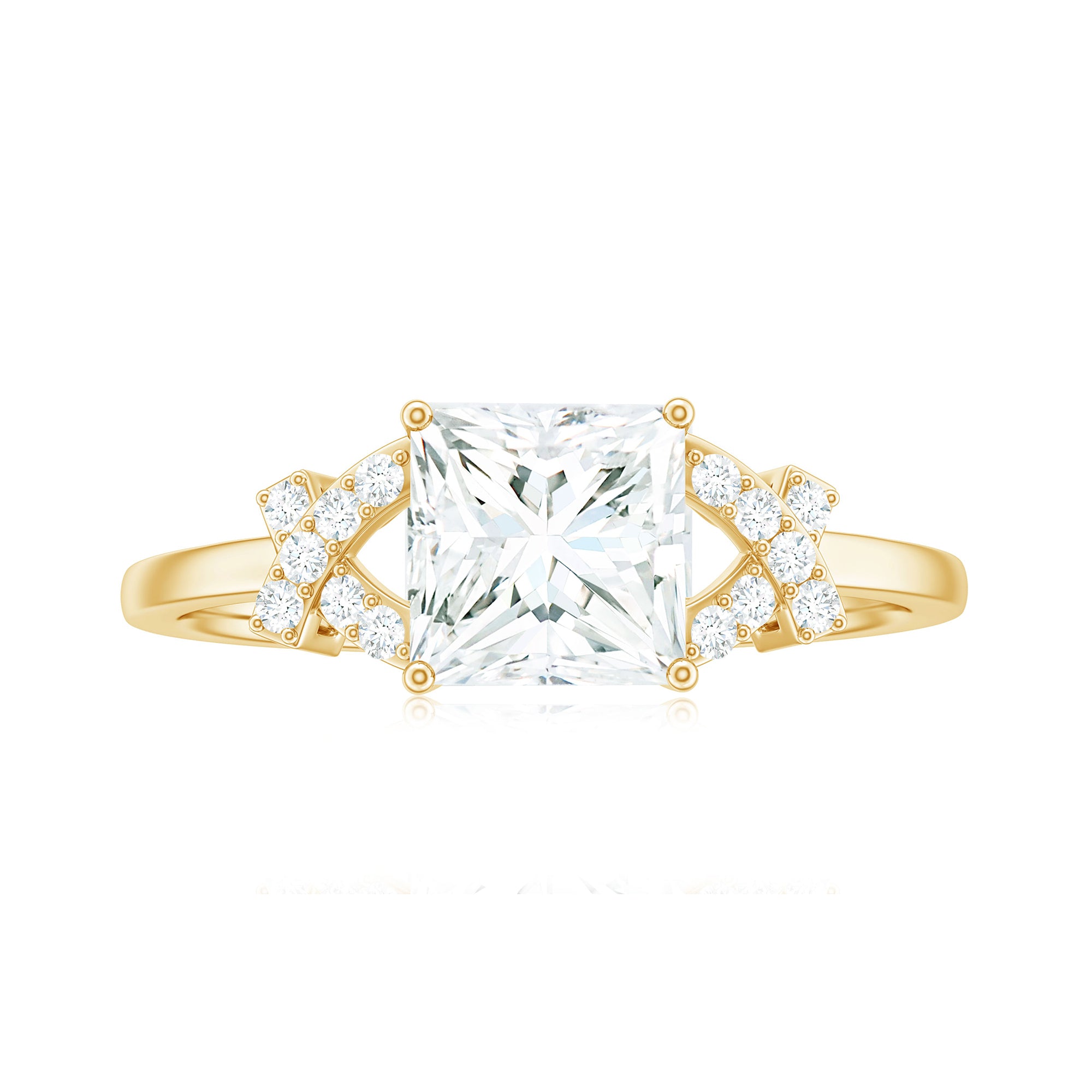 Enchant your beloved with this exquisite Solitaire Engagement Ring, which serves as a symbol of your lasting love and commitment. Beautifully designed, this Fine Engagement Ring showcases a 6X8 MM Princess Cut Moissanite set in a Prong Setting, which is the focal point of the piece. Representing everlasting love and the union of two souls, the enchanting Split Shank is embellished with delicate round Moissanite gemstones set in a cross style, creating a stunning appearance. Meticulously designed with attention to detail, this Princess Engagement Ring can be customized in a variety of precious metals to suit her individual style. Whether you are preparing for a meaningful proposal or commemorating a significant occasion, this Square Engagement Ring is sure to become a treasured memento for many years. Elegant, affordably priced, and ethically sourced, this Princess Cut Moissanite Ring symbolizes lasting commitment, modern romance, and a radiance that is everlasting.