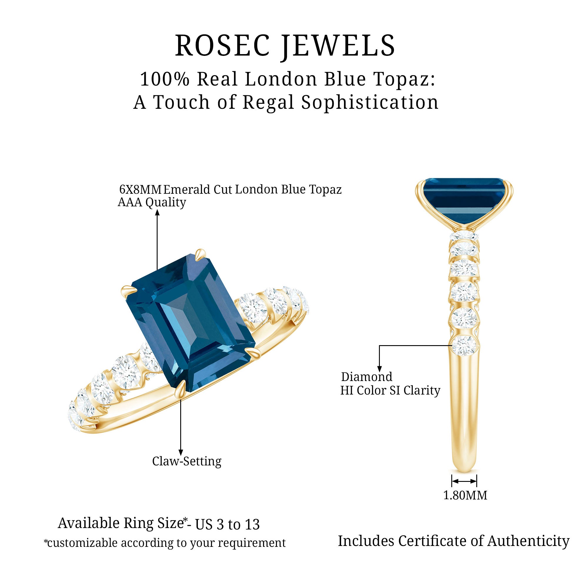 Make your beloved feel cherished with our exquisite London Blue Topaz Engagement Ring on her special day. Its elegant yet simple design beautifully accentuates the central gemstone. This timeless Emerald Cut Engagement Ring features AAA quality London Blue Topaz, ensuring the fire and brilliance that represent love and commitment. At its center lies a 6X8 MM emerald cut London Blue Topaz, enhanced by round shape Diamond side stones. The radiant round cut side stones on the Engagement Ring with Side Stones create a captivating and striking look, reflecting your distinctive style and character. It effortlessly merges traditional beauty with a contemporary twist, providing an elegant appearance that exudes stunning brilliance. This Blue Topaz Solitaire Ring is offered in a range of sizes, guaranteeing a perfect fit that feels tailor-made just for you. Every aspect of this London Blue Topaz Ring for Women exemplifies precision, passion, and a hint of magic that only true craftsmanship can achieve. Let your fingers narrate your story and allow your love to shine with a brilliance as exceptional as your connection.