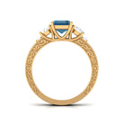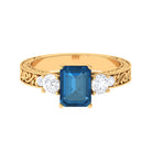 Make your promise of eternity stand out with this Vintage Inspired Ring that combines profound significance with sophisticated design. At the heart of this exquisitely crafted engagement ring lies an 6X8 MM Emerald cut London Blue Topaz, securely set in a prong setting, while sparkling moissanites on either side contribute just the right touch of brilliance. The band features an intricately engraved pattern, reflecting the timeless bond and harmonious unity shared between two souls. Subtle engraved patterns along the band enhance the vintage aesthetic of the piece, infusing it with a layer of old-world charm and artistry. This London Blue Topaz Ring transcends mere beauty; it narrates a story. The juxtaposition of the deep blue color stone against the luminous moissanite embodies strength and harmony, two attributes that characterize a lasting relationship. Crafted with meticulous care and attention to detail, it is ideal for someone who values meaningful design and timeless elegance. Whether you are embarking on your journey together or celebrating a significant milestone, this Engraved Engagement Ring serves as a lasting emblem of your love and commitment.