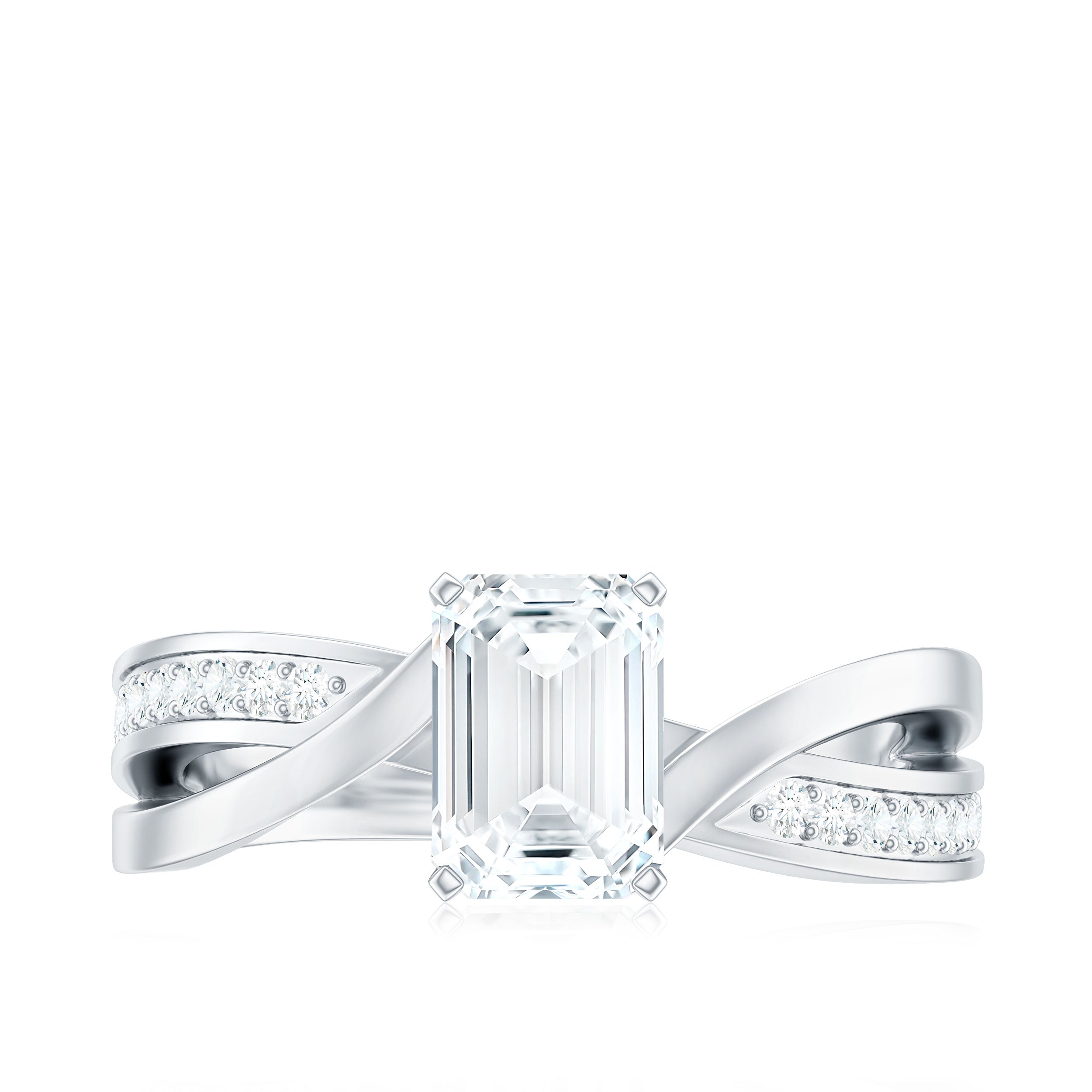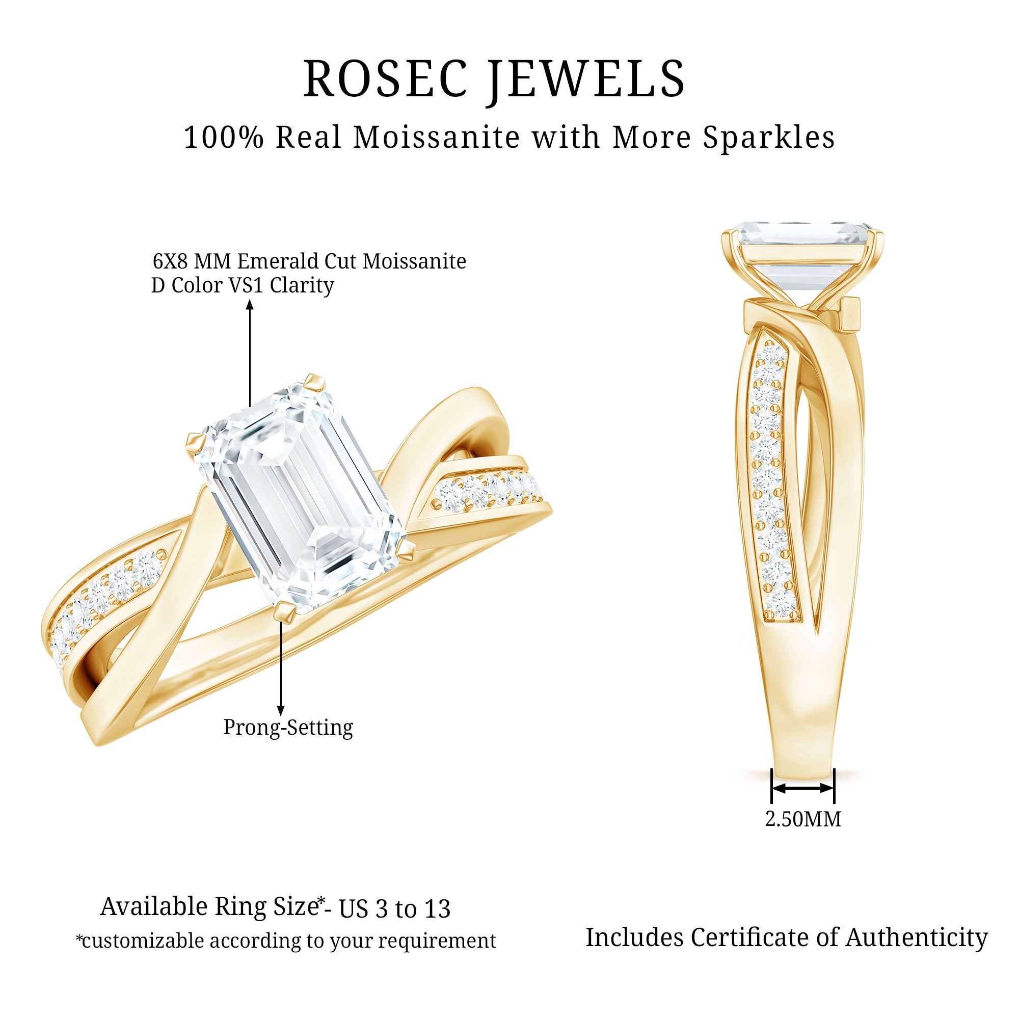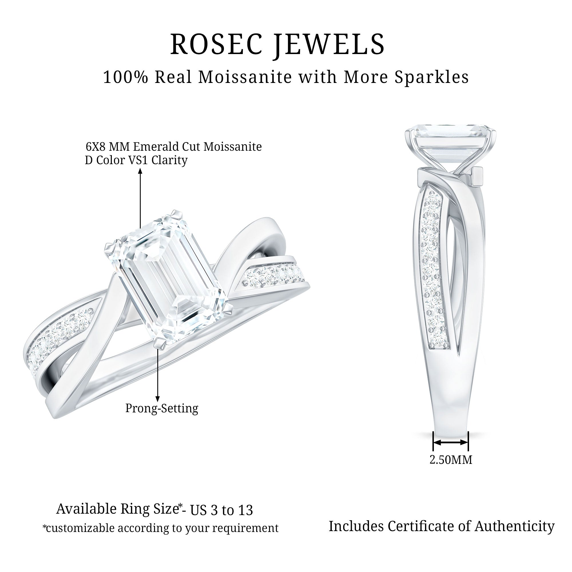 Give her a ring she will love forever! This Infinity Engagement Ring is the one she will admire her whole life, featuring 6X8 mm emerald cut Moissanite set at the center in a prong setting with tiny round Moissanites set on the criss cross style shank in a bypass pattern. The centre stone is set in an elevation from the shank to grab more light and eyes in the crowd. Expertly handcrafted, this piece features a twisted solitaire engagement ring design symbolizing a robust connection. 2 carat moissanite ring with D color VS1 clarity would beautifully accentuate your elegance. Available in sizes 3 to 13 (US standard) and presented in a charming, ready-to-gift box, it is an effortless choice for proposals, anniversaries, or unforgettable moments. A shimmer of promise, a touch of grace - this Emerald Cut Moissanite Solitaire Ring is more than jewelry; its a symbol of the bond youll cherish forever.