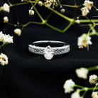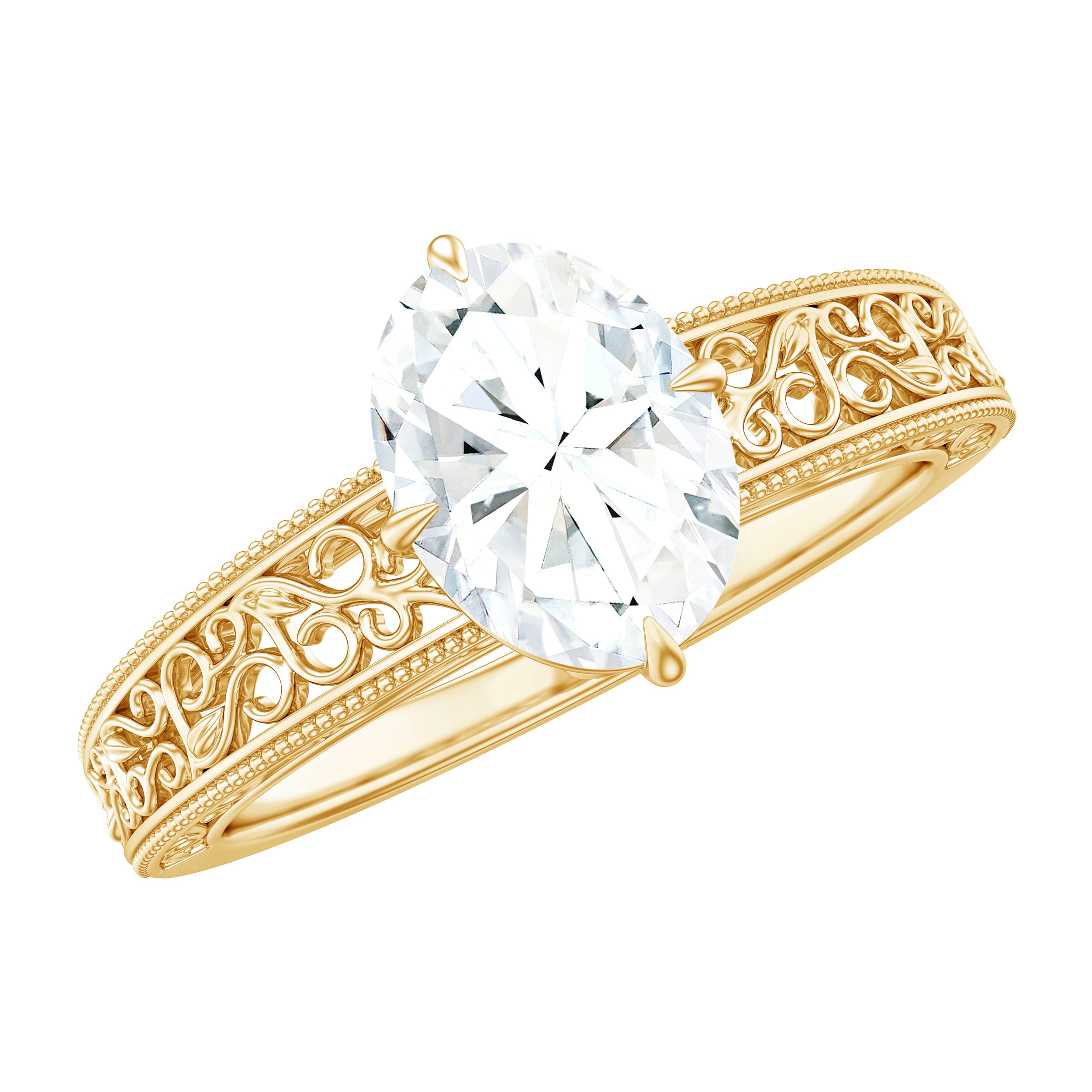 This Moissanite Solitaire Ring resembles a gem from yesteryears, narrating a story of eternal love and beauty. With a design inspired by vintage aesthetics, this Solitaire Engagement Ring blends classic features with a modern touch, making it perfect for those who value a hint of old-world sophistication in their jewelry. At its core is a 6X8 MM oval cut moissanite, gracefully set in a claw setting. The stone boasts D color and VS1 clarity, delivering remarkable brilliance that draws attention with every movement. This Oval Cut Engagement Ring highlights a beautifully crafted filigree band embellished with intricate swirls and delicate leaf-like designs that wrap around the shank, enhancing its vintage charm. Beaded details along the edge contribute texture and depth, imparting a soft, romantic feel to the ring. This Vintage Moissanite Ring is lightweight and comfortable for everyday wear, yet retains a special quality for significant occasions. Whether you are looking for a Vintage Style Engagement Ring, a heartfelt promise ring, or a significant statement piece, this Antique Filigree Ring merges elegance, sentiment, and timeless allure that will always be in vogue.